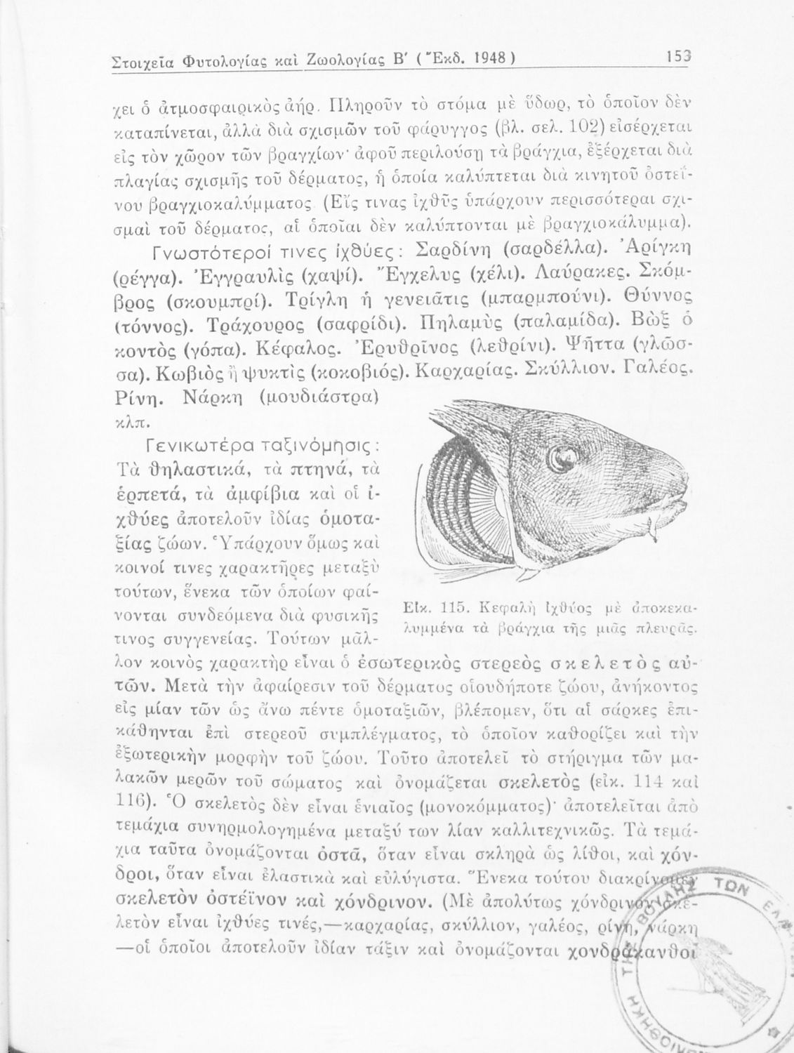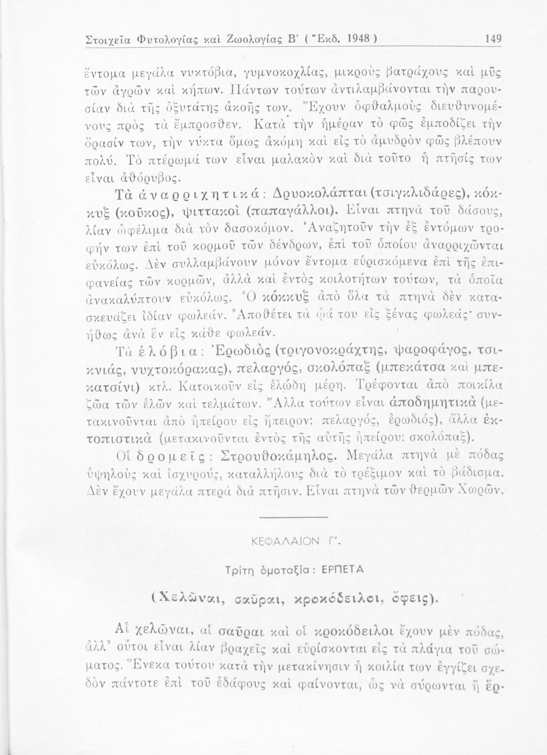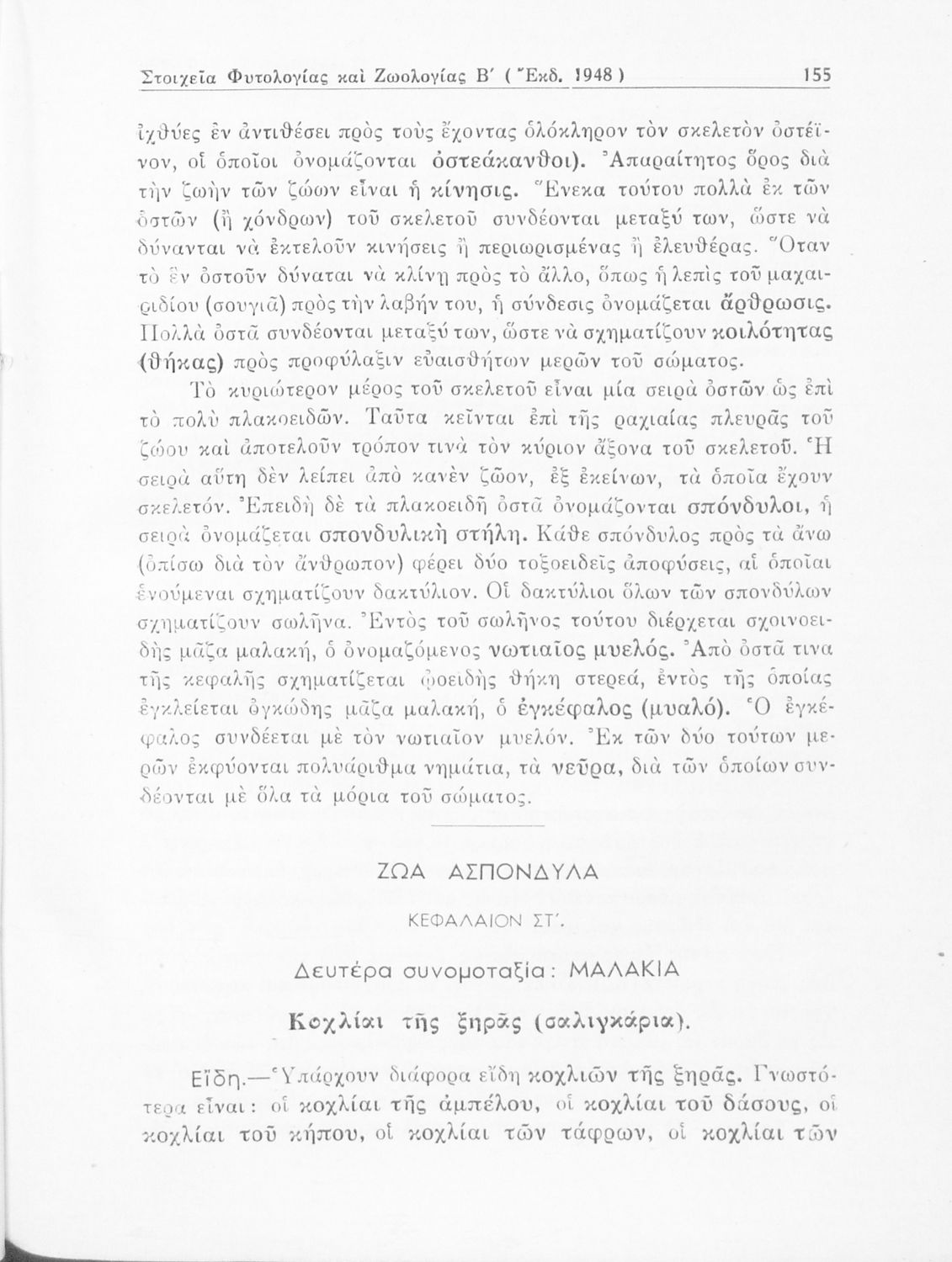Σχολικό εγχειρίδιο Ζωολογίας/Φυτολογίας για τα Γυμνάσια και Αστικά Σχολεία που παρουσιάζει διάφορα ζώα και φυτά ανάλογα με τη συνομοταξία στην οποία ανήκουν.
