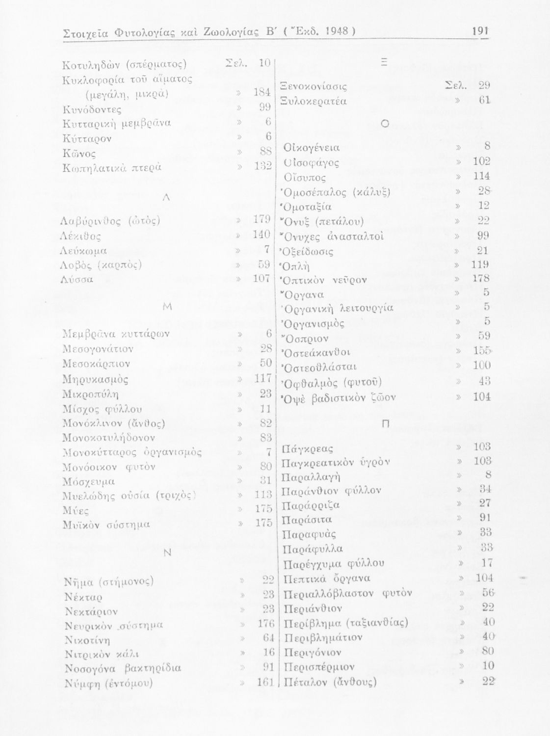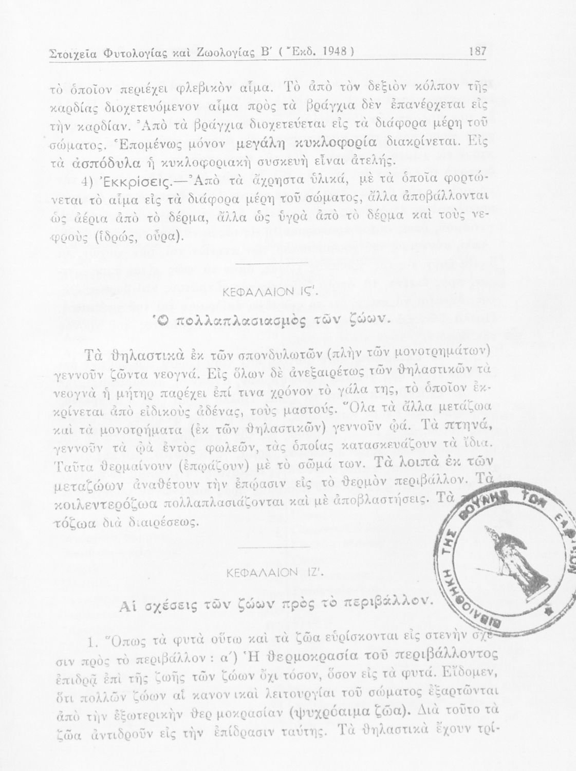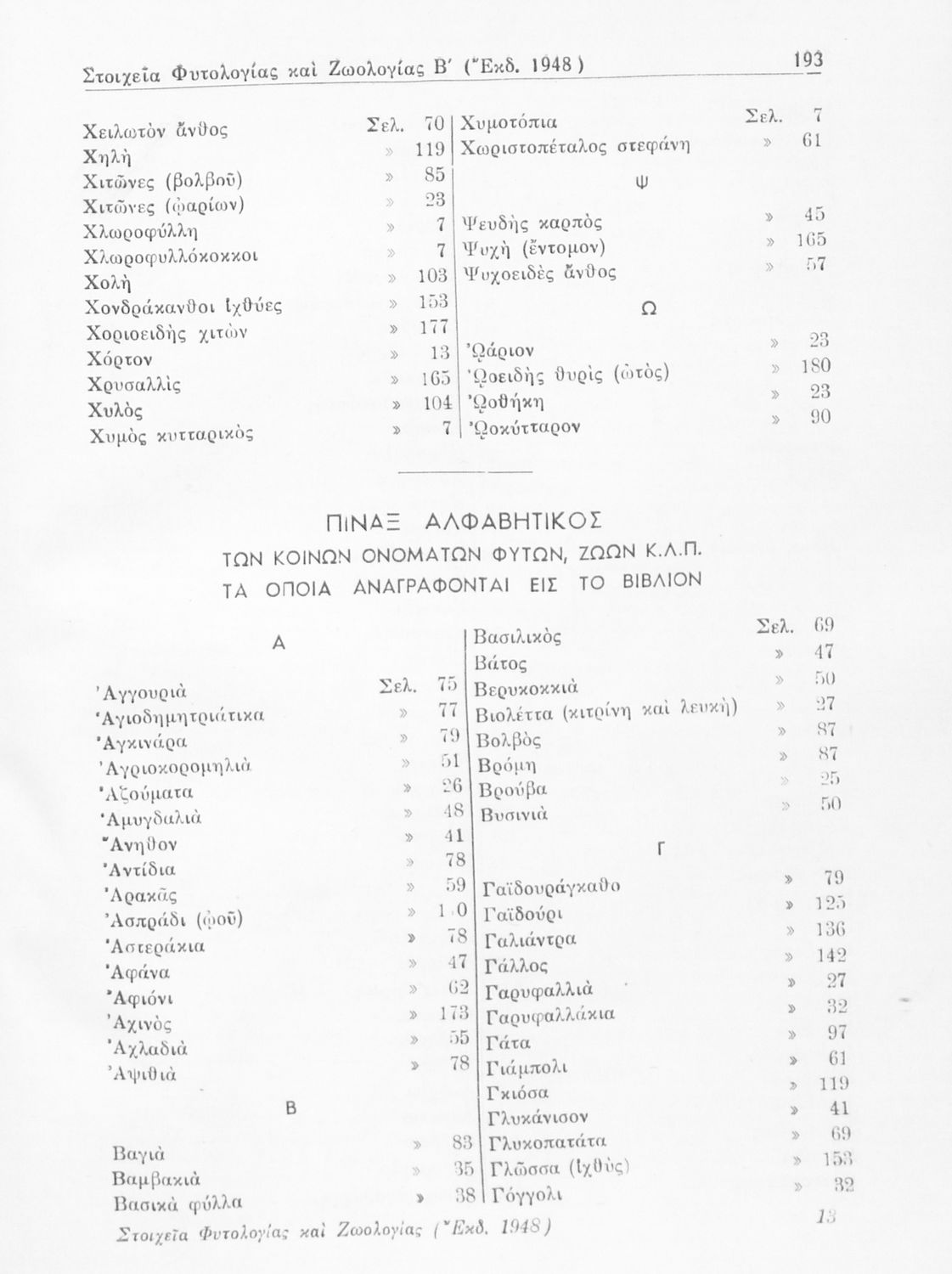 Σχολικό εγχειρίδιο Φυτολογίας - Ζωολογίας για τους μαθητές της Β' Τάξης Γυμνασίου, και της Α' Τάξης Αστικών Σχολείων. Περιέχει μια εισαγωγή της Φυτολογίας και της Ζωολογίας. Χωρίζεται σε δύο μέρη. Στο πρώτο μέρος παρουσιάζει μια επισκόπηση των διαφορετικών φυτών όπως είναι τα σπερματόφυτα και τα σποριόφυτα. Στο δεύτερο παρουσιάζει τα διαφορετικά είδη των ζώων τα θηλαστικά, τα μαλάκια, τα πτηνά και τα ερπετά.
