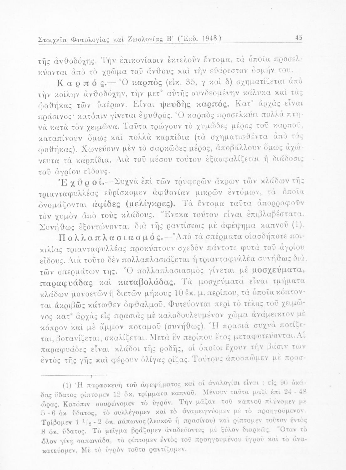 Σχολικό εγχειρίδιο Φυτολογίας - Ζωολογίας για τους μαθητές της Β' Τάξης Γυμνασίου, και της Α' Τάξης Αστικών Σχολείων. Περιέχει μια εισαγωγή της Φυτολογίας και της Ζωολογίας. Χωρίζεται σε δύο μέρη. Στο πρώτο μέρος παρουσιάζει μια επισκόπηση των διαφορετικών φυτών όπως είναι τα σπερματόφυτα και τα σποριόφυτα. Στο δεύτερο παρουσιάζει τα διαφορετικά είδη των ζώων τα θηλαστικά, τα μαλάκια, τα πτηνά και τα ερπετά.