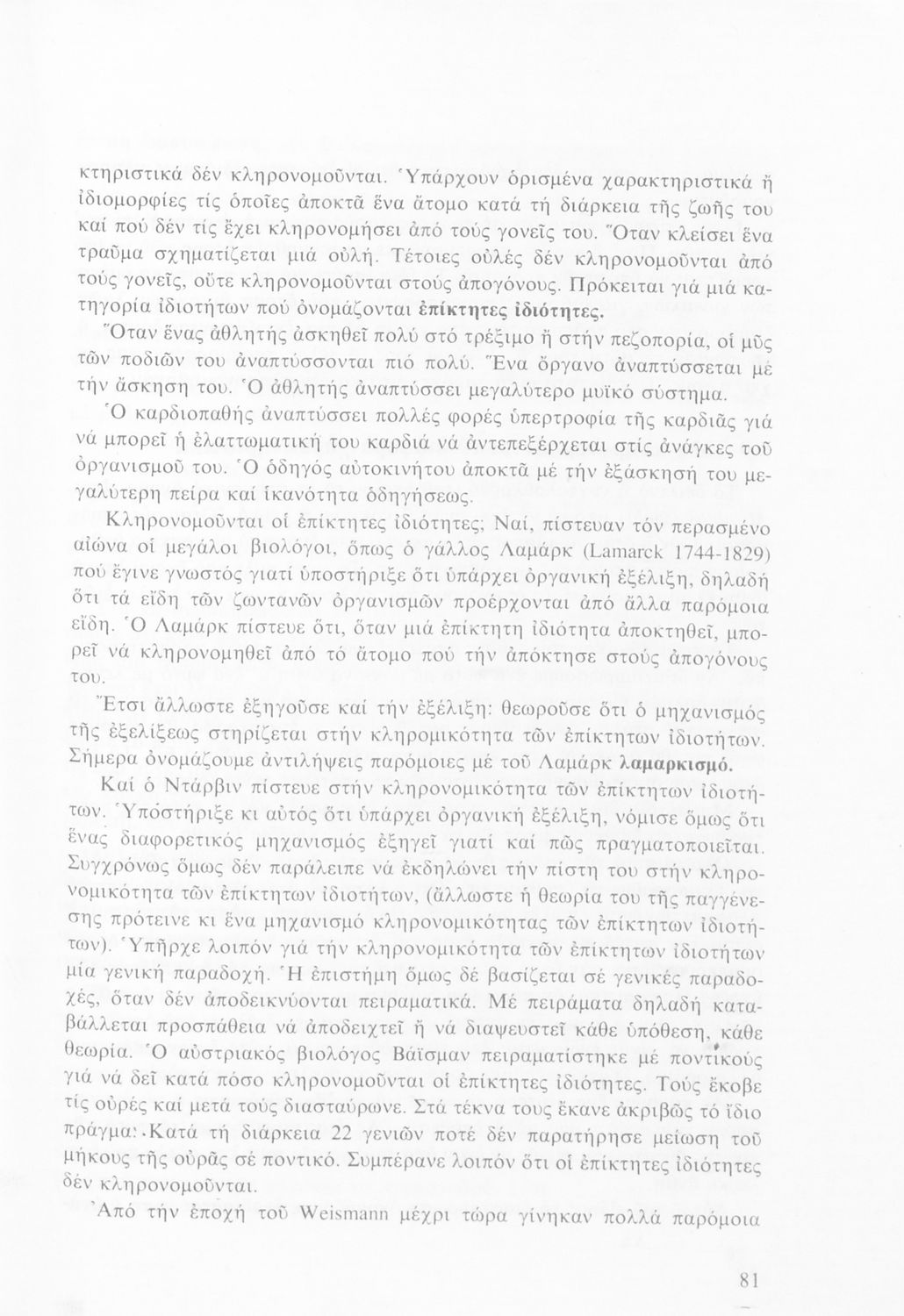 Σχολικό εγχειρίδιο Βιολογίας Γ΄ Γυμνασίου που εστιάζει στις συνθήκες γέννησης, μεταβολής και θανάτου των έμβιων οργανισμών. Φέρει το σύμβολο της δικτατορίας.