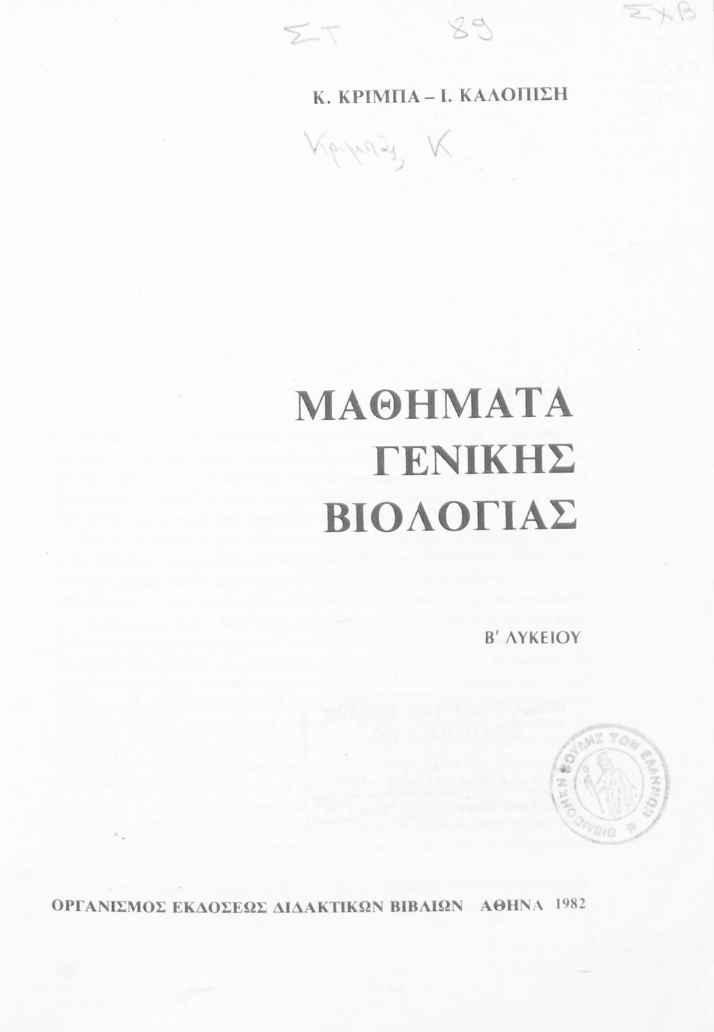 Κωδικός αναγνώρισης: 03-20557997 Τίτλος: Μαθήματα Γενικής Βιολογίας Β' Λυκείου Συγγραφέας: Κ. Κριμπάς, Ι. Καλοπίσης Μέγεθος και υπόστρωμα: Σχολικό εγχειρίδιο, μαλακό εξώφυλλο, 272 σελίδες. Εικόνες, σκίτσα (έγχρωμα). |