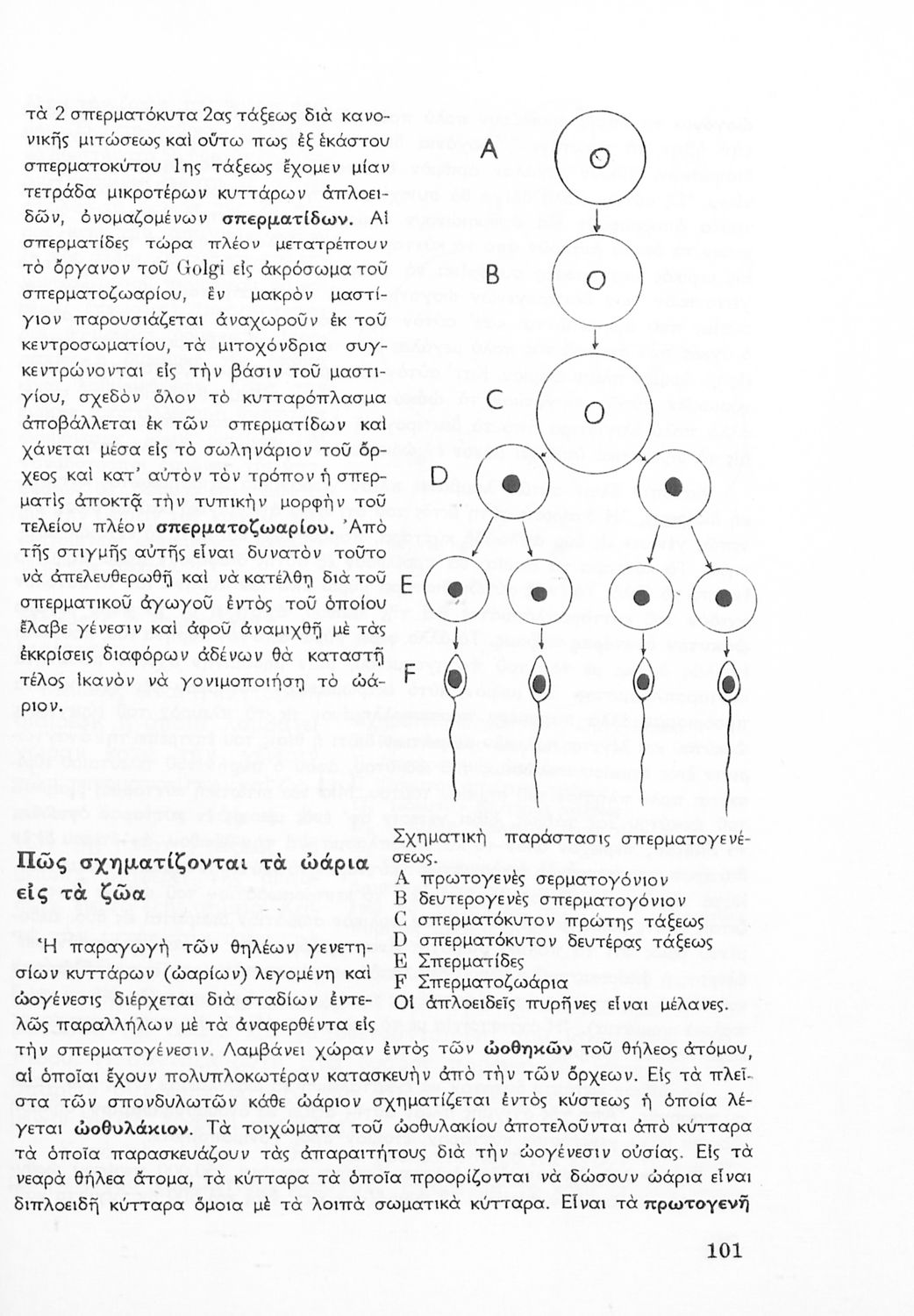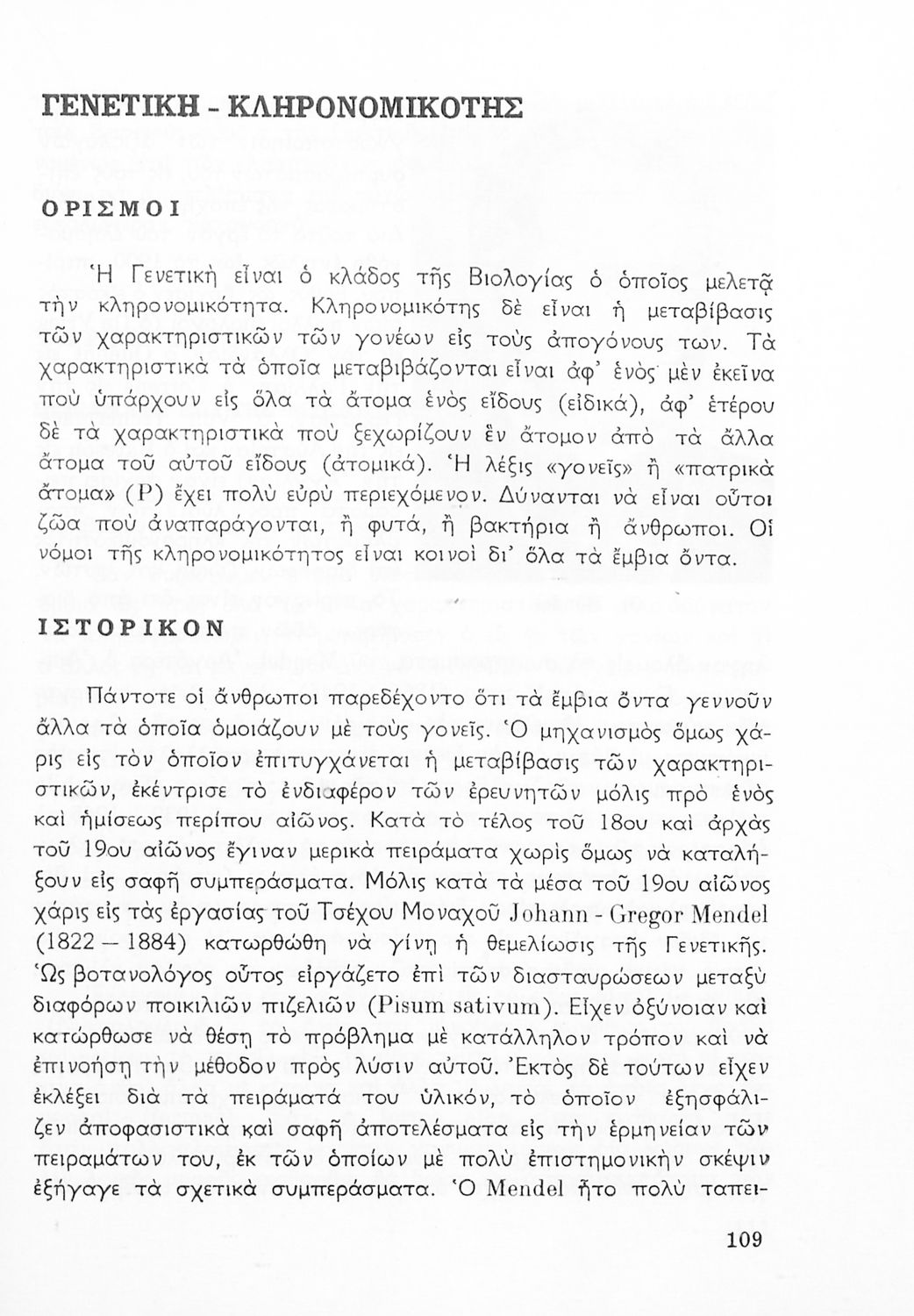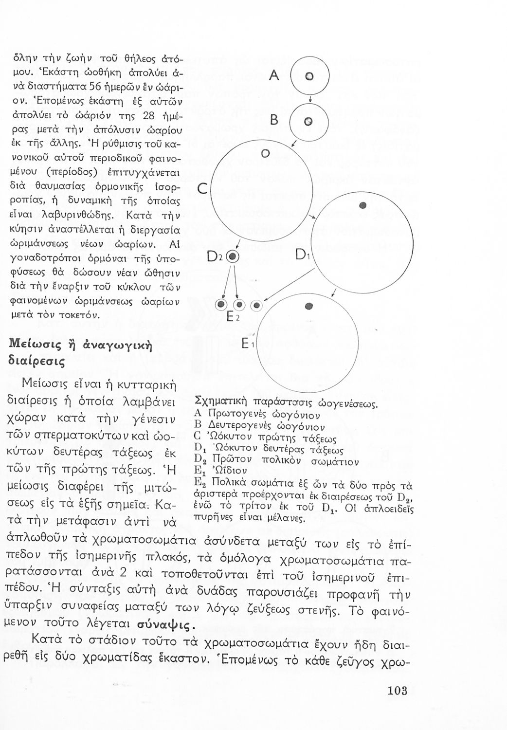 Σχολικό εγχειρίδιο Βιολογίας ΣΤ΄ Γυμνασίου που εστιάζει στις συνθήκες γέννησης, μεταβολής και θανάτου των έμβιων οργανισμών. Φέρει το σύμβολο της δικτατορίας. Ο συγγραφέας ήταν υφηγητής του Πανεπιστημίου Αθηνών.