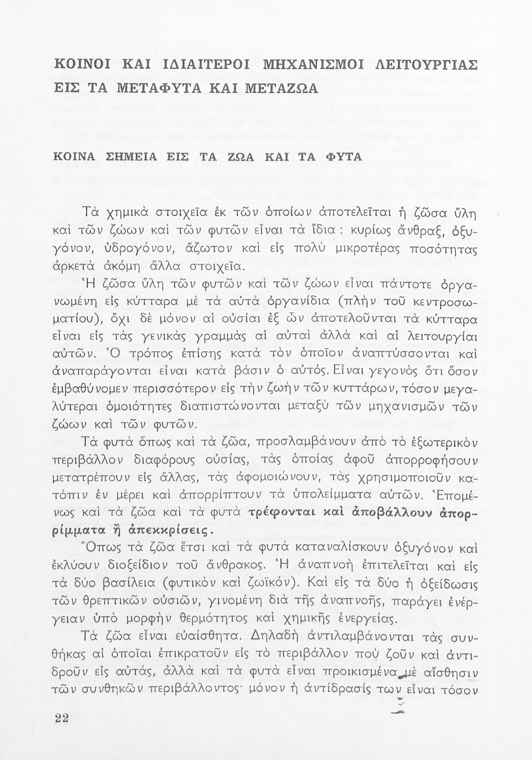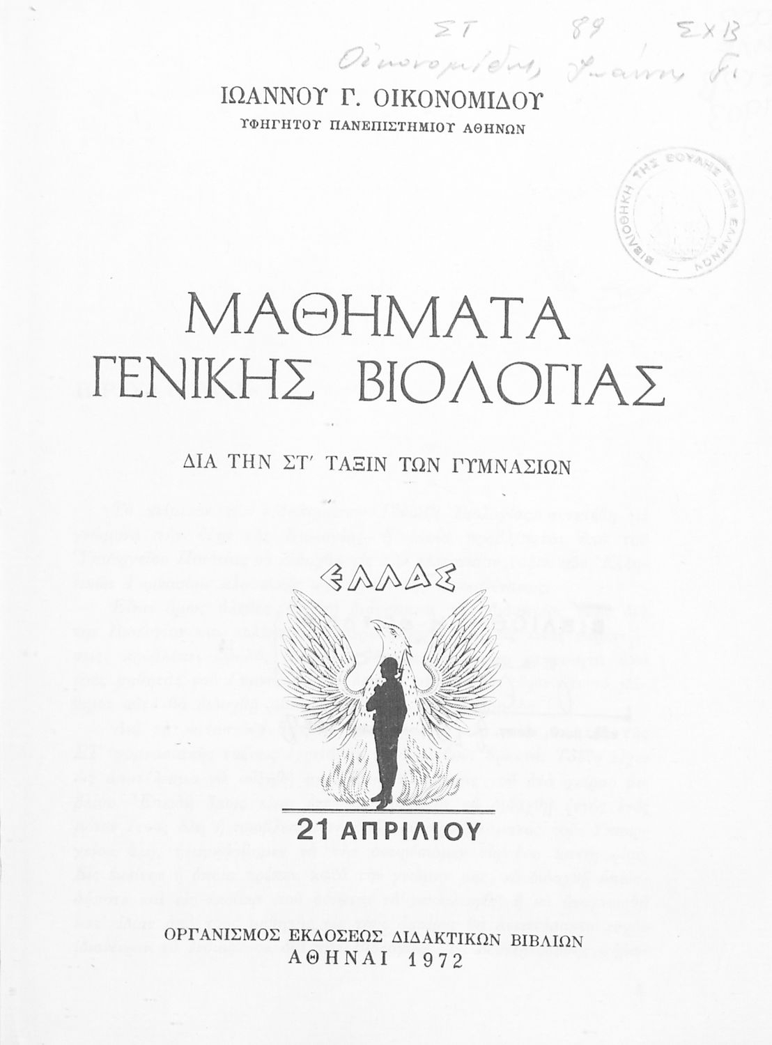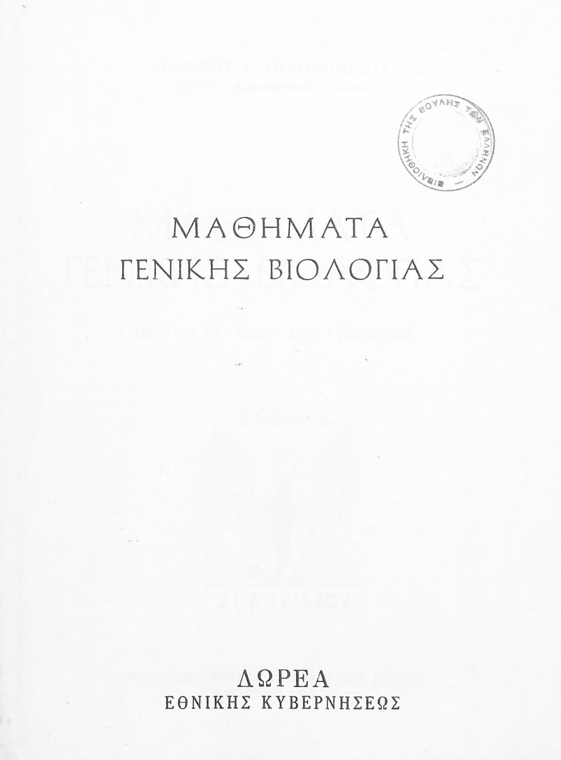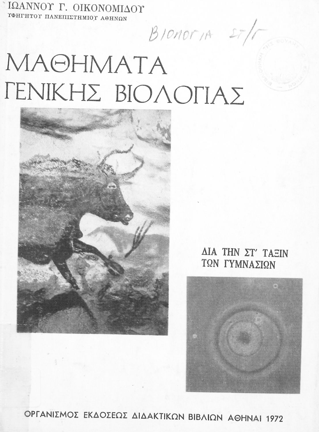 Σχολικό εγχειρίδιο Βιολογίας ΣΤ΄ Γυμνασίου που εστιάζει στις συνθήκες γέννησης, μεταβολής και θανάτου των έμβιων οργανισμών. Φέρει το σύμβολο της δικτατορίας. Ο συγγραφέας ήταν υφηγητής του Πανεπιστημίου Αθηνών.
