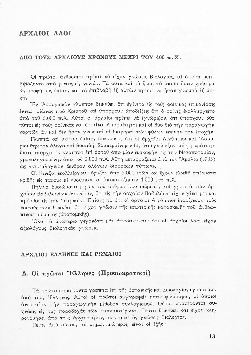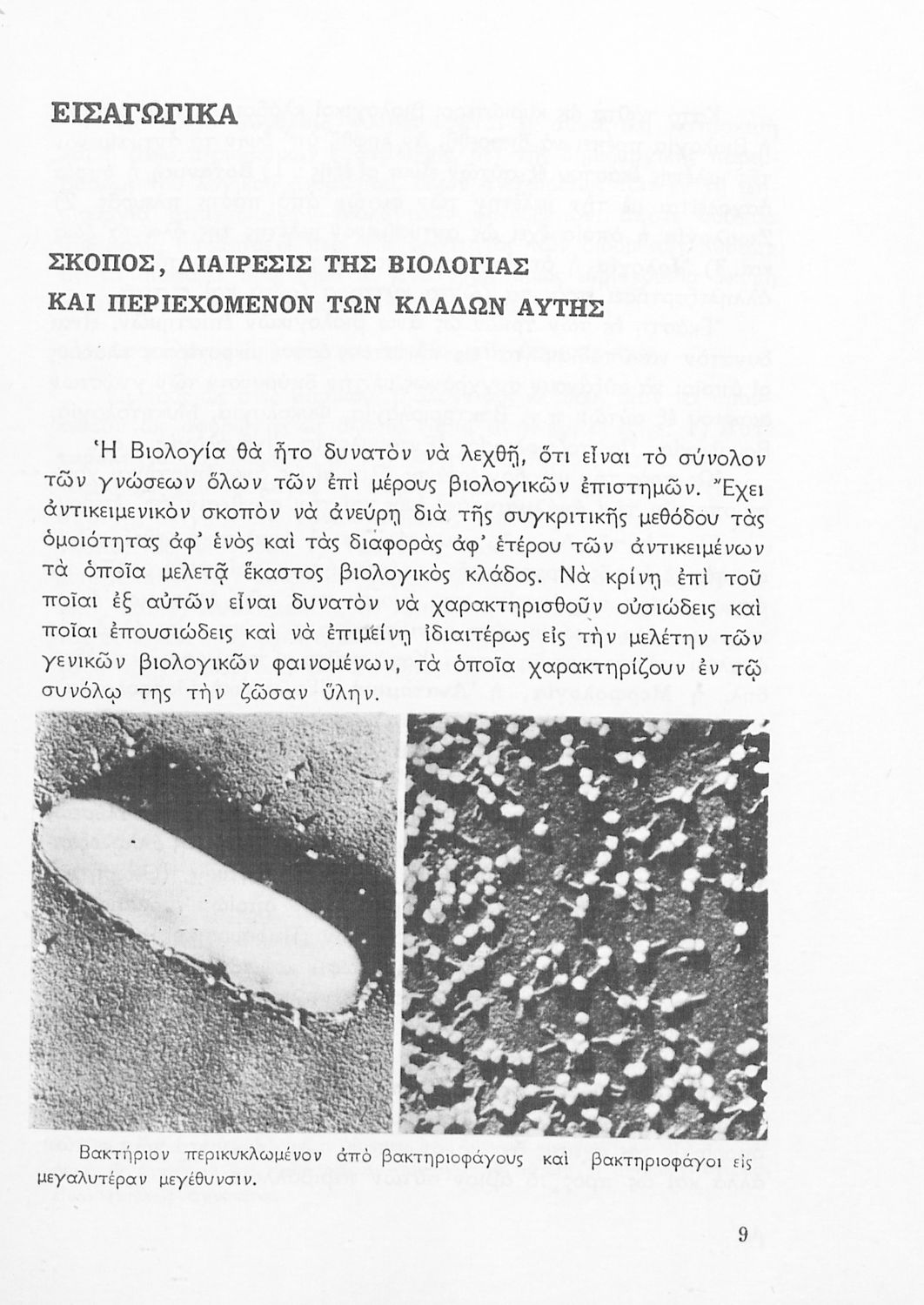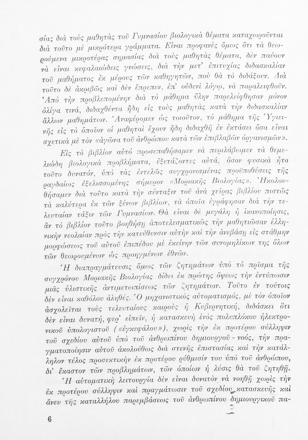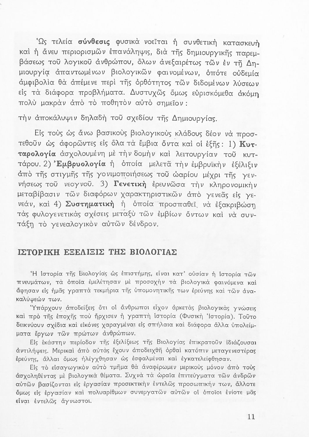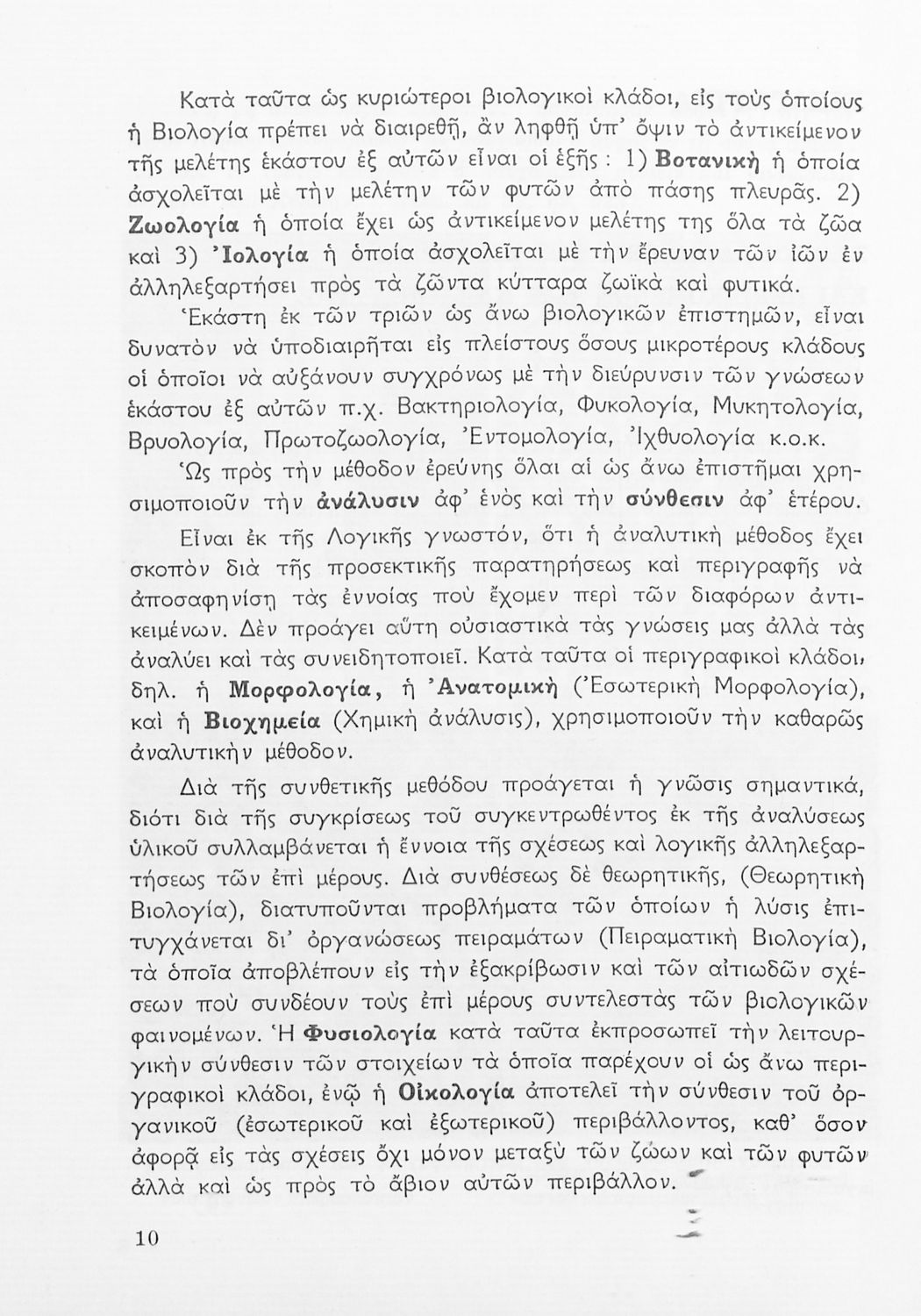 Σχολικό εγχειρίδιο Βιολογίας ΣΤ΄ Γυμνασίου που εστιάζει στις συνθήκες γέννησης, μεταβολής και θανάτου των έμβιων οργανισμών. Φέρει το σύμβολο της δικτατορίας. Ο συγγραφέας ήταν υφηγητής του Πανεπιστημίου Αθηνών.