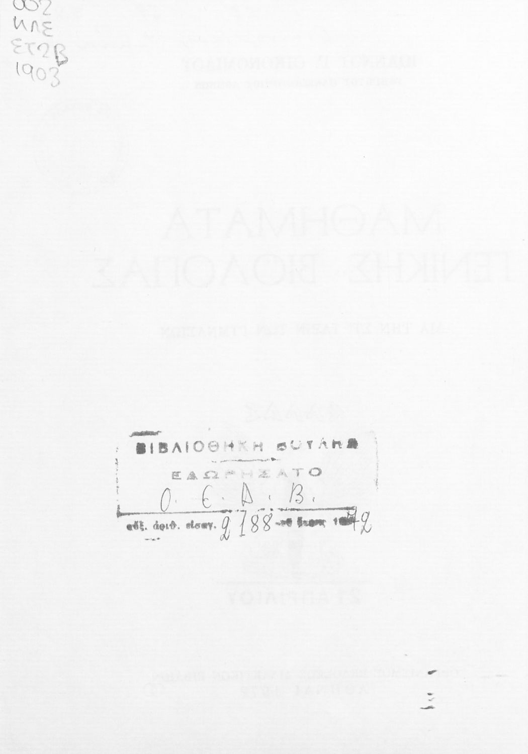 Βαθμίδα εκπαίδευσης: Δευτεροβάθμια Τάξη: ΣΤ' Γυμνασίου Μάθημα: Βιολογία Γλώσσα: Απλή καθαρεύουσα Παρουσίαση περιεχομένου: Σχολικό εγχειρίδιο Βιολογίας ΣΤ΄ Γυμνασίου που εστιάζει στις συνθήκες γέννησης, μεταβολής και θανάτου των έμβιων οργανισμών. Φέρει το σύμβολο της δικτατορίας. Ο συγγραφέας ήταν υφηγητής του Πανεπιστημίου Αθηνών. |
