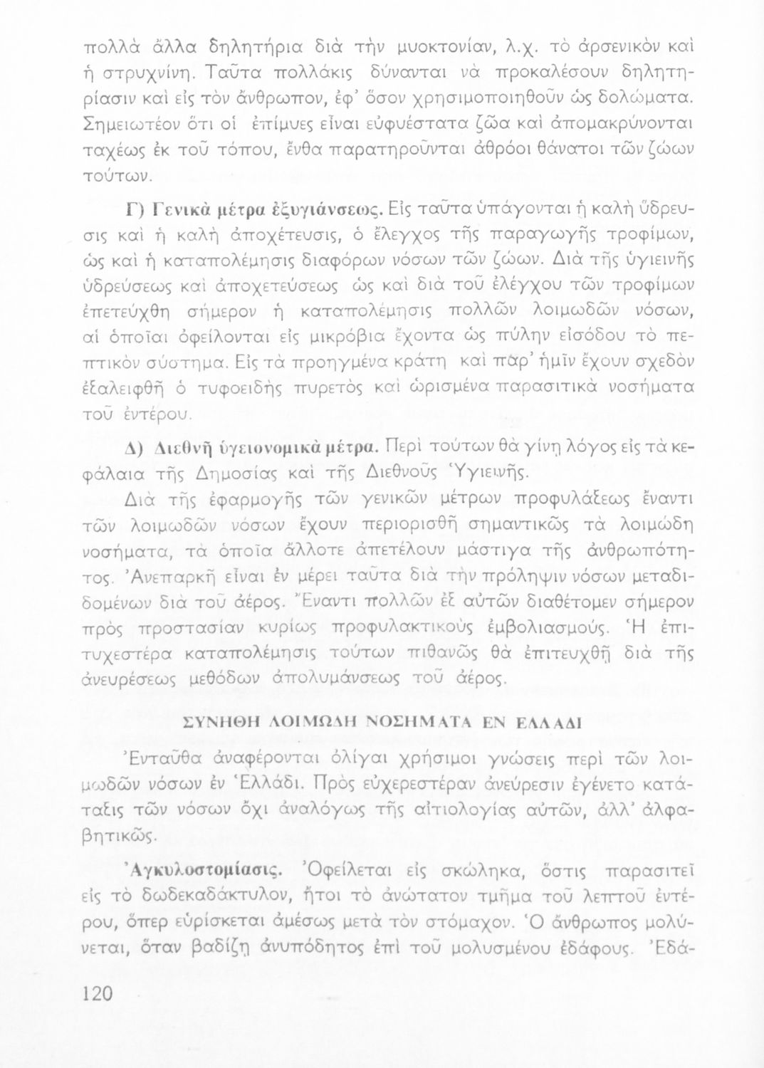 Σχολικό εγχειρίδιο Υγιεινής για τους μαθητές της Ε' τάξης του Γυμνασίου. Το βιβλίο αναφέρεται στις συνθήκες και τις αιτίες που επηρεάζουν την υγεία του ατόμου ή μιας ομάδας ατόμων και παρουσιάζει τα μέτρα που πρέπει να ληφθούν για την ανάκτηση και διατήρηση της υγιεινής των ανθρώπων. Πιο συγκεκριμένα αναφέρεται στην επίδραση της ατμόσφαιρας, του νερού, των λοιμωδών νοσημάτων αλλά και της κληρονομικότητας.