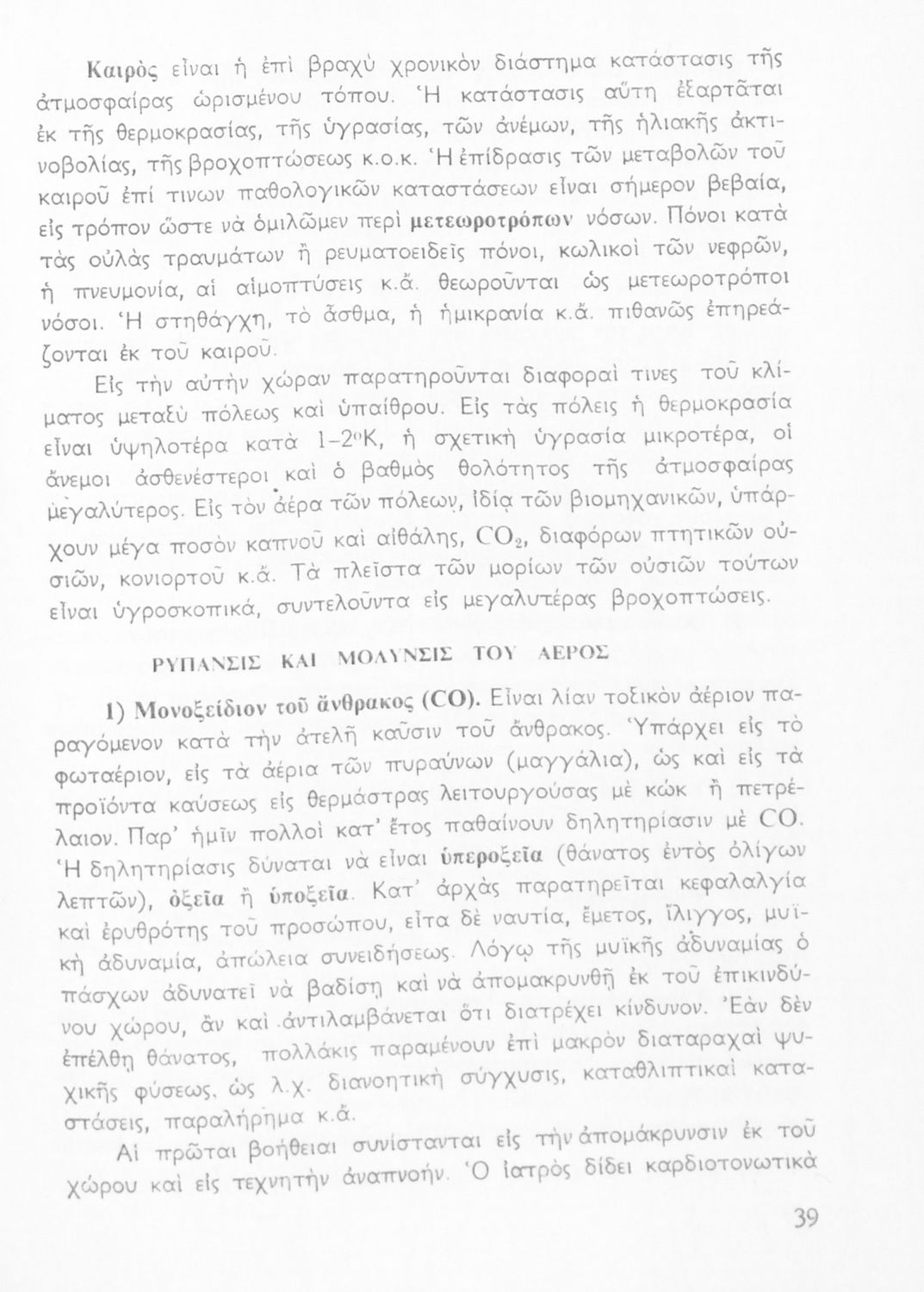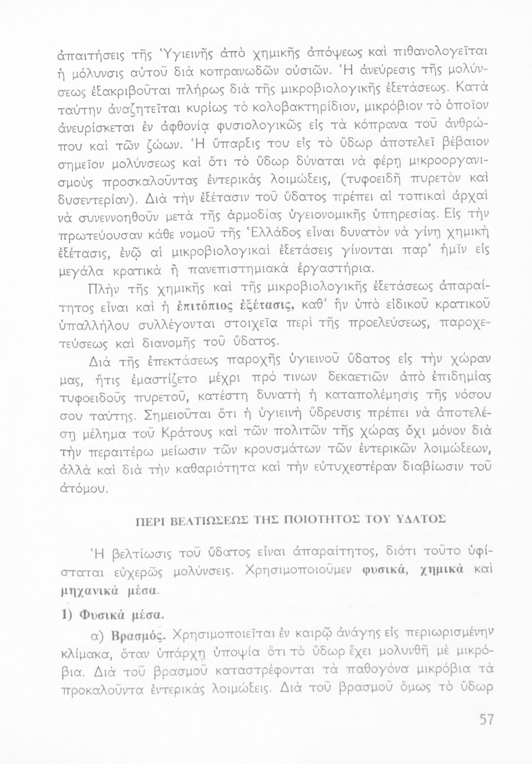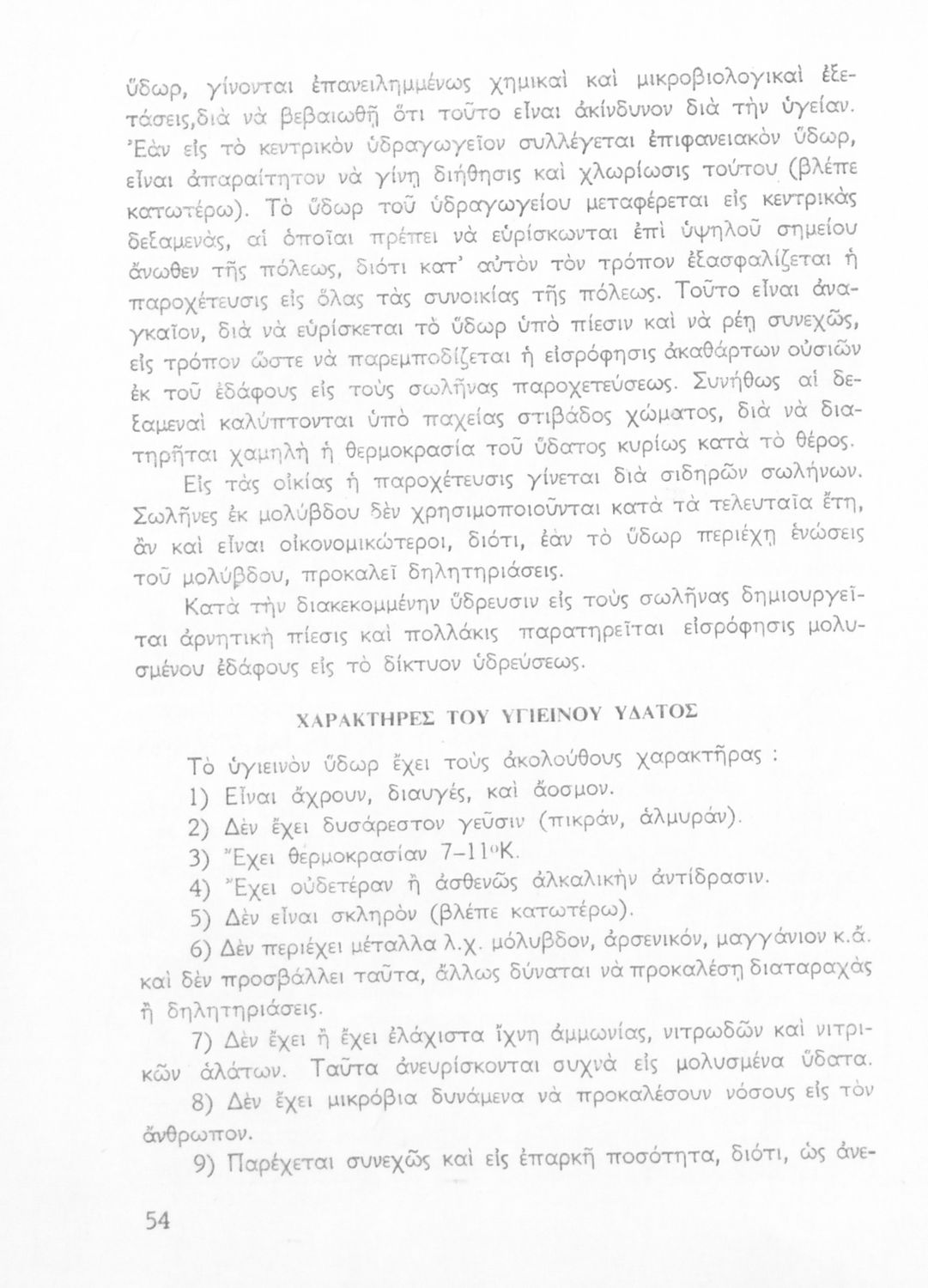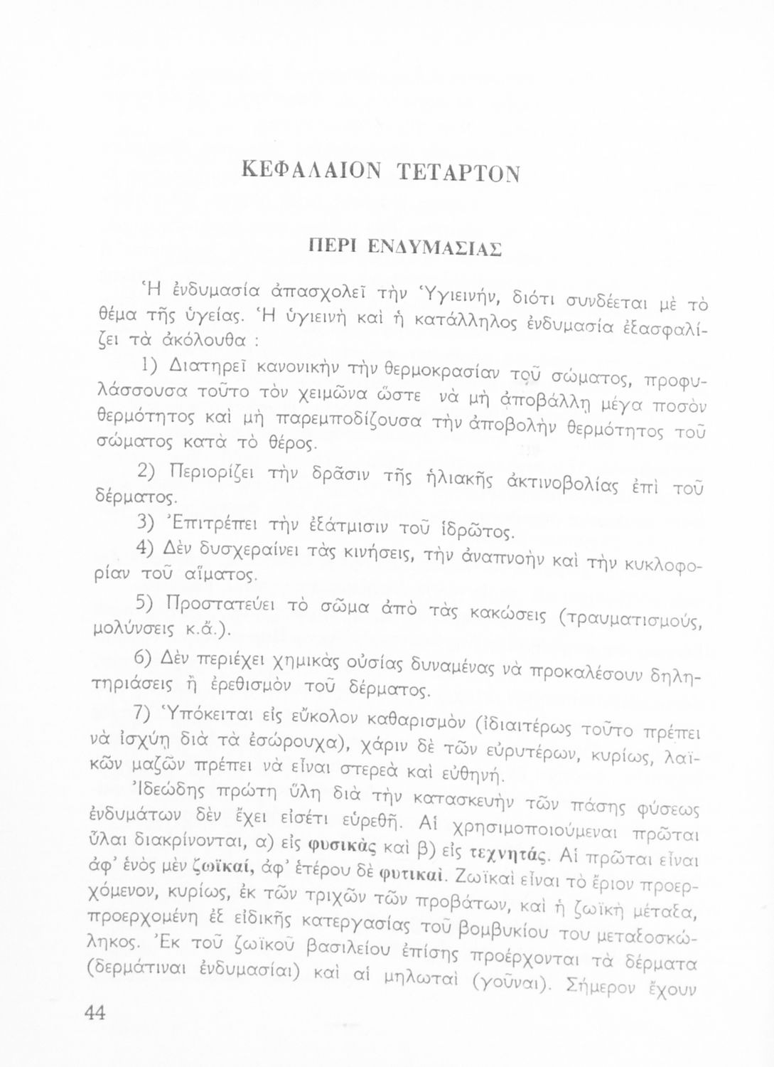 Σχολικό εγχειρίδιο Υγιεινής για τους μαθητές της Ε' τάξης του Γυμνασίου. Το βιβλίο αναφέρεται στις συνθήκες και τις αιτίες που επηρεάζουν την υγεία του ατόμου ή μιας ομάδας ατόμων και παρουσιάζει τα μέτρα που πρέπει να ληφθούν για την ανάκτηση και διατήρηση της υγιεινής των ανθρώπων. Πιο συγκεκριμένα αναφέρεται στην επίδραση της ατμόσφαιρας, του νερού, των λοιμωδών νοσημάτων αλλά και της κληρονομικότητας.