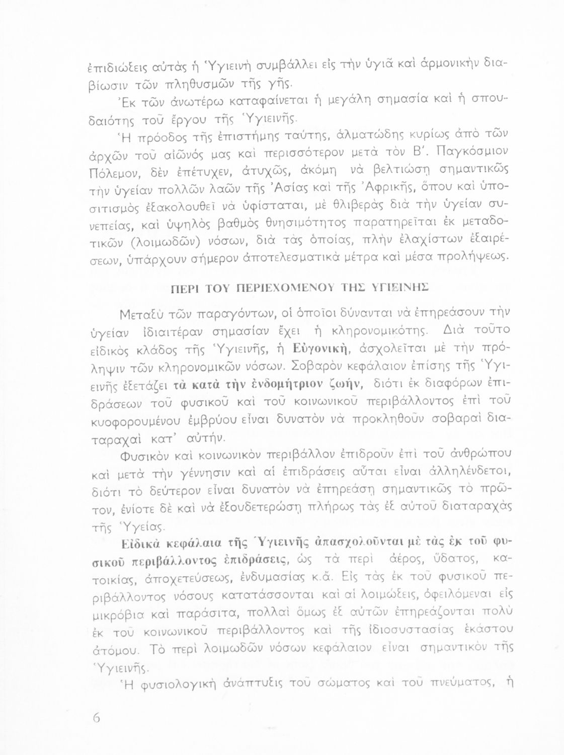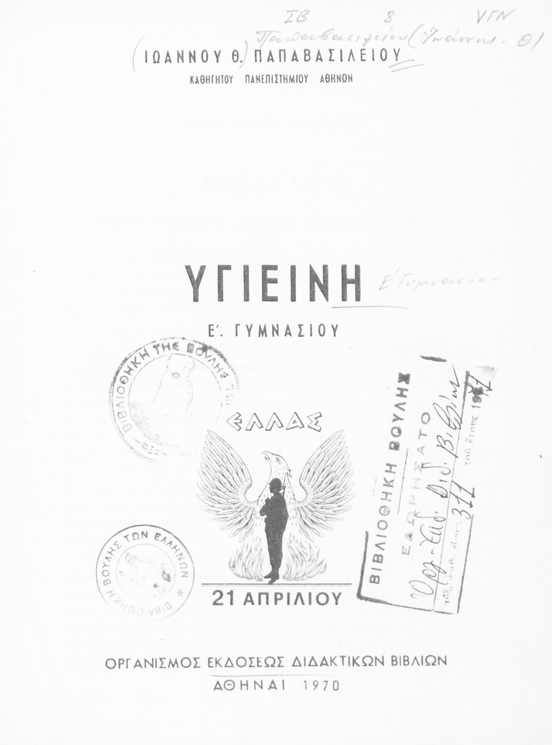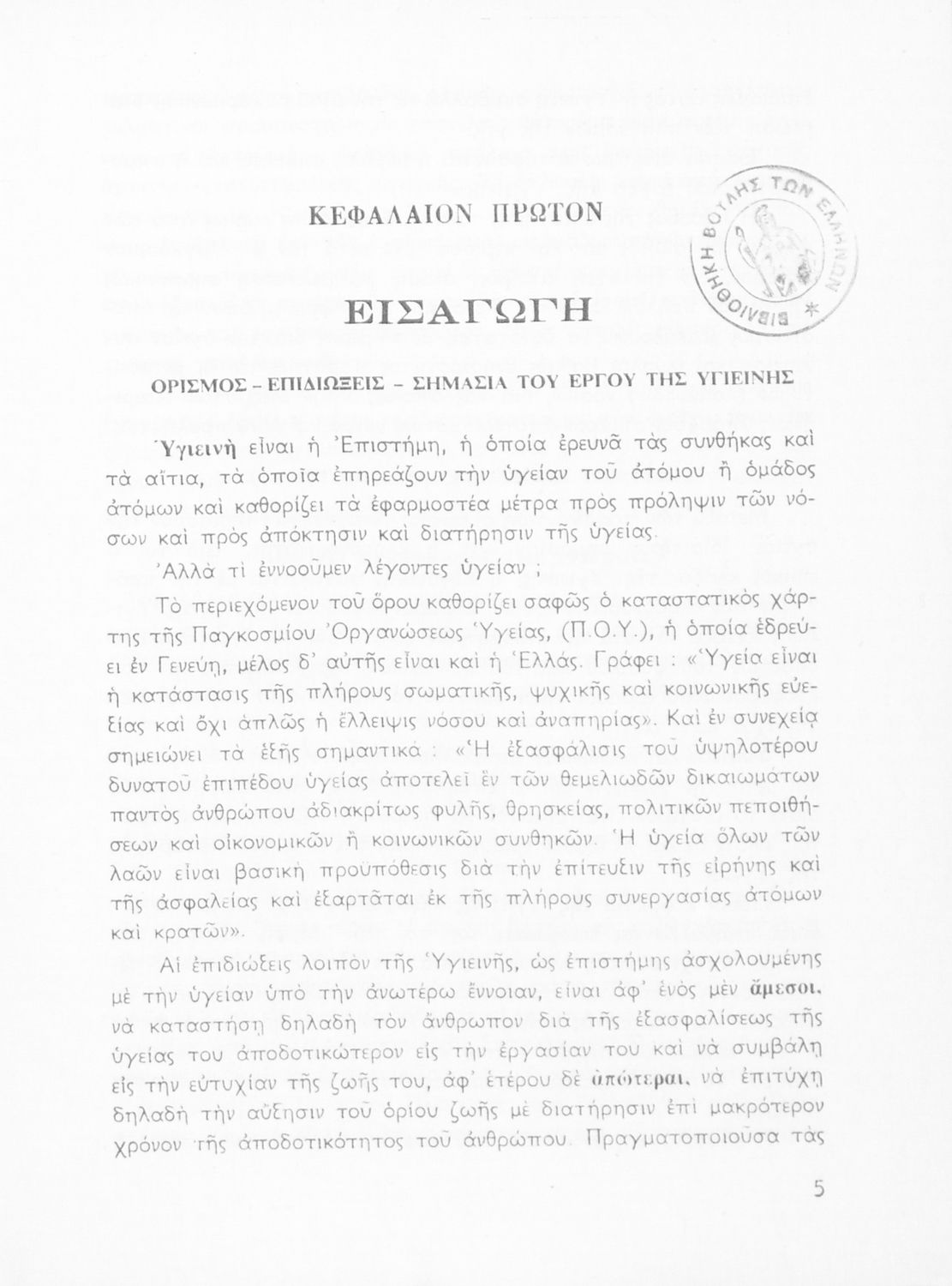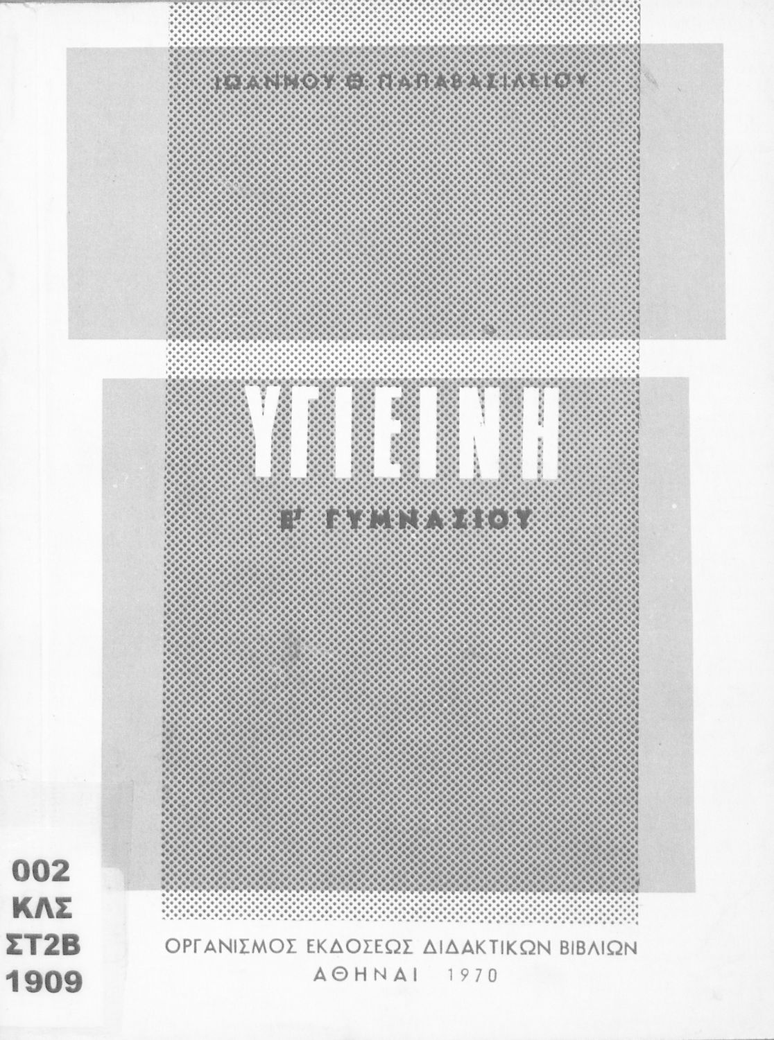 Σχολικό εγχειρίδιο Υγιεινής για τους μαθητές της Ε' τάξης του Γυμνασίου. Το βιβλίο αναφέρεται στις συνθήκες και τις αιτίες που επηρεάζουν την υγεία του ατόμου ή μιας ομάδας ατόμων και παρουσιάζει τα μέτρα που πρέπει να ληφθούν για την ανάκτηση και διατήρηση της υγιεινής των ανθρώπων. Πιο συγκεκριμένα αναφέρεται στην επίδραση της ατμόσφαιρας, του νερού, των λοιμωδών νοσημάτων αλλά και της κληρονομικότητας.