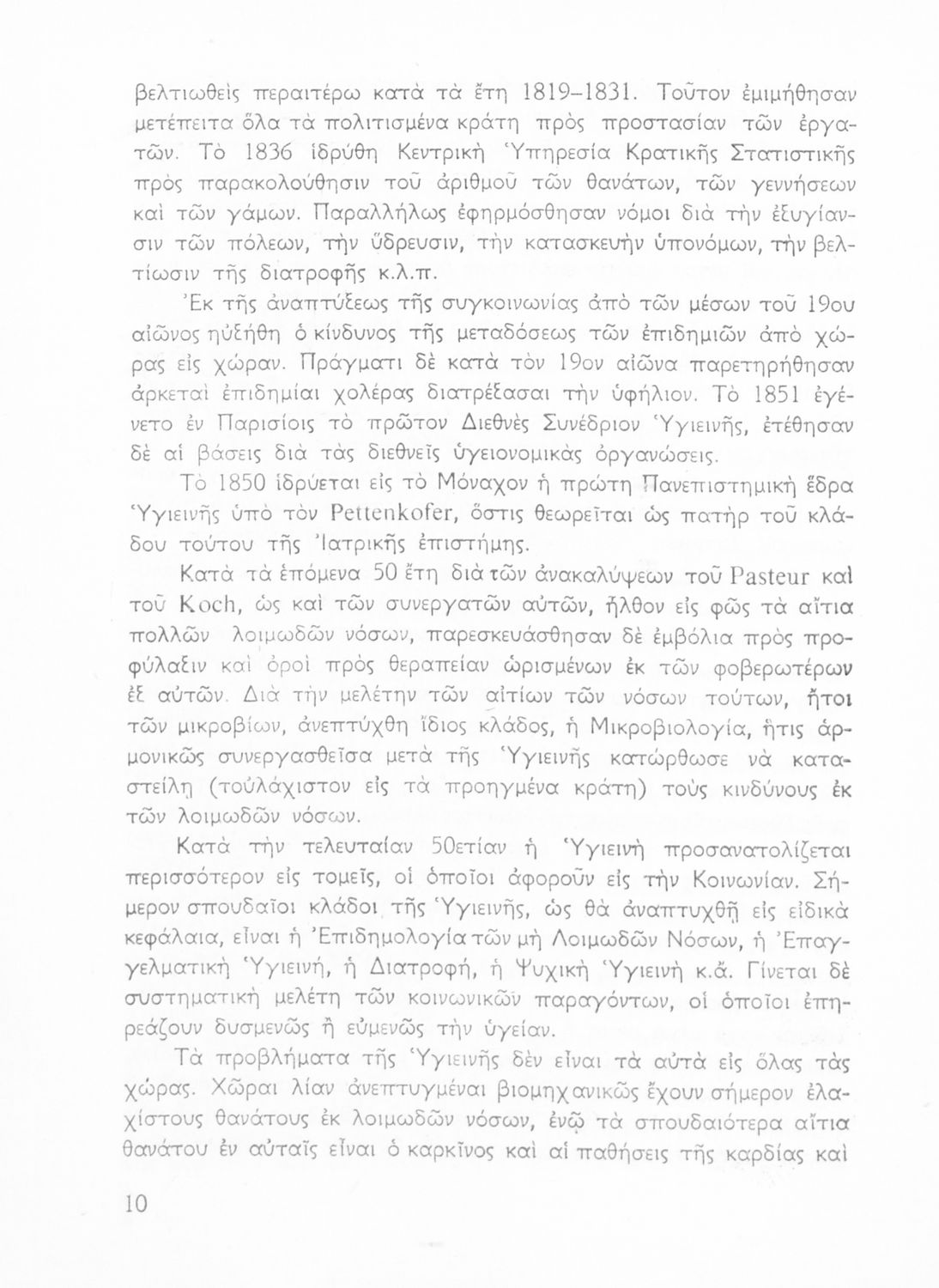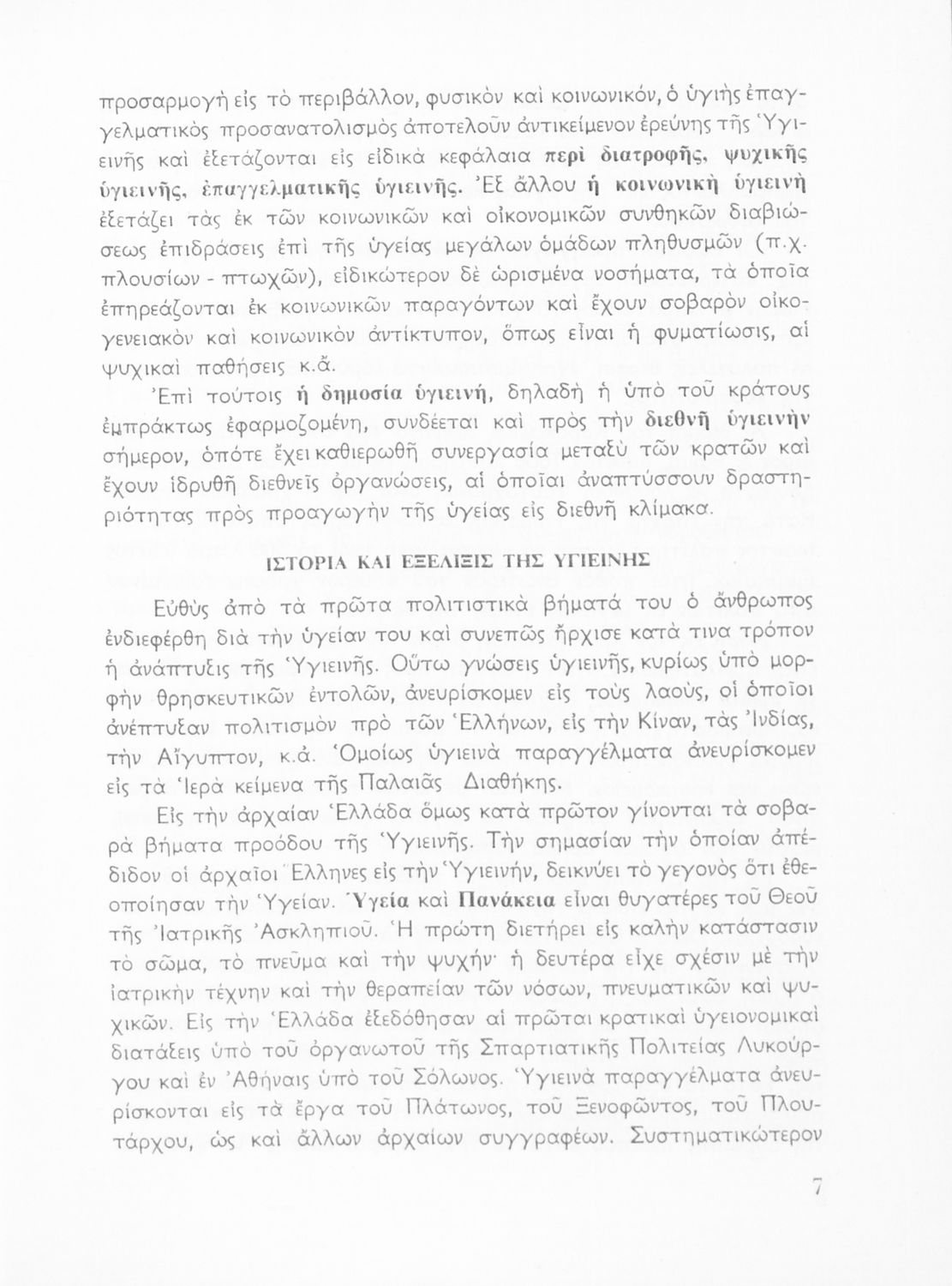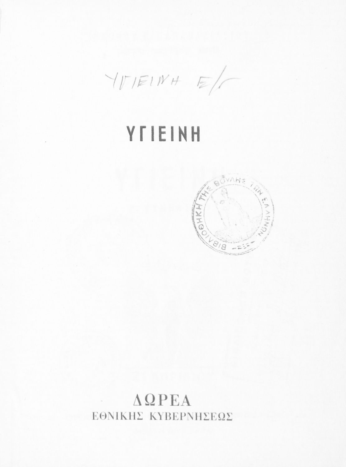 Σχολικό εγχειρίδιο Υγιεινής για τους μαθητές της Ε' τάξης του Γυμνασίου. Το βιβλίο αναφέρεται στις συνθήκες και τις αιτίες που επηρεάζουν την υγεία του ατόμου ή μιας ομάδας ατόμων και παρουσιάζει τα μέτρα που πρέπει να ληφθούν για την ανάκτηση και διατήρηση της υγιεινής των ανθρώπων. Πιο συγκεκριμένα αναφέρεται στην επίδραση της ατμόσφαιρας, του νερού, των λοιμωδών νοσημάτων αλλά και της κληρονομικότητας.