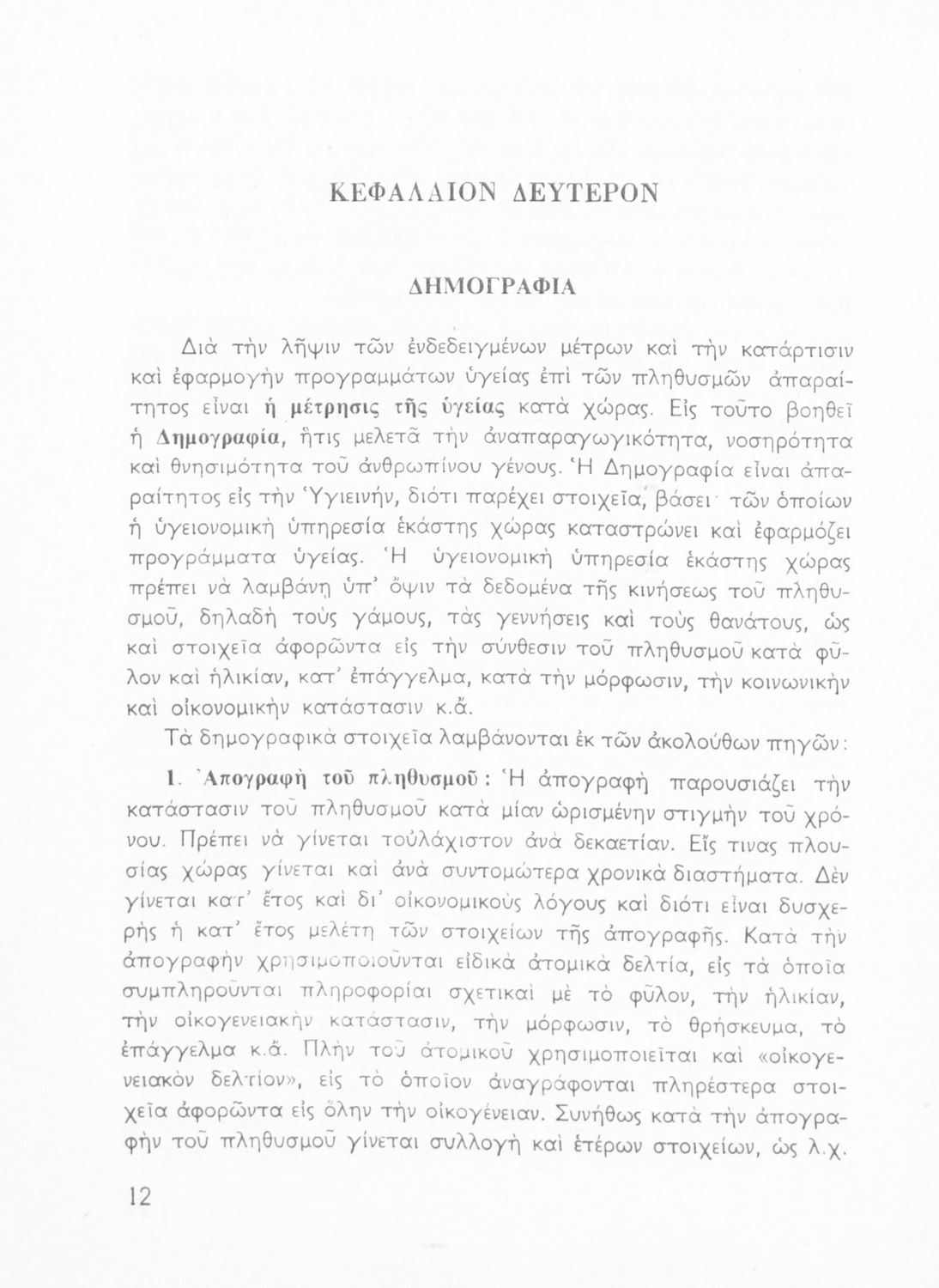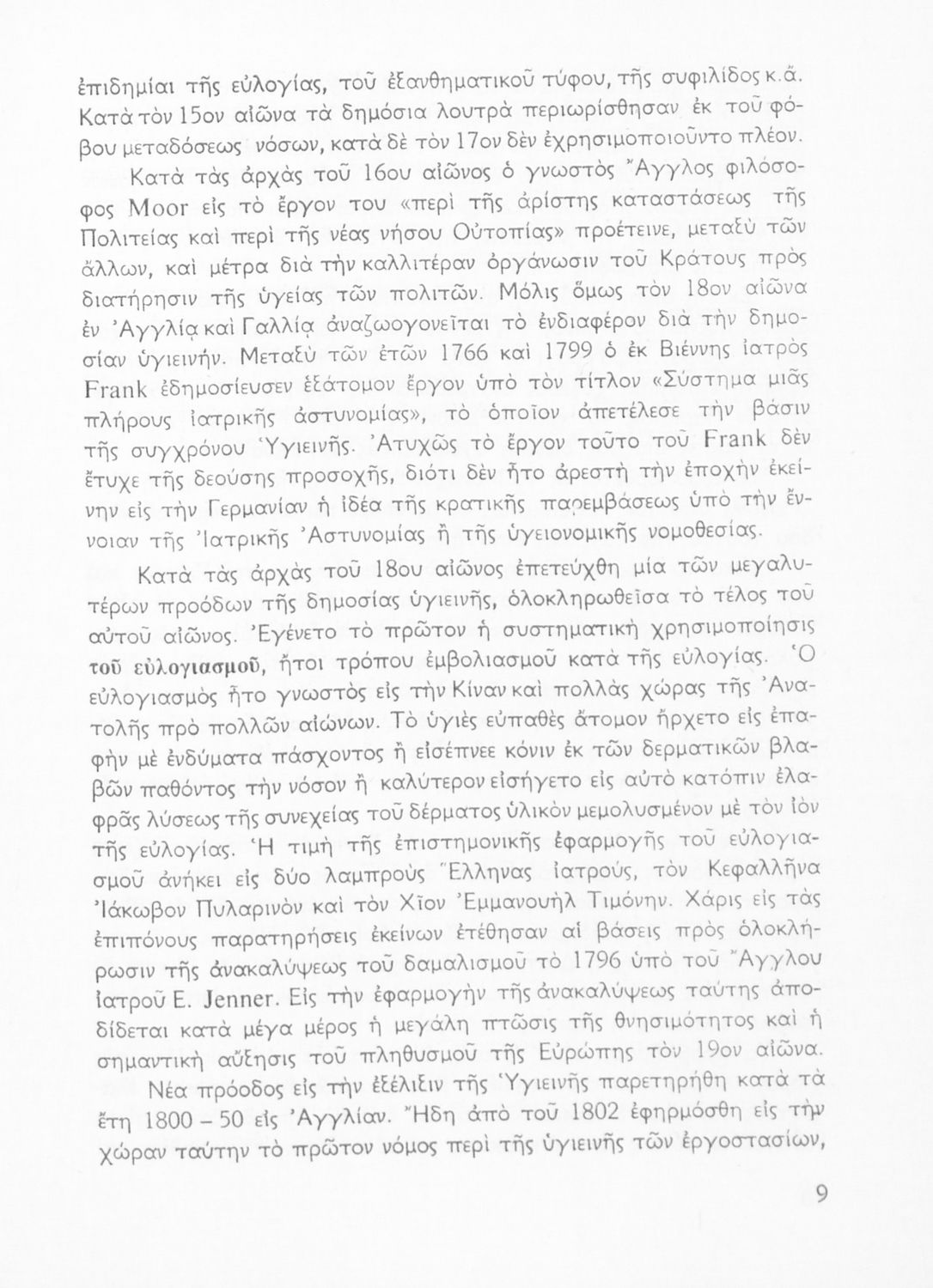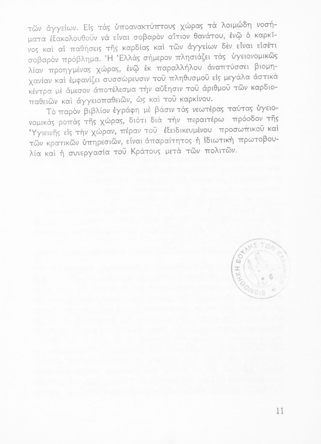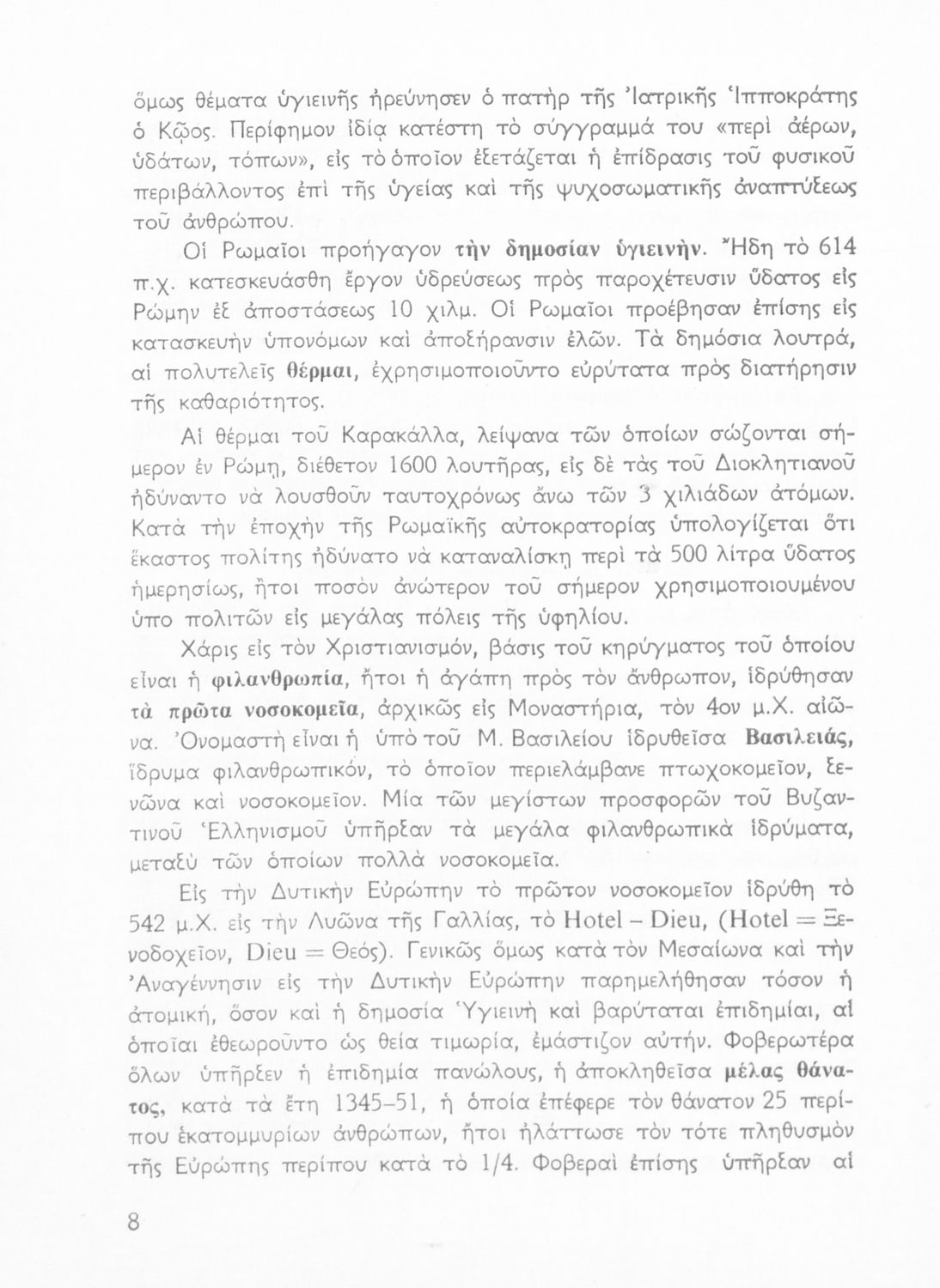 Σχολικό εγχειρίδιο Υγιεινής για τους μαθητές της Ε' τάξης του Γυμνασίου. Το βιβλίο αναφέρεται στις συνθήκες και τις αιτίες που επηρεάζουν την υγεία του ατόμου ή μιας ομάδας ατόμων και παρουσιάζει τα μέτρα που πρέπει να ληφθούν για την ανάκτηση και διατήρηση της υγιεινής των ανθρώπων. Πιο συγκεκριμένα αναφέρεται στην επίδραση της ατμόσφαιρας, του νερού, των λοιμωδών νοσημάτων αλλά και της κληρονομικότητας.