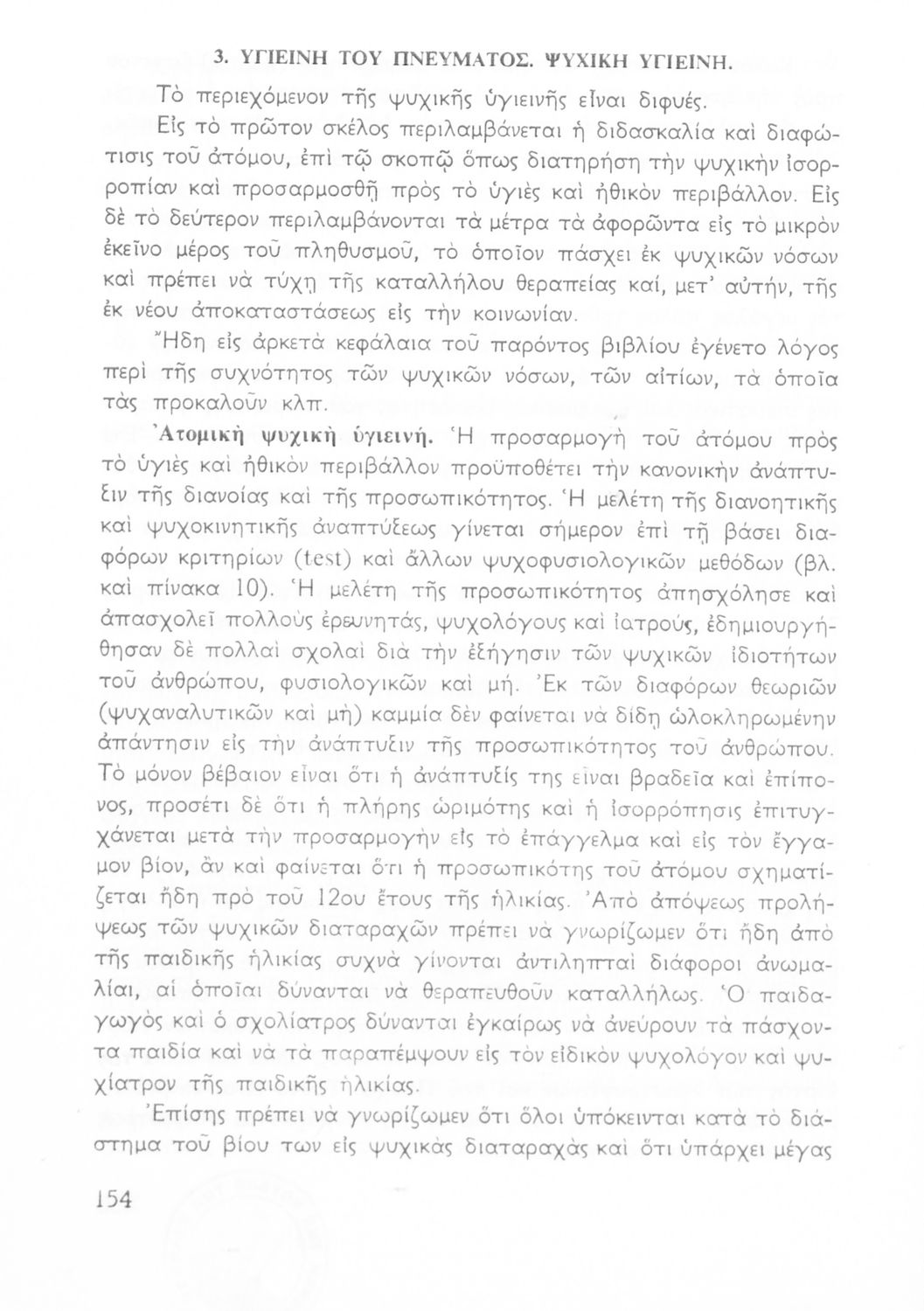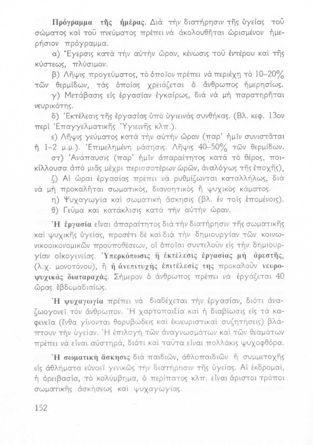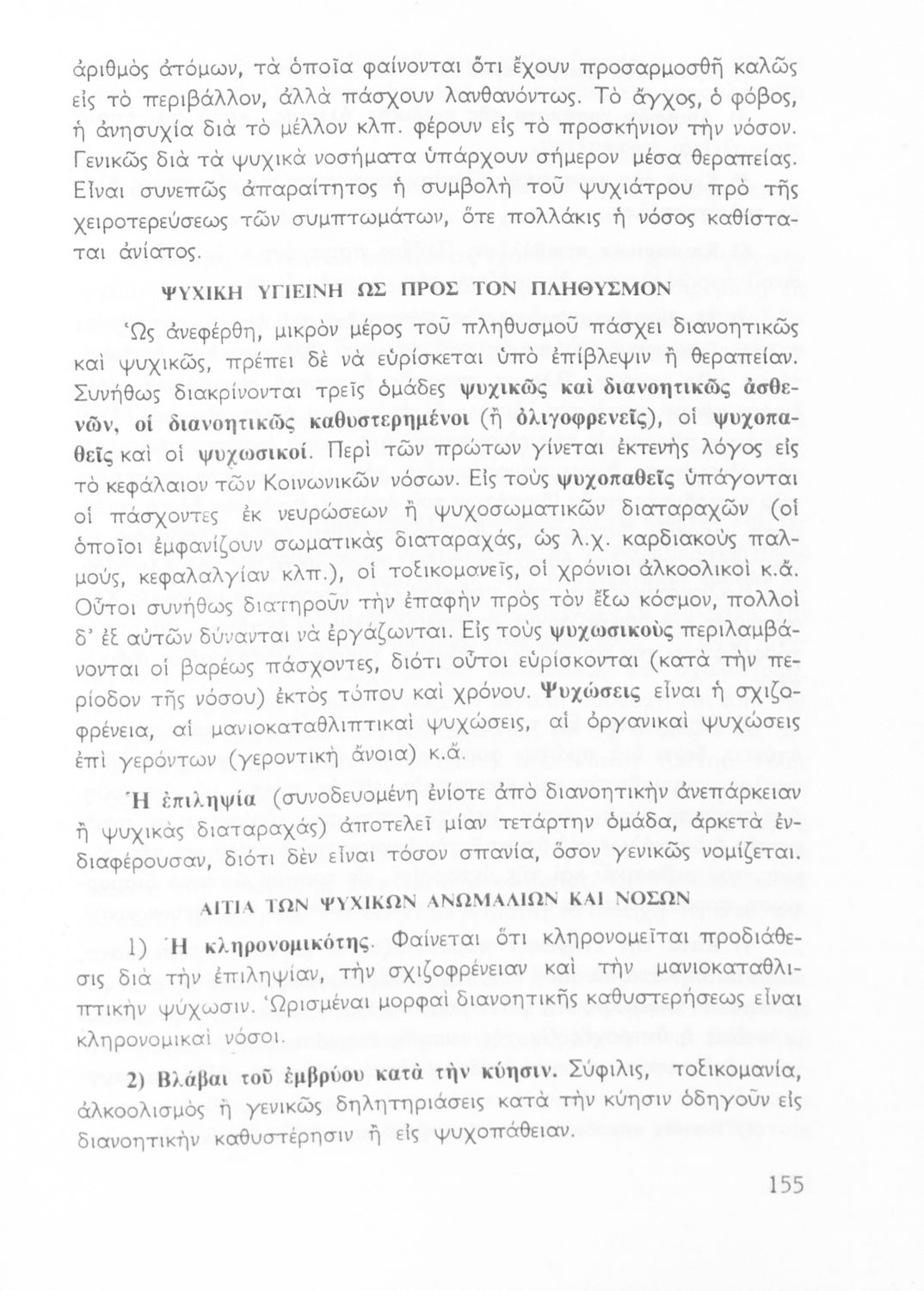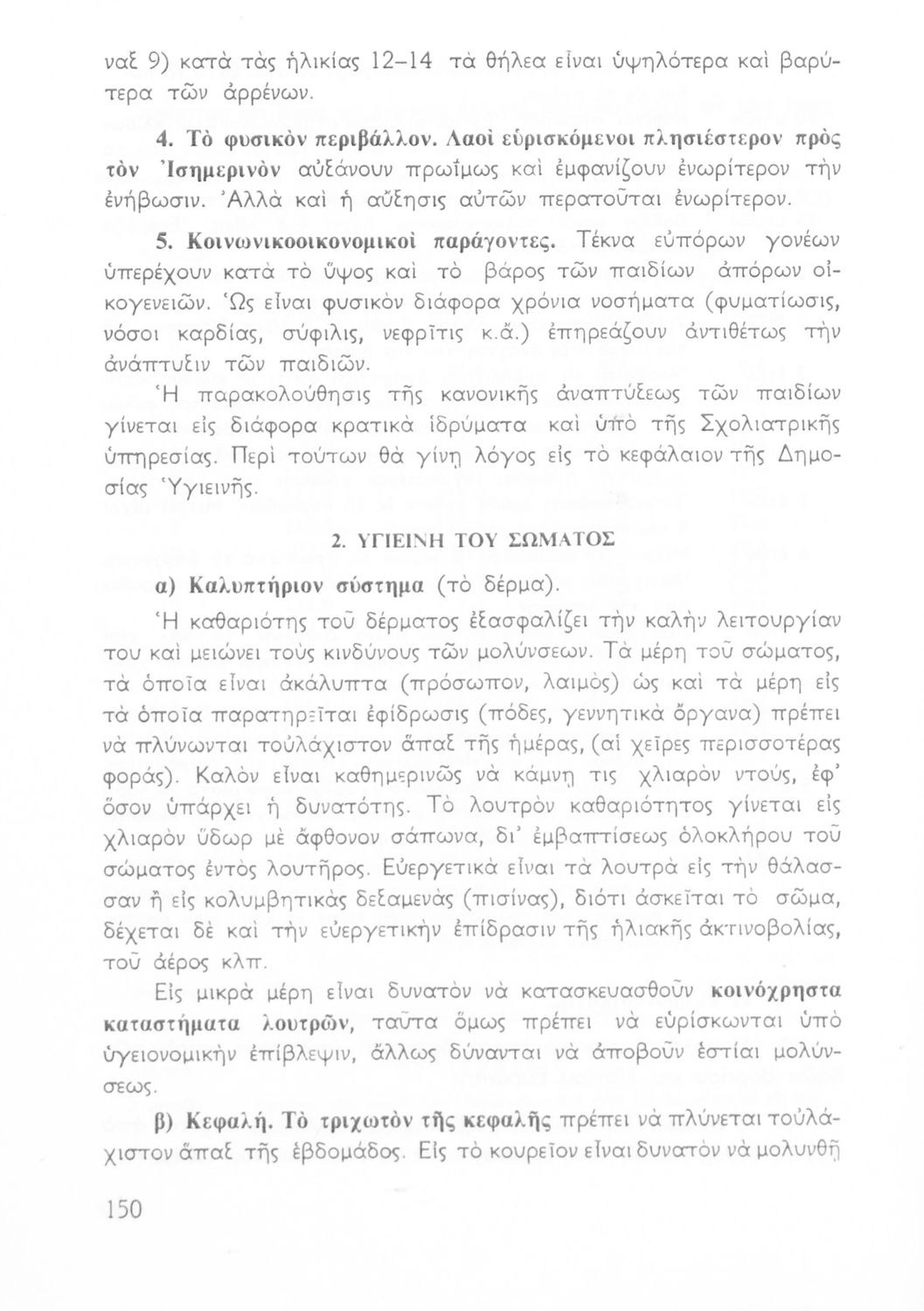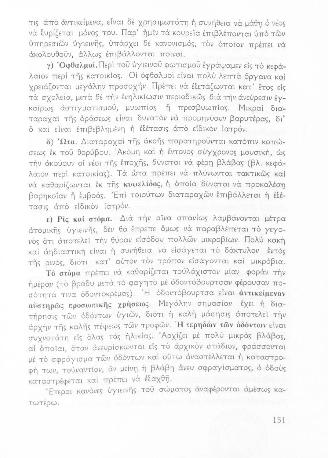 Σχολικό εγχειρίδιο Υγιεινής για τους μαθητές της Ε' τάξης του Γυμνασίου. Το βιβλίο αναφέρεται στις συνθήκες και τις αιτίες που επηρεάζουν την υγεία του ατόμου ή μιας ομάδας ατόμων και παρουσιάζει τα μέτρα που πρέπει να ληφθούν για την ανάκτηση και διατήρηση της υγιεινής των ανθρώπων. Πιο συγκεκριμένα αναφέρεται στην επίδραση της ατμόσφαιρας, του νερού, των λοιμωδών νοσημάτων αλλά και της κληρονομικότητας.