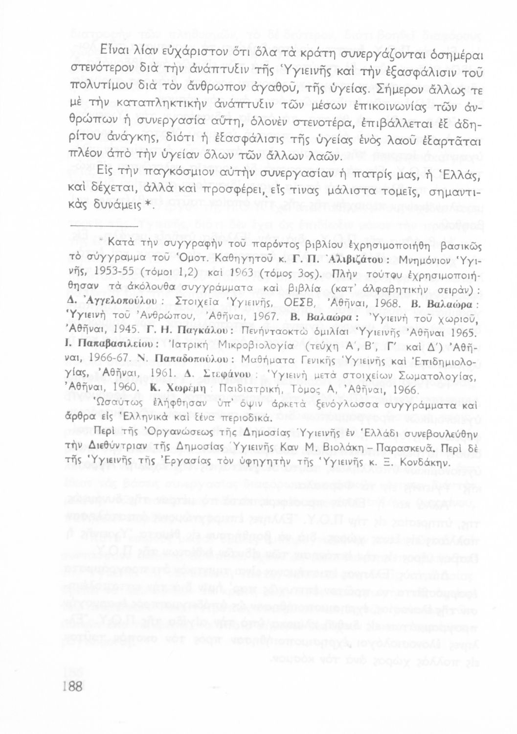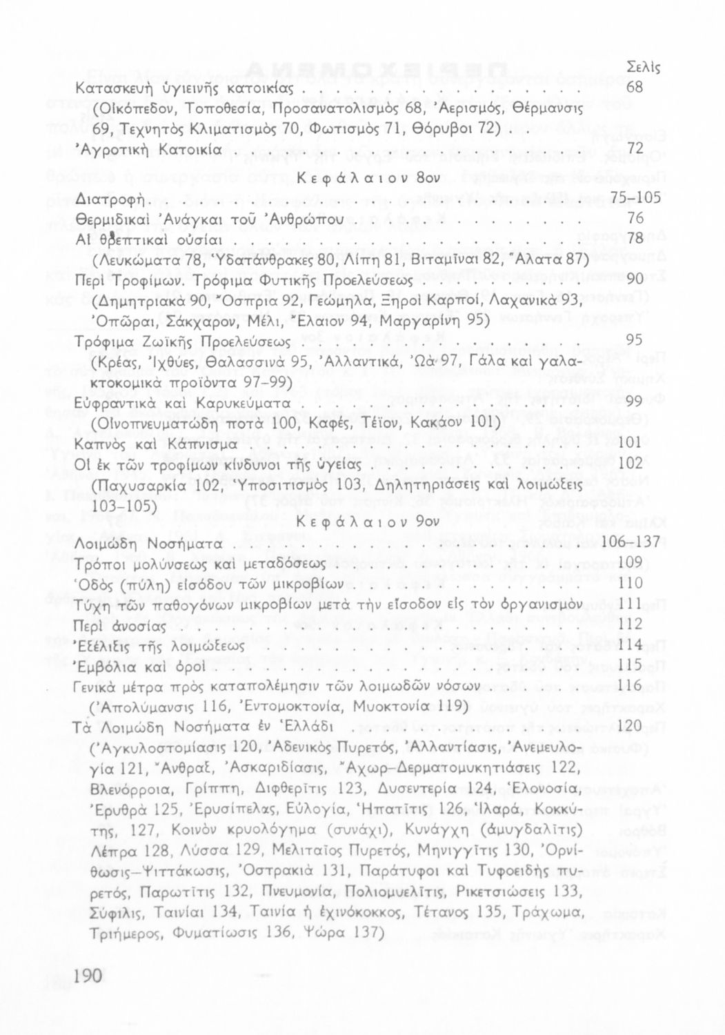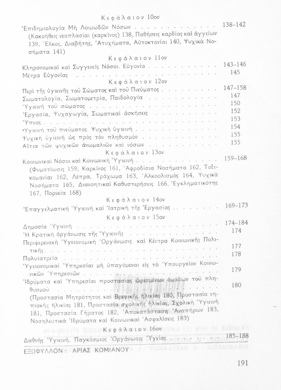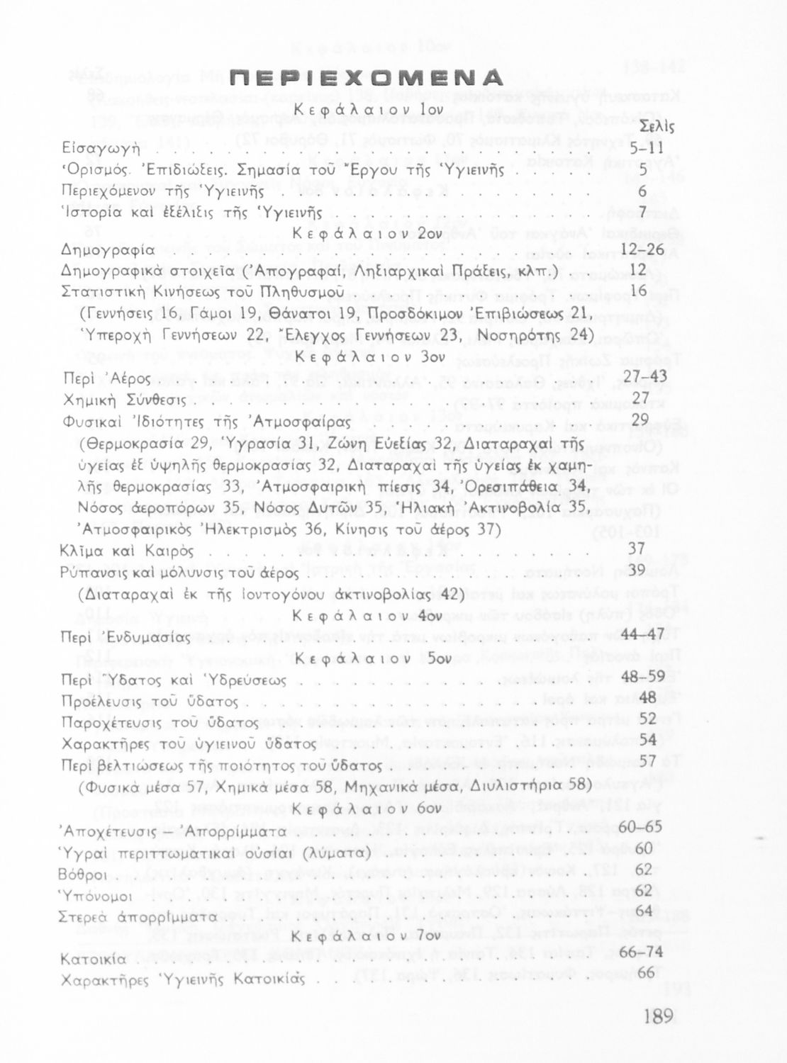 Σχολικό εγχειρίδιο Υγιεινής για τους μαθητές της Ε' τάξης του Γυμνασίου. Το βιβλίο αναφέρεται στις συνθήκες και τις αιτίες που επηρεάζουν την υγεία του ατόμου ή μιας ομάδας ατόμων και παρουσιάζει τα μέτρα που πρέπει να ληφθούν για την ανάκτηση και διατήρηση της υγιεινής των ανθρώπων. Πιο συγκεκριμένα αναφέρεται στην επίδραση της ατμόσφαιρας, του νερού, των λοιμωδών νοσημάτων αλλά και της κληρονομικότητας.