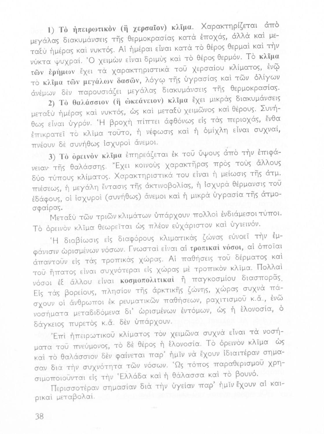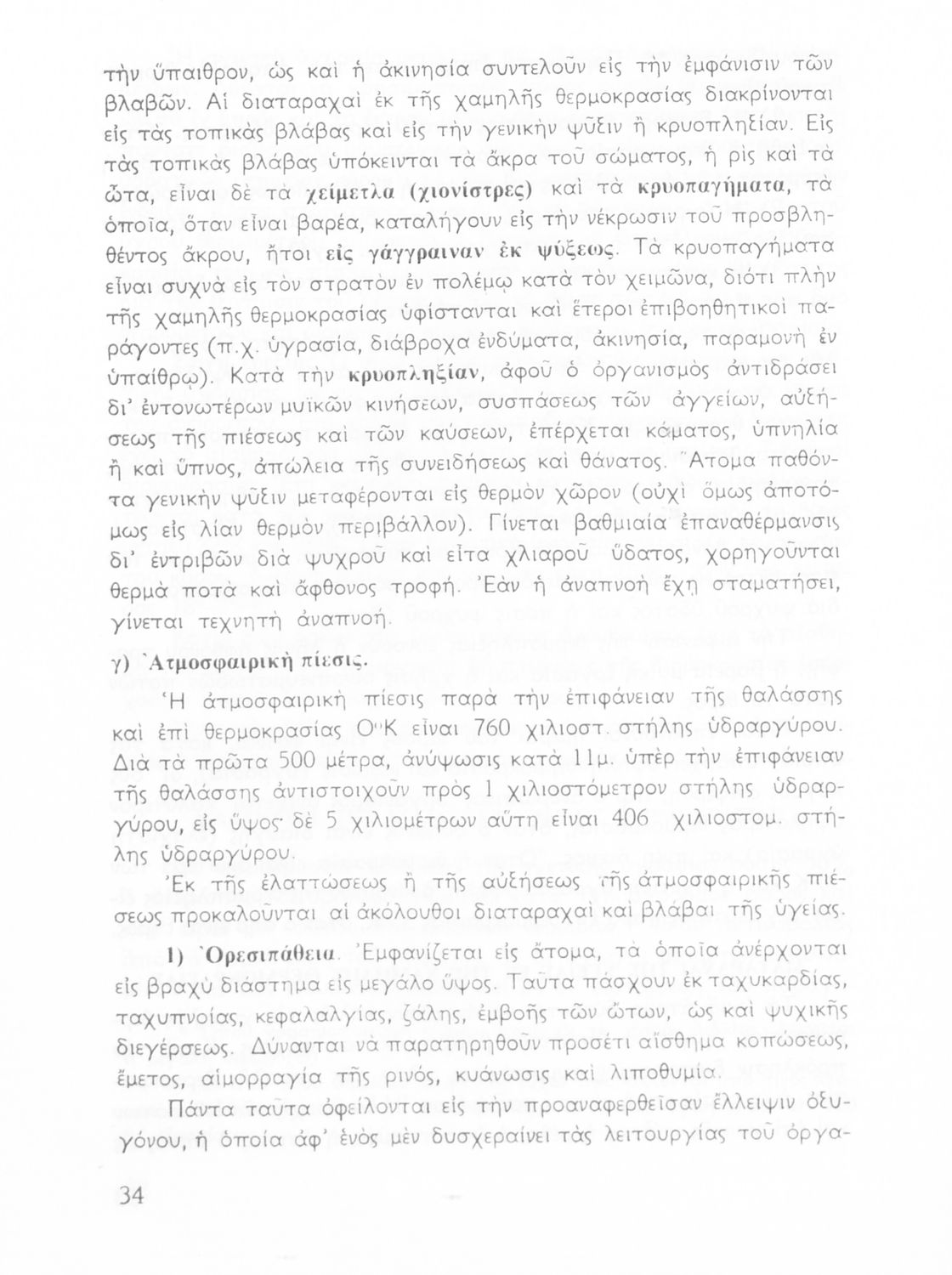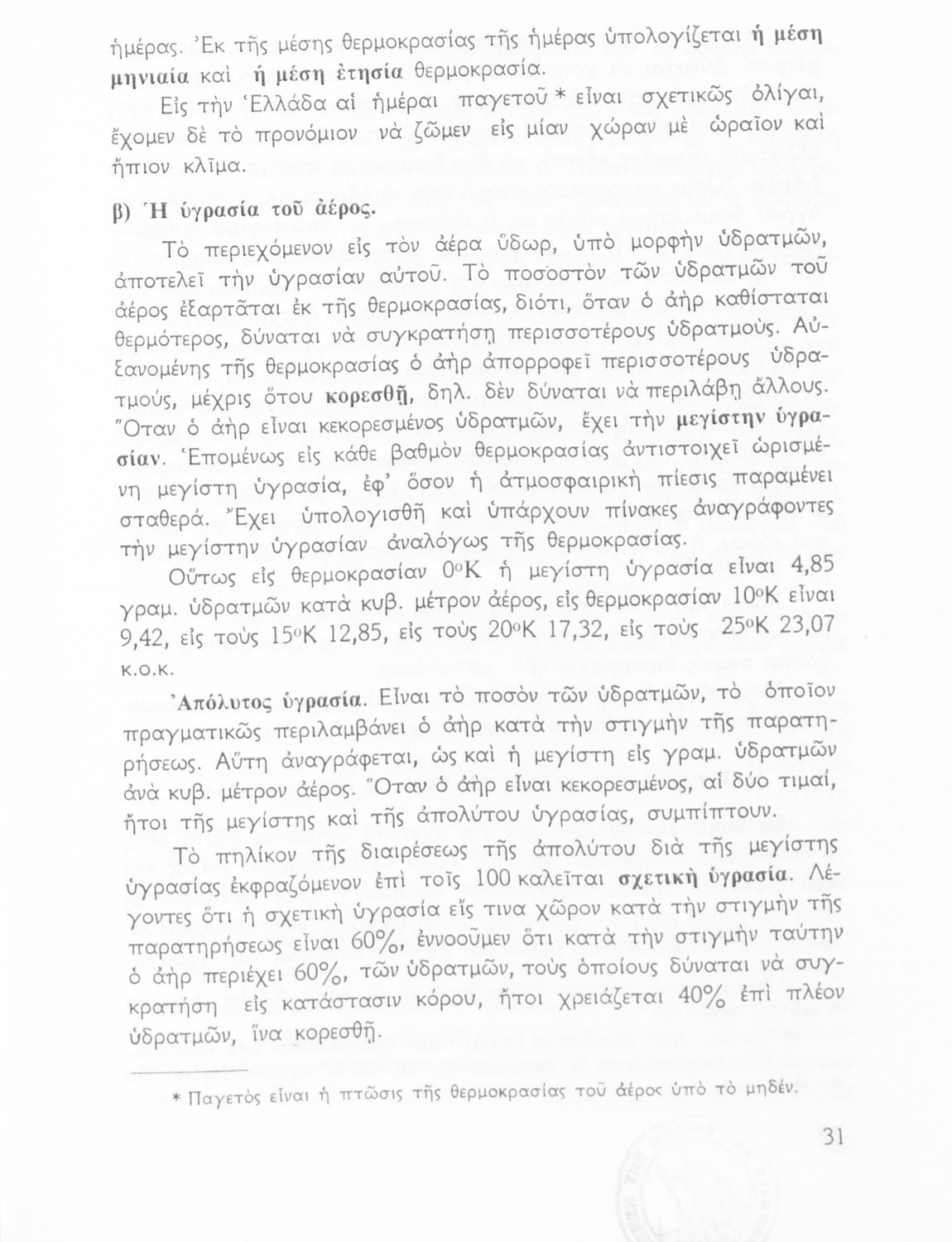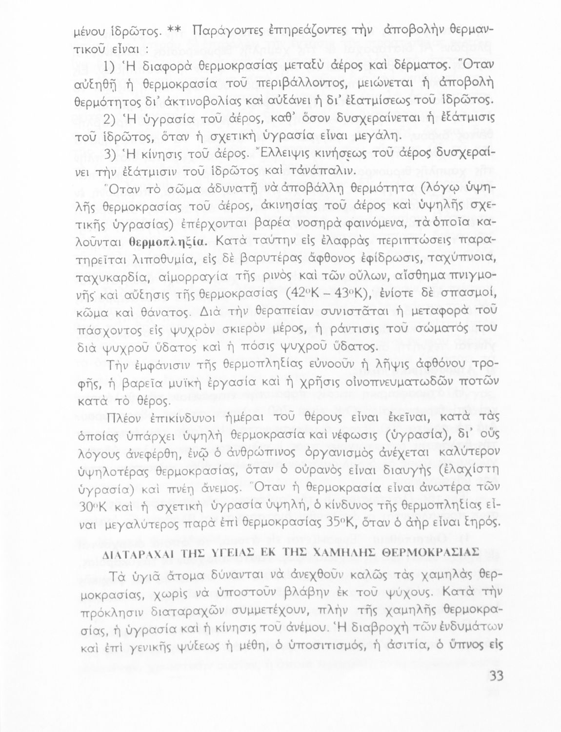 Σχολικό εγχειρίδιο Υγιεινής για τους μαθητές της Ε' τάξης του Γυμνασίου. Το βιβλίο αναφέρεται στις συνθήκες και τις αιτίες που επηρεάζουν την υγεία του ατόμου ή μιας ομάδας ατόμων και παρουσιάζει τα μέτρα που πρέπει να ληφθούν για την ανάκτηση και διατήρηση της υγιεινής των ανθρώπων. Πιο συγκεκριμένα αναφέρεται στην επίδραση της ατμόσφαιρας, του νερού, των λοιμωδών νοσημάτων αλλά και της κληρονομικότητας.