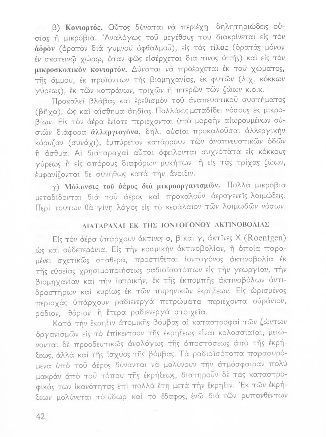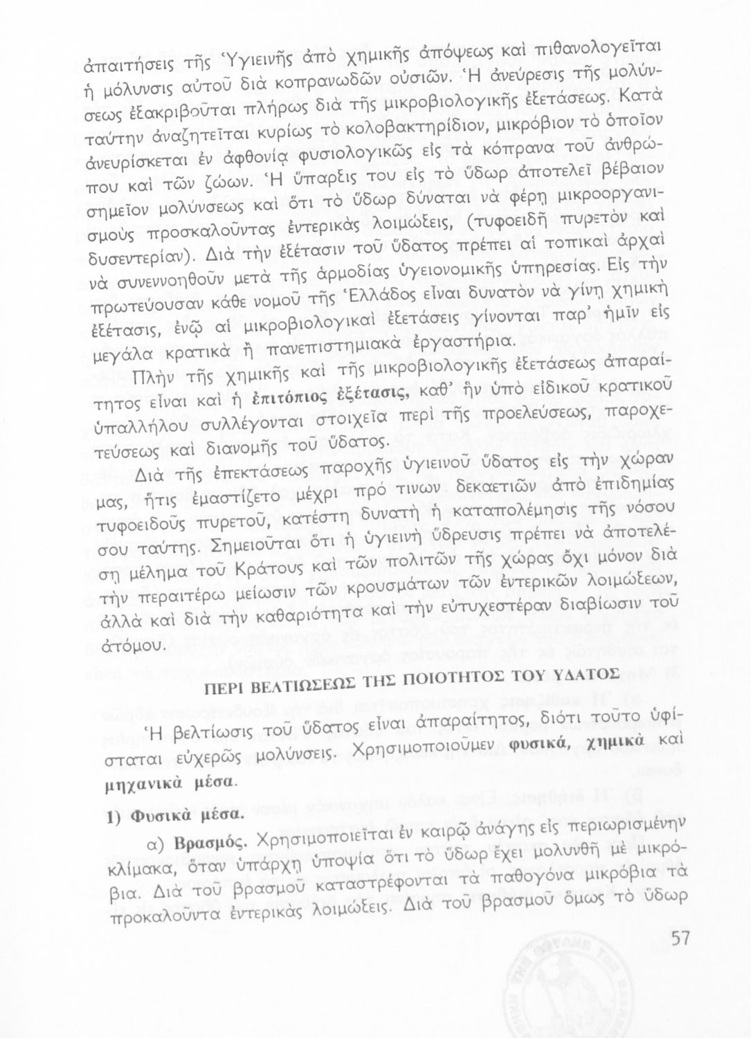 Σχολικό εγχειρίδιο Υγιεινής για τους μαθητές της Ε' τάξης του Γυμνασίου. Το βιβλίο αναφέρεται στις συνθήκες και τις αιτίες που επηρεάζουν την υγεία του ατόμου ή μιας ομάδας ατόμων και παρουσιάζει τα μέτρα που πρέπει να ληφθούν για την ανάκτηση και διατήρηση της υγιεινής των ανθρώπων. Πιο συγκεκριμένα αναφέρεται στην επίδραση της ατμόσφαιρας, του νερού, των λοιμωδών νοσημάτων αλλά και της κληρονομικότητας.