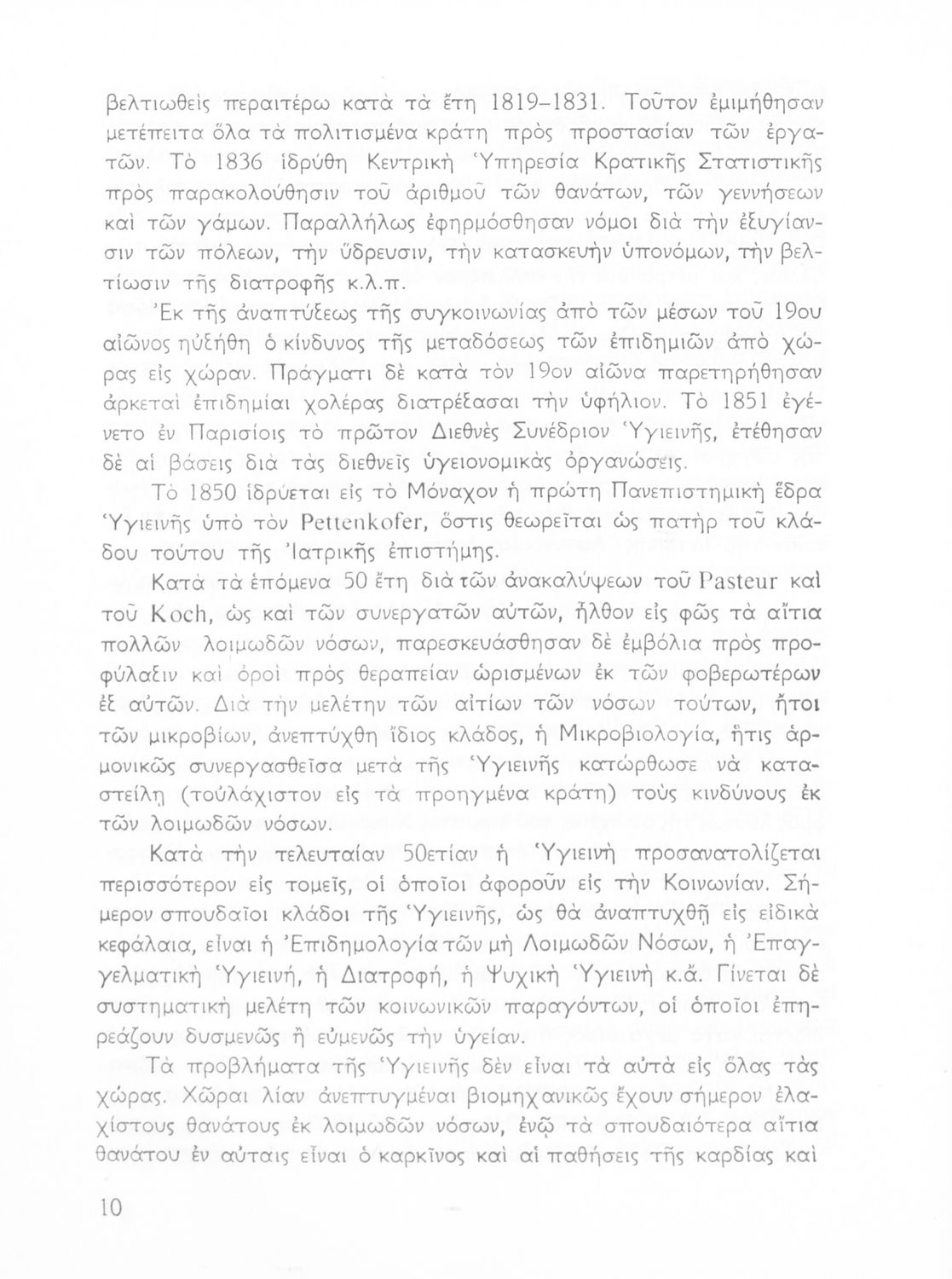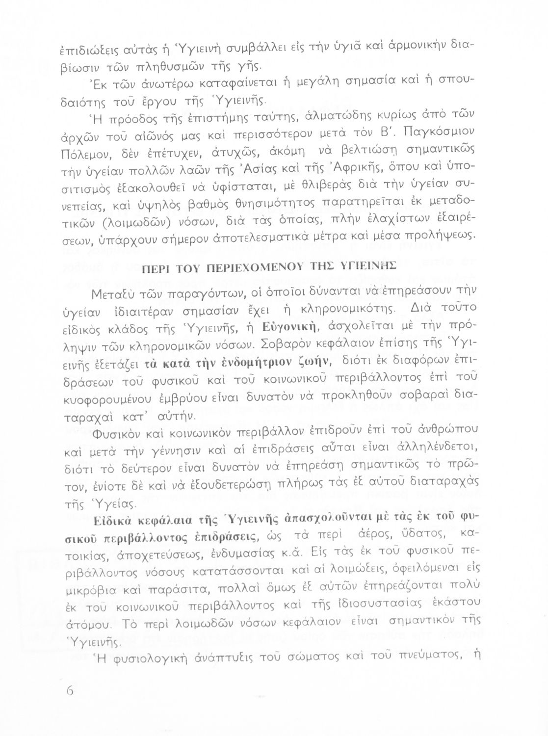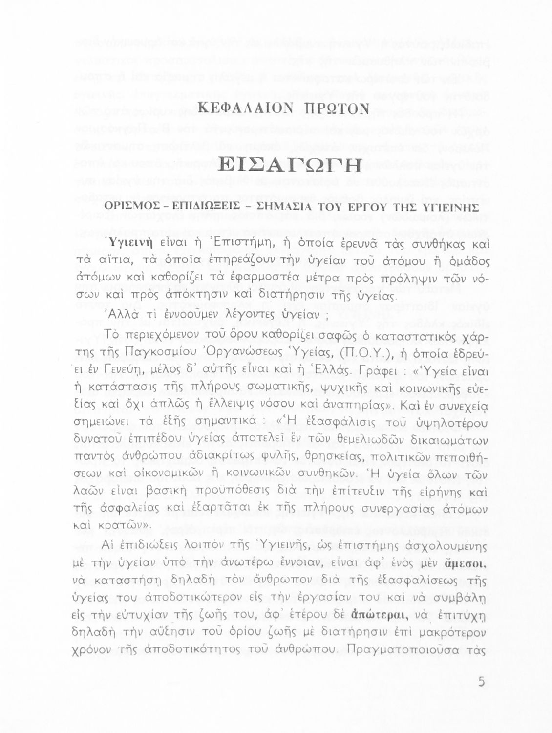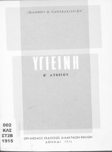 Σχολικό εγχειρίδιο Υγιεινής για τους μαθητές της Ε' τάξης του Γυμνασίου. Το βιβλίο αναφέρεται στις συνθήκες και τις αιτίες που επηρεάζουν την υγεία του ατόμου ή μιας ομάδας ατόμων και παρουσιάζει τα μέτρα που πρέπει να ληφθούν για την ανάκτηση και διατήρηση της υγιεινής των ανθρώπων. Πιο συγκεκριμένα αναφέρεται στην επίδραση της ατμόσφαιρας, του νερού, των λοιμωδών νοσημάτων αλλά και της κληρονομικότητας.