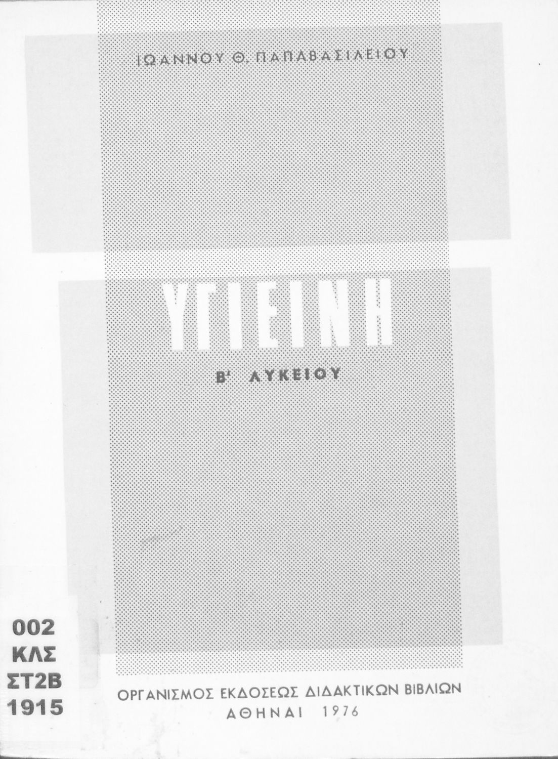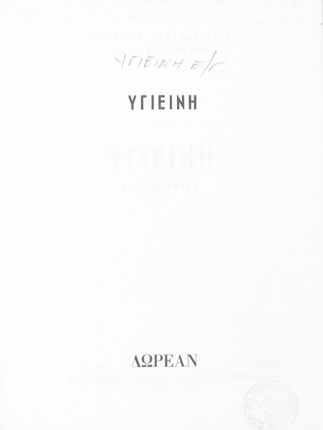Σχολικό εγχειρίδιο Υγιεινής για την Ε΄ Γυμνασίου που εστιάζει στην περιβαντολλογική διάσταση της υγιεινής. Φέρει το σύμβολο της δικτατορίας.