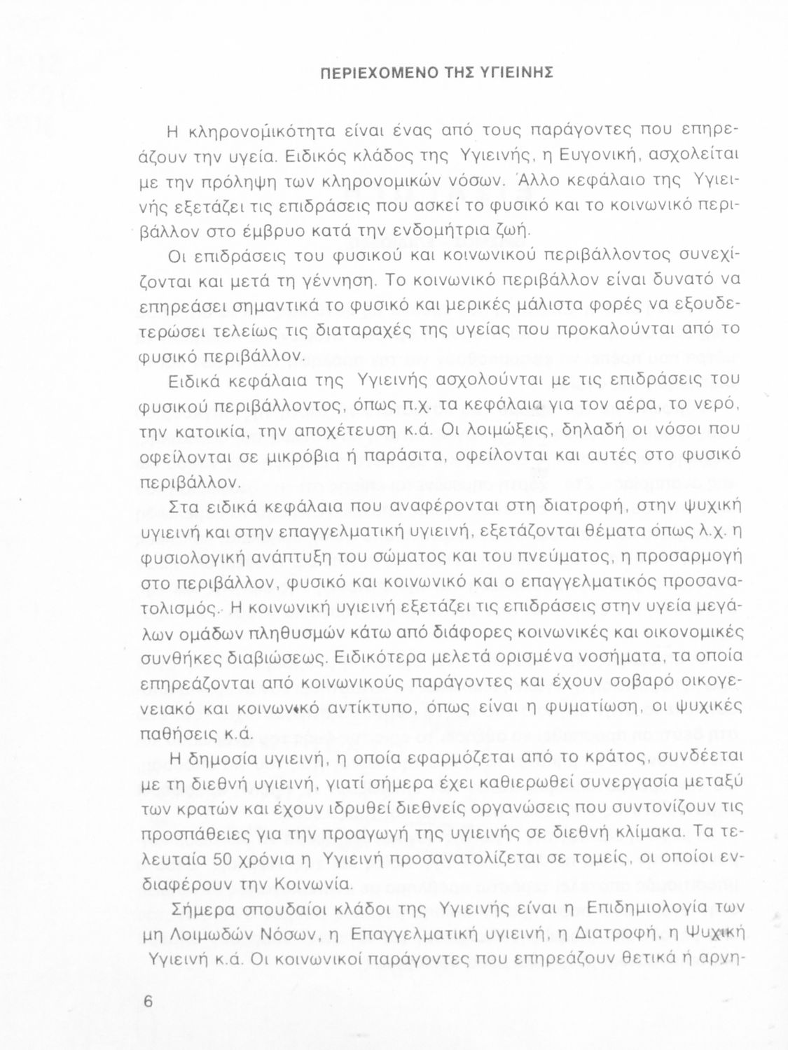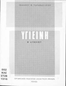 Σχολικό εγχειρίδιο Υγιεινής για τους μαθητές της Β' τάξης του Λυκείου. Το βιβλίο αναφέρεται στις συνθήκες και τις αιτίες που επηρεάζουν την υγεία του ατόμου ή μιας ομάδας ατόμων και παρουσιάζει τα μέτρα που πρέπει να ληφθούν για την ανάκτηση και διατήρηση της υγιεινής των ανθρώπων. Πιο συγκεκριμένα αναφέρεται στην επίδραση της ατμόσφαιρας, του νερού, των λοιμωδών νοσημάτων αλλά και της κληρονομικότητας.