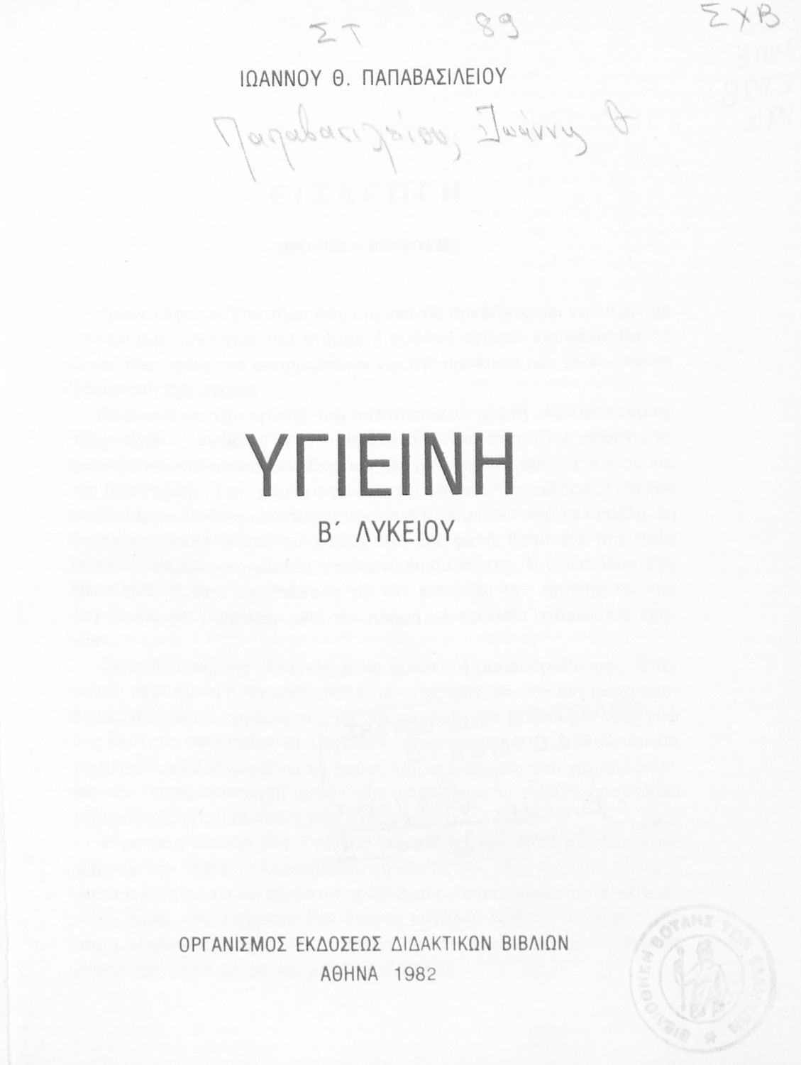 Σχολικό εγχειρίδιο Υγιεινής για τη Β΄ Λυκείου που εστιάζει περιβαντολλογική διάσταση της υγιεινής, τα λοιμώδη νοσήματα, και την κοινωνική υγιεινή.