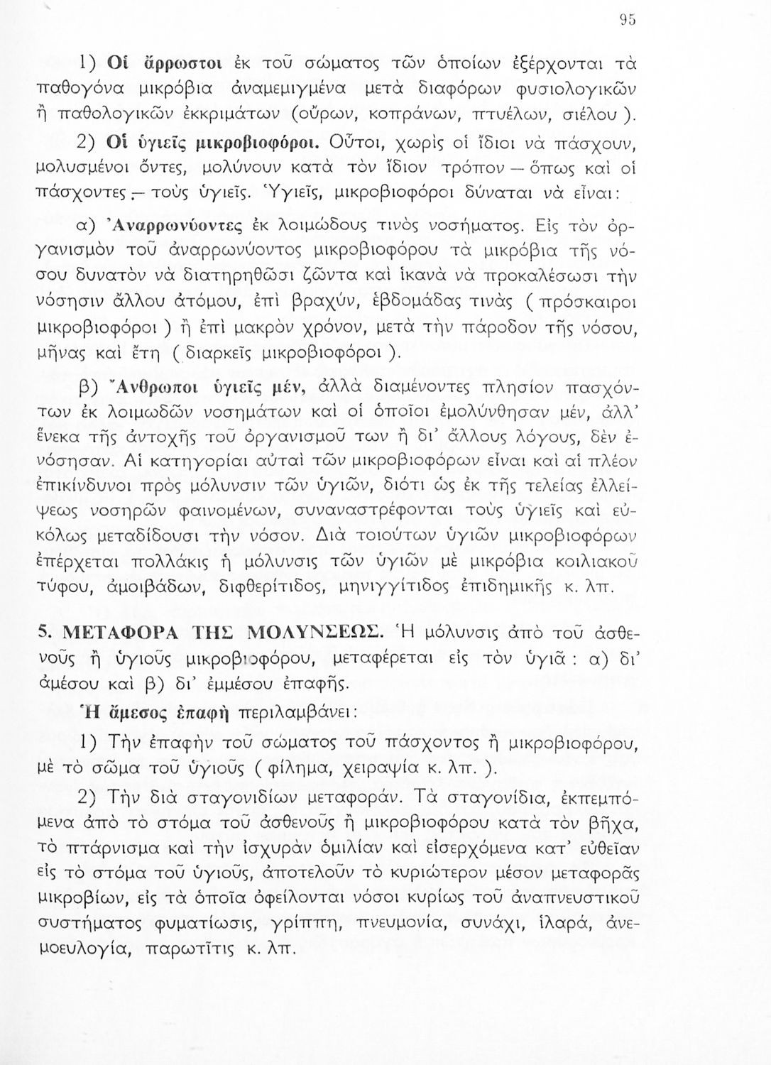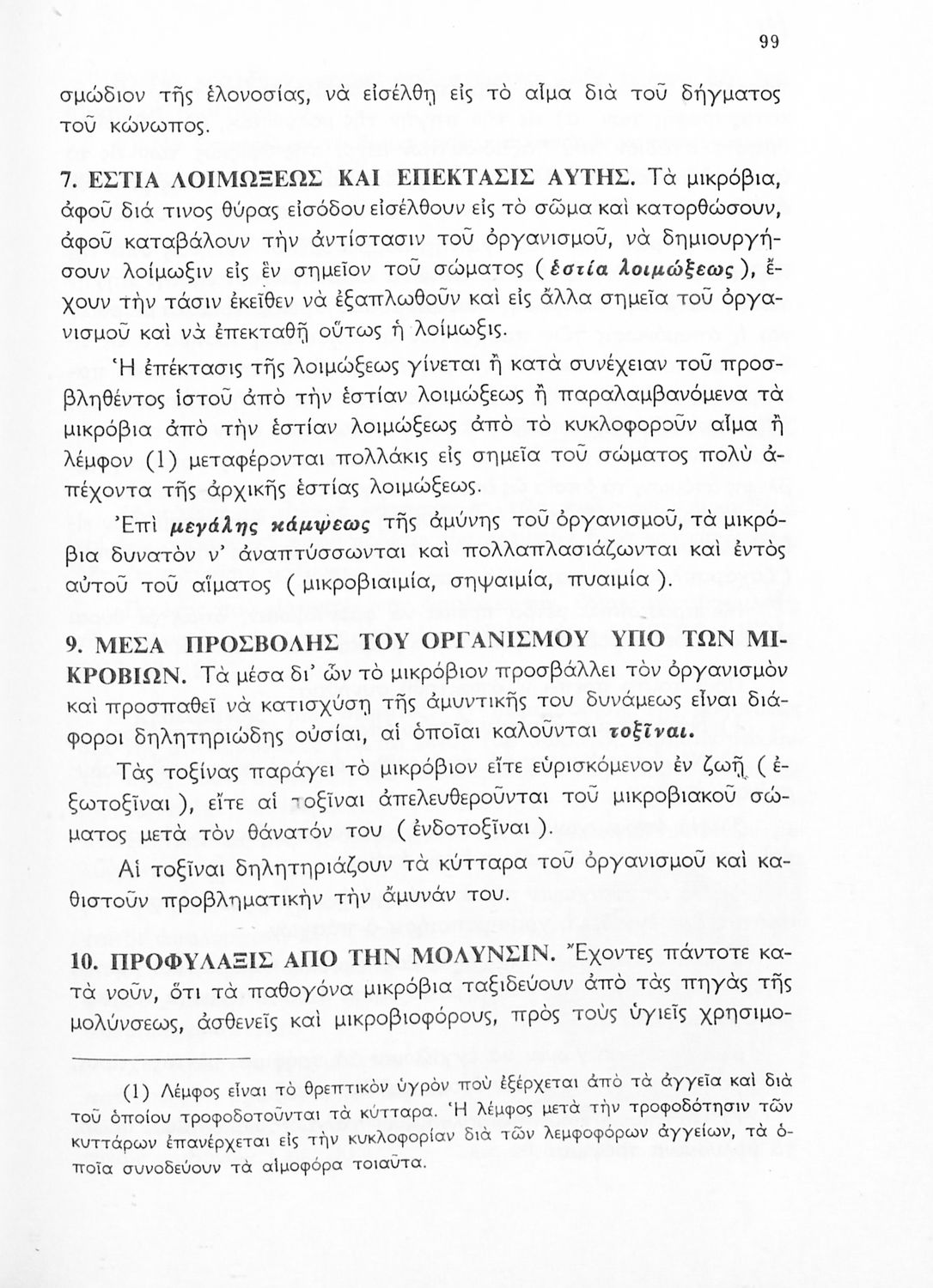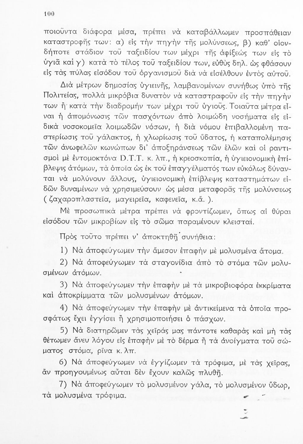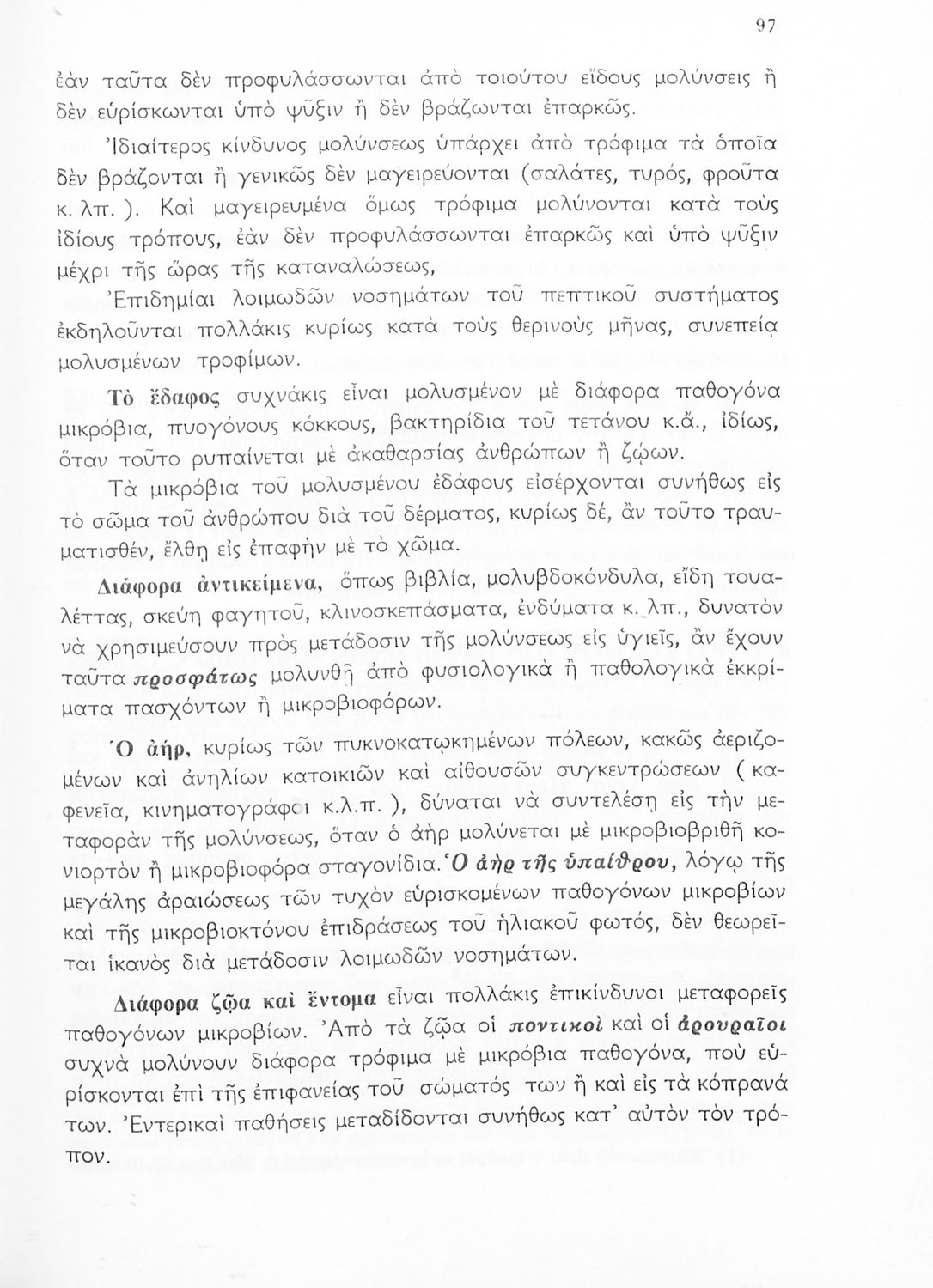 Σχολικό εγχειρίδιο Υγιεινής για τις τάξεις του Γυμνασίου. Αναφέρεται στο ζήτημα της υγιεινής και εξετάζει τις συνθήκες και τις αιτίες που επηρεάζουν την υγεία του ατόμου ή μιας ομάδας ατόμων και παρουσιάζει τα μέτρα που πρέπει να ληφθούν για την ανάκτηση και διατήρηση της υγείας. Πιο συγκεκριμένα το βιβλίο αναφέρεται στις επιδράσεις του αέρα, της ενδυμασίας και του νερού, των λοιμώδη νοσημάτων και το ρόλο της κληρονομικότητας.