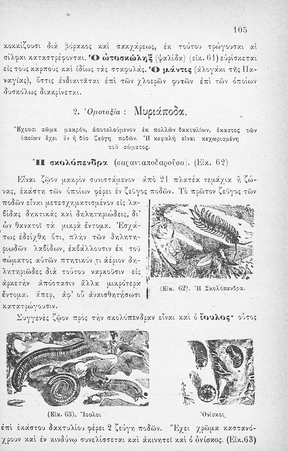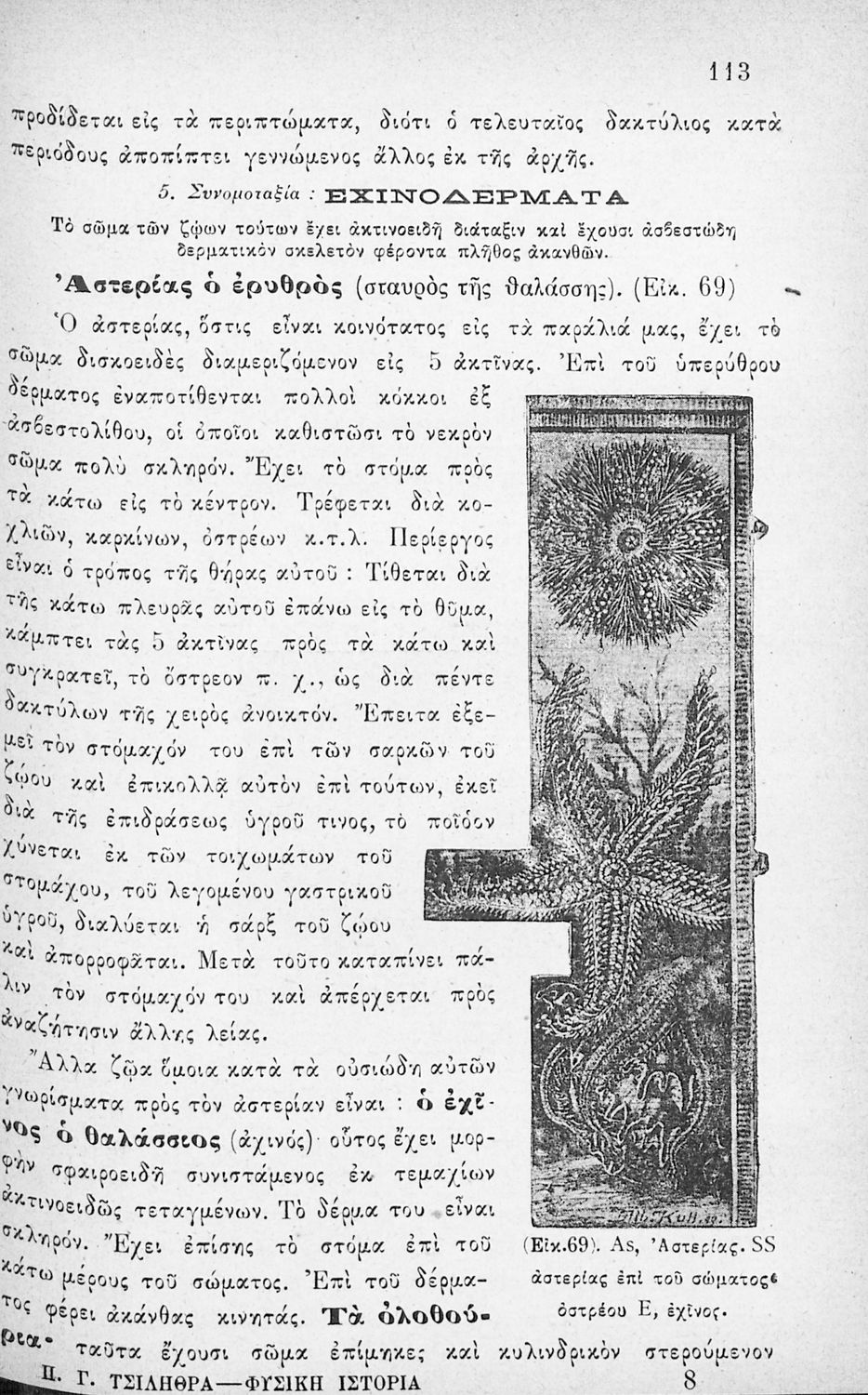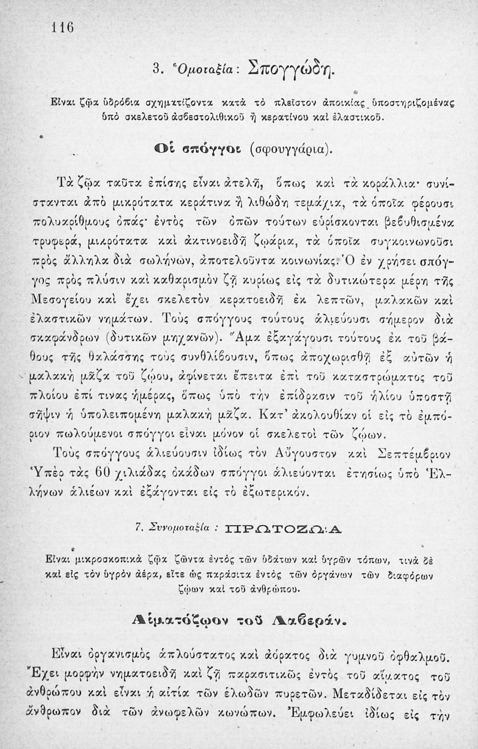 Σχολικό Εγχειρίδιο Φυσικής Ιστορίας για τις Α' και Β' Ελληνικών Σχολείων και Παρθεναγωγείων που περιλαμβάνει στοιχεία ζωολογίας και της φυτολογίας και διακρίνει τα ζώα και τα φυτά ανάλογα με την συνομοταξία στην οποία ανήκουν