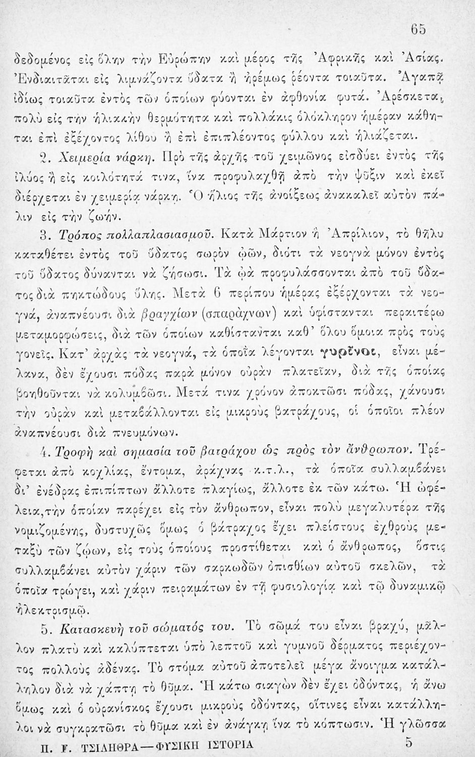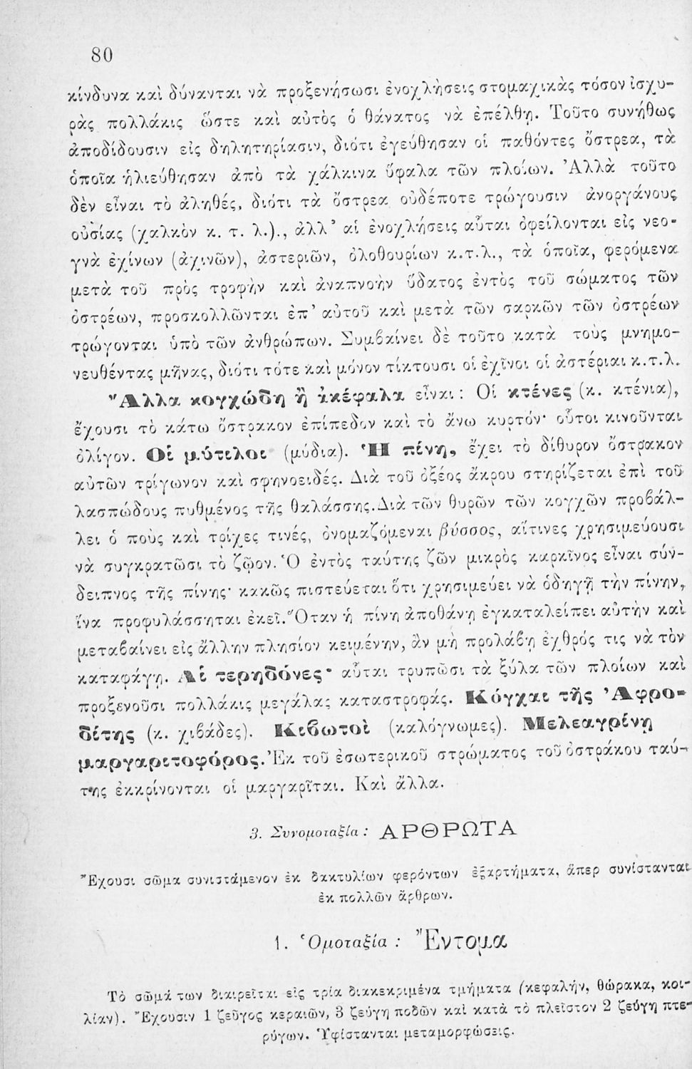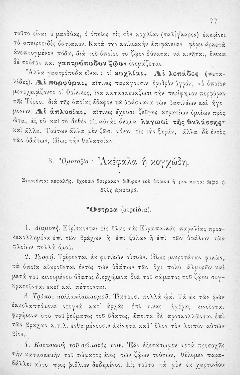 Σχολικό Εγχειρίδιο Φυσικής Ιστορίας για τις Α' και Β' Ελληνικών Σχολείων και Παρθεναγωγείων που περιλαμβάνει στοιχεία ζωολογίας και της φυτολογίας και διακρίνει τα ζώα και τα φυτά ανάλογα με την συνομοταξία στην οποία ανήκουν