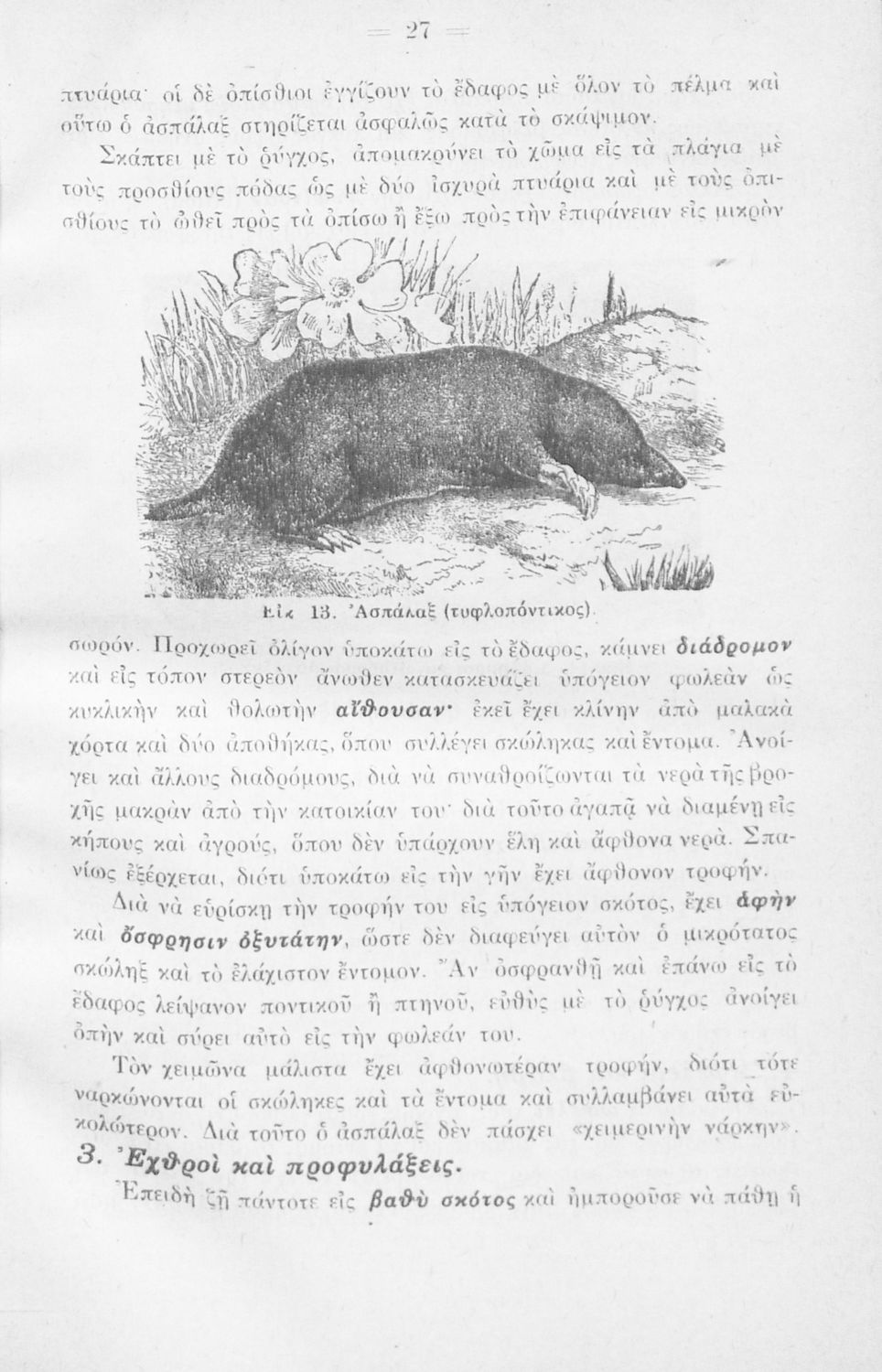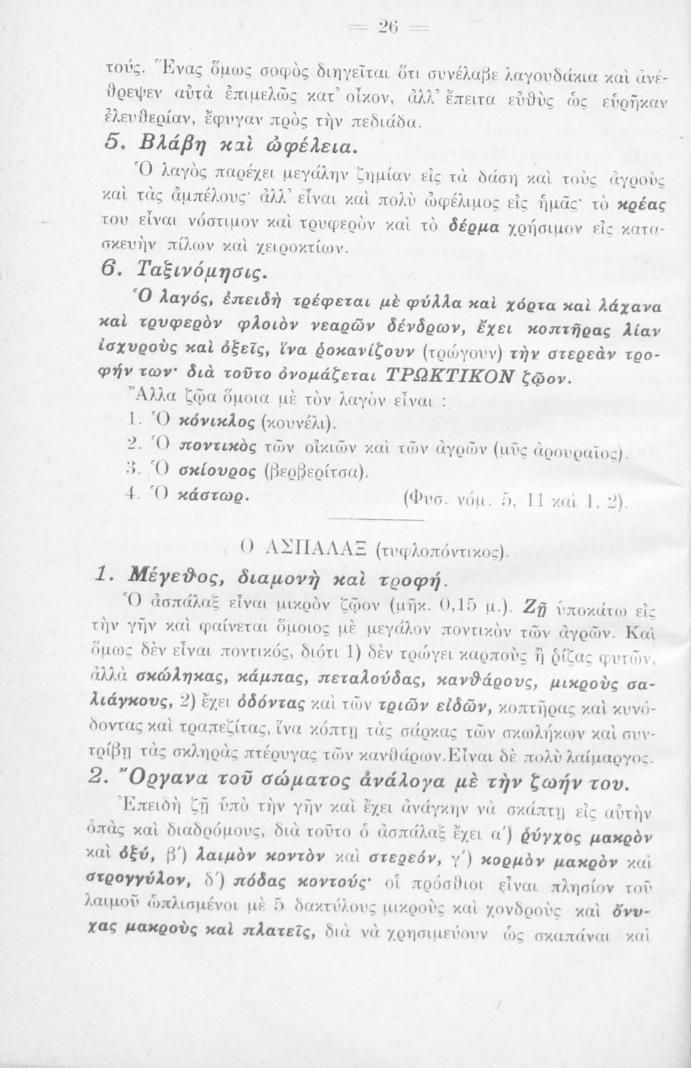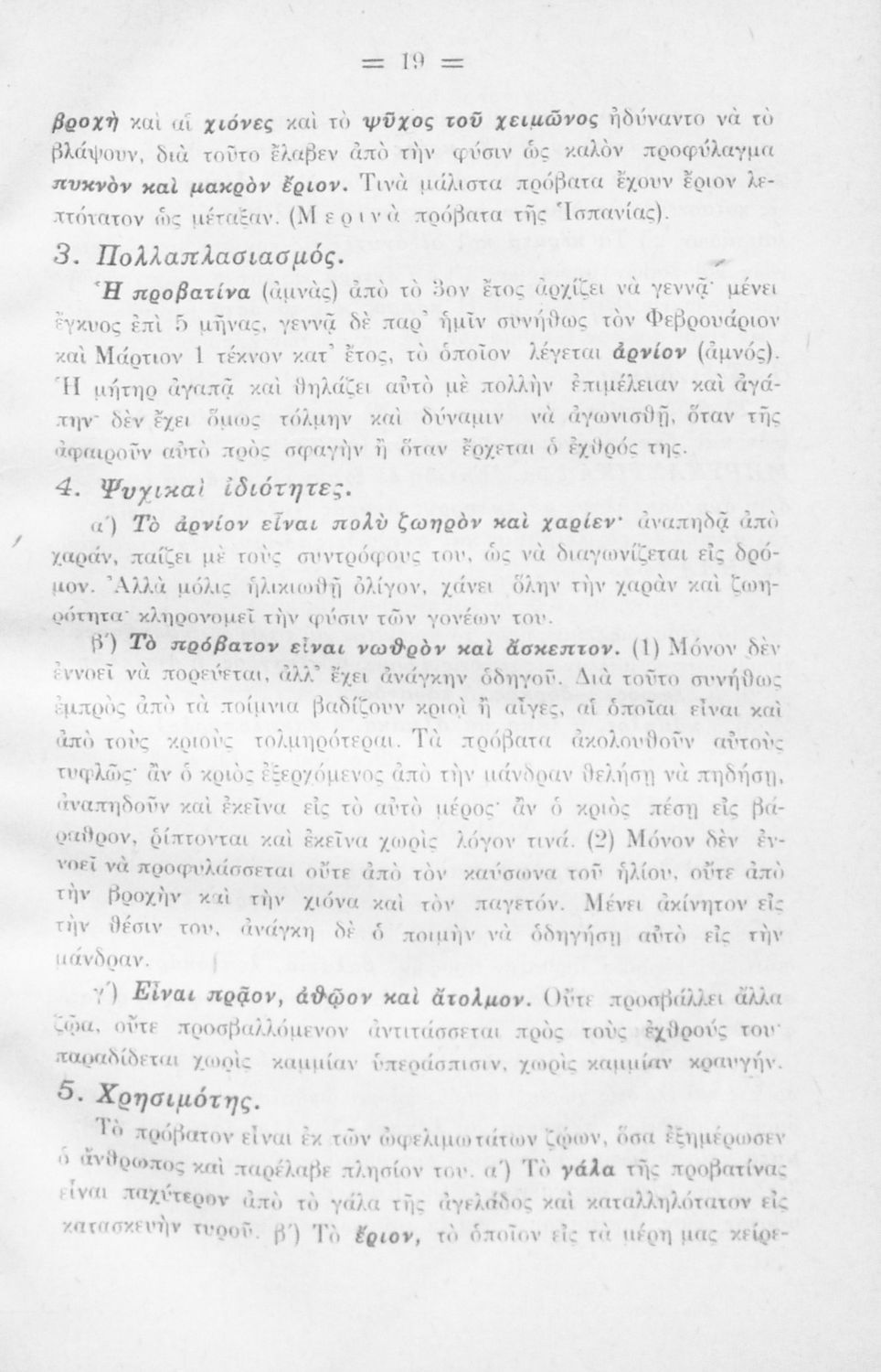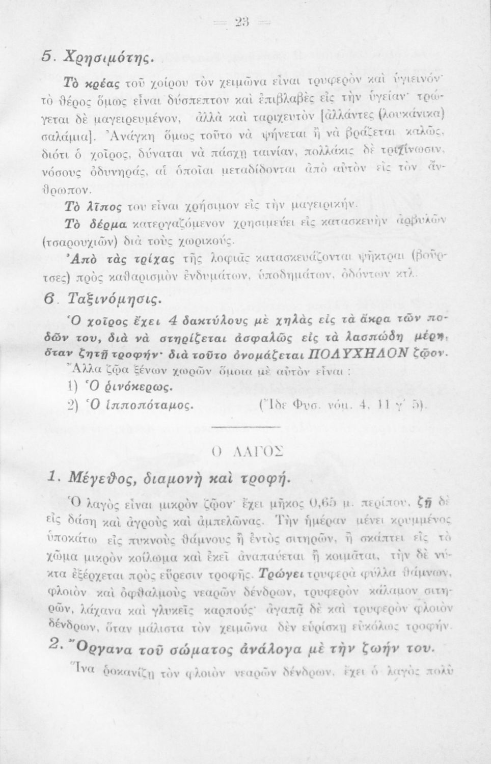 Σχολικό εγχειρίδιο Γεωγραφίας για την Α΄ Ελληνικών Σχολείων. Βιβλίο Φυσικής Ιστορίας με ζώα και φυτά που αναφέρονται οι χρήσεις τους, οι εχθροί και οι προφυλάξεις.