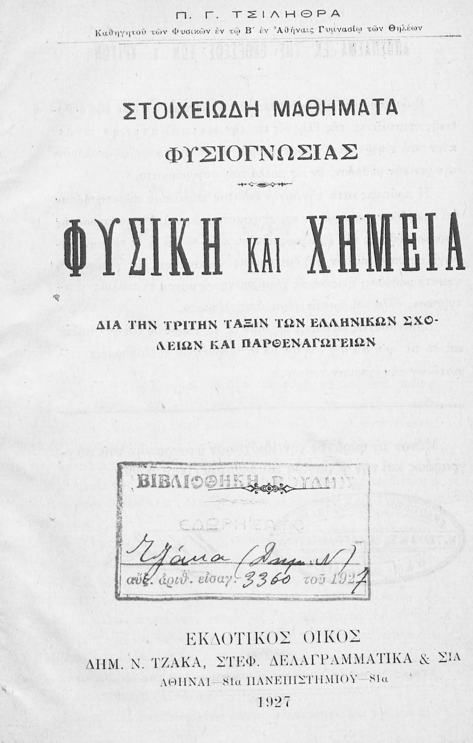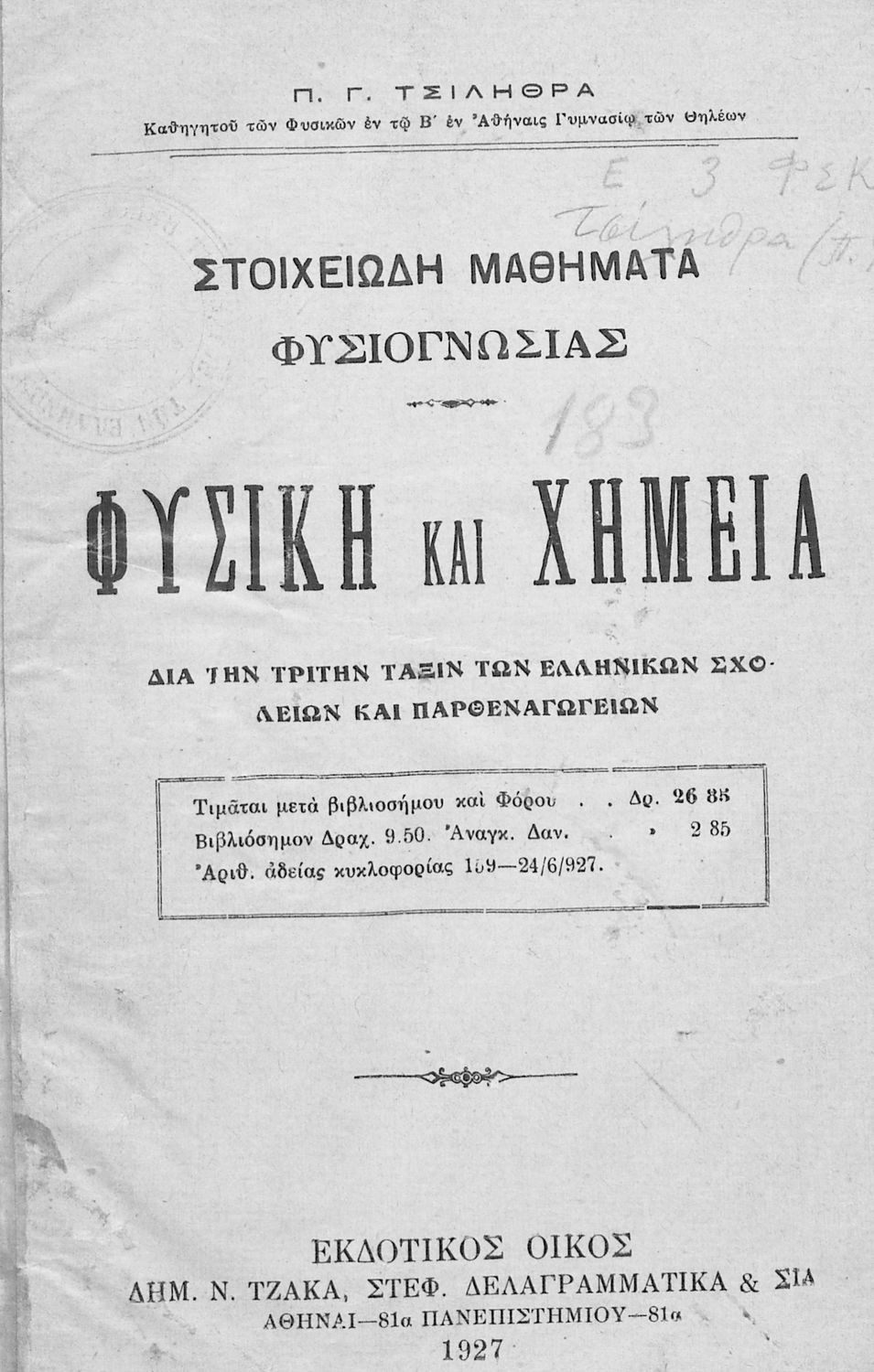 Τίτλος: Στοιχειώδη μαθήματα Φυσιογνωσίας. Φυσική και Χημεία. Δια την Τρίτη Τάξιν των Ελληνικών Σχολείων και Παρθεναγωγείων