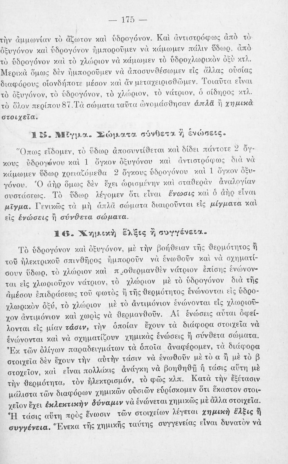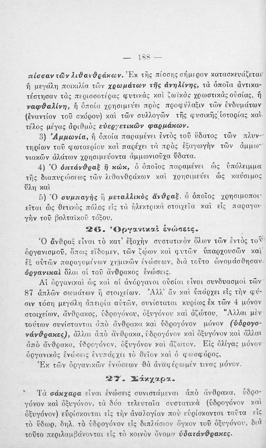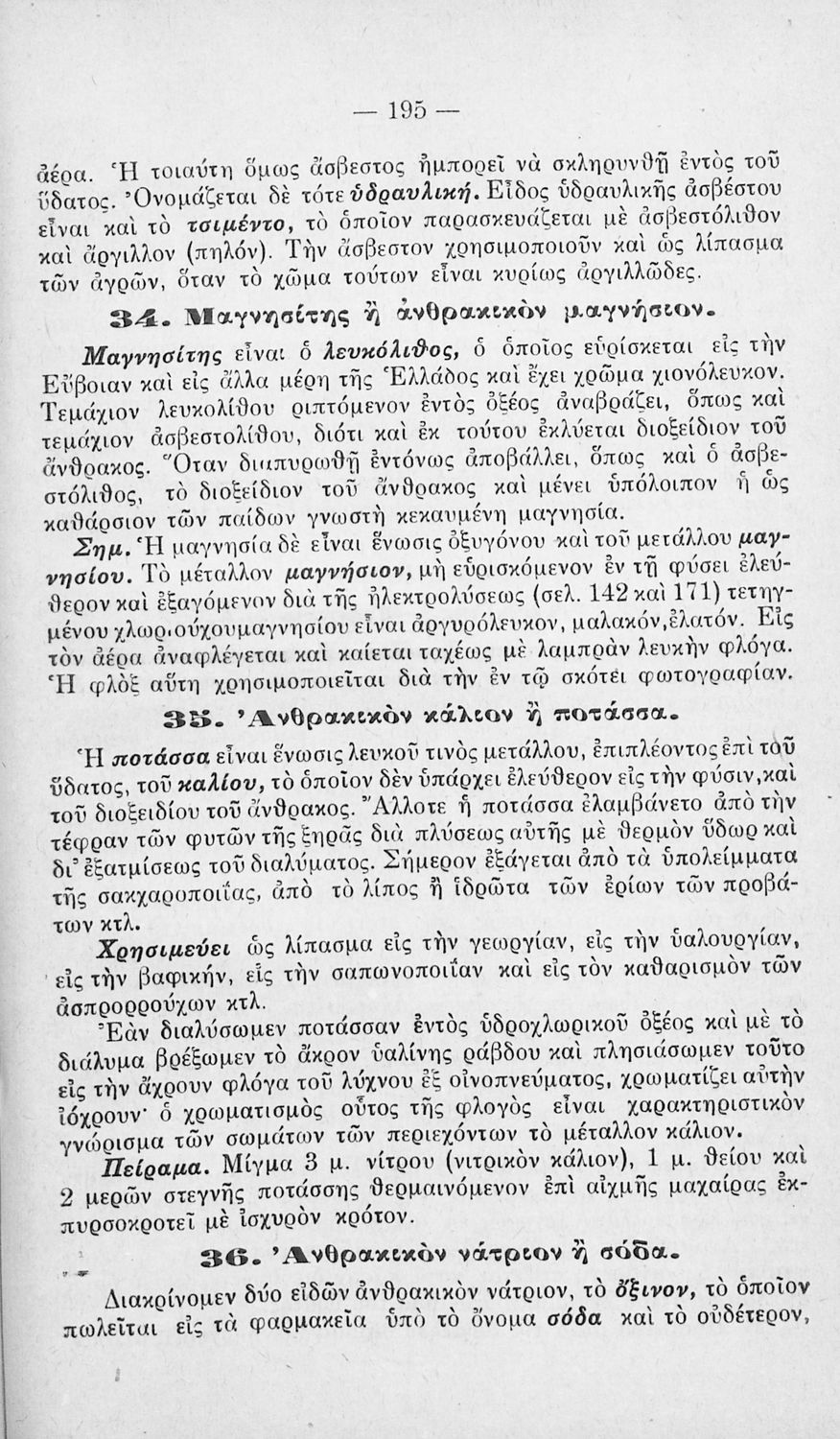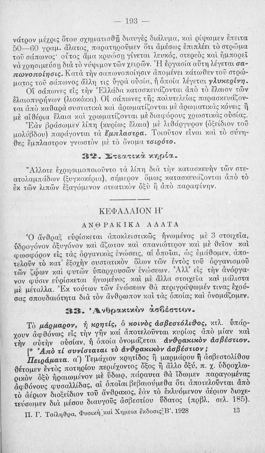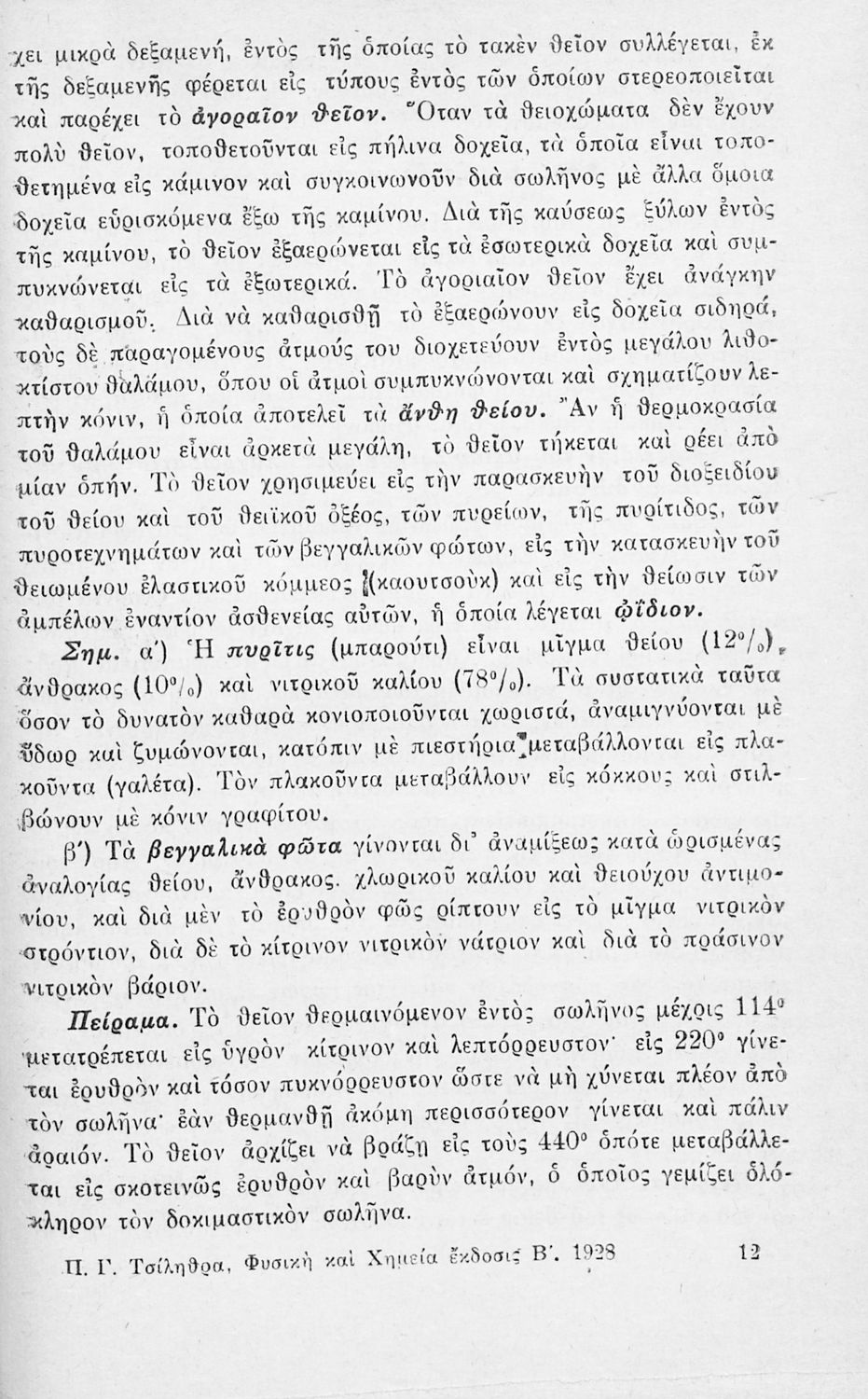 Σχολικό εγχειρίδιο Φυσικής και Χημείας της Γ' Τάξης των Ελληνικών Σχολείων και Παρθεναγωγείων. Το βιβλίο ξεκινάει παρουσιάζοντας τα βασικά στοιχεία ισορροπίας και κίνησης των στερεών σωμάτων και στη συνέχεια των υγρών και των αερίων. Μετά αναφέρεται στον ήχο, τη θερμότητα, το φως, στον ηλεκτρισμό και στον ηλεκτρομαγνητισμό. Στο δεύτερο μέρος, παρουσιάζει τα βασικά στοιχεία της χημείας, υδρογόνο, άζωτο, θείο, φώσφορο καθώς και τις διάφορες ενώσεις όπως το πετρέλαιο.