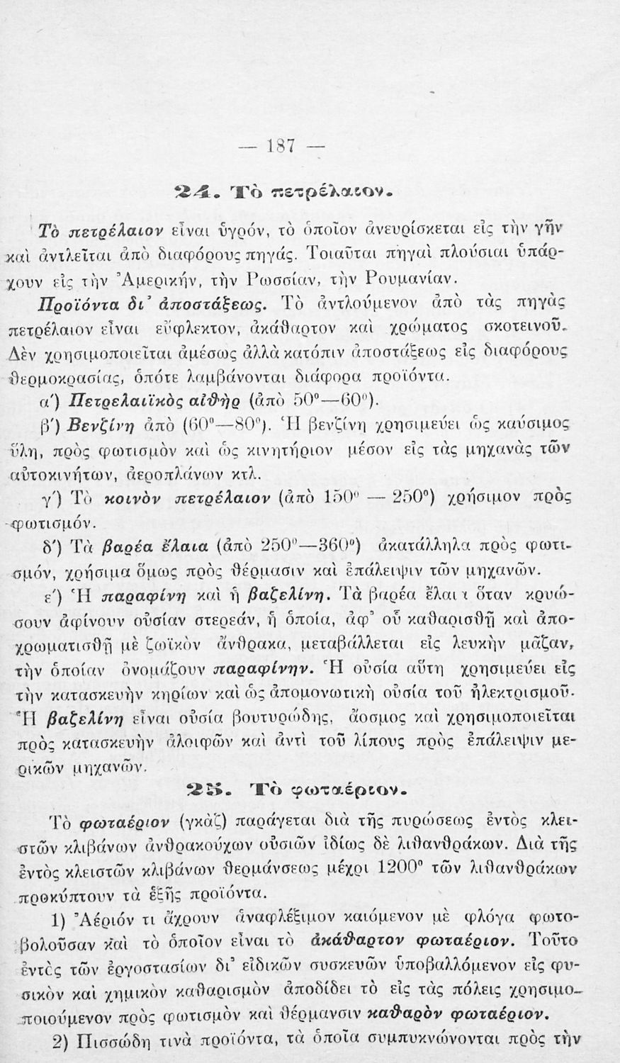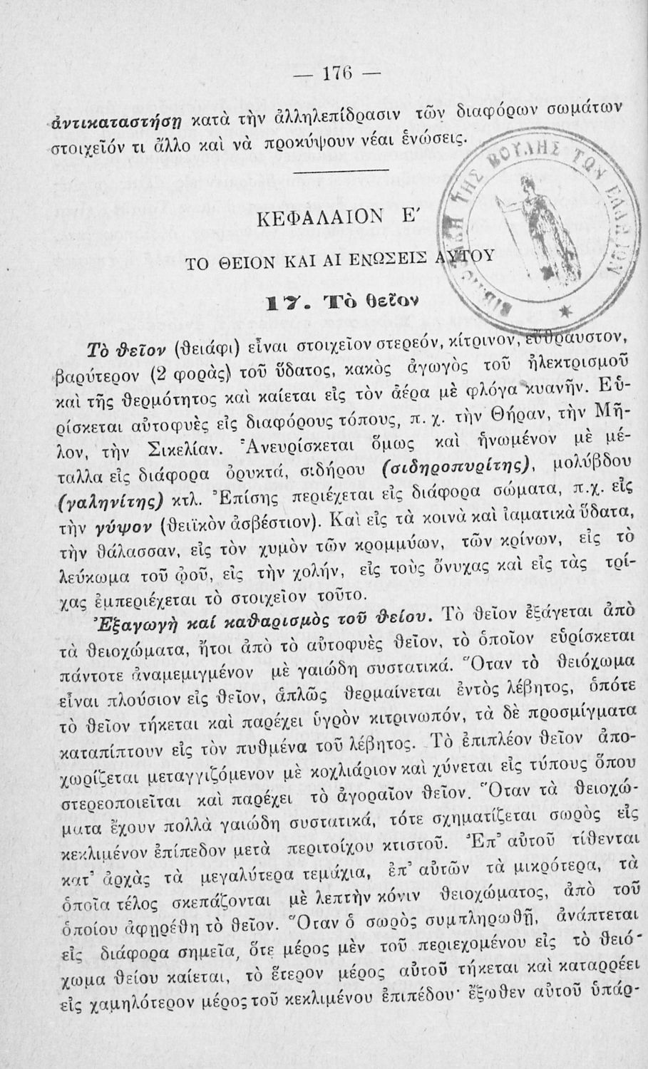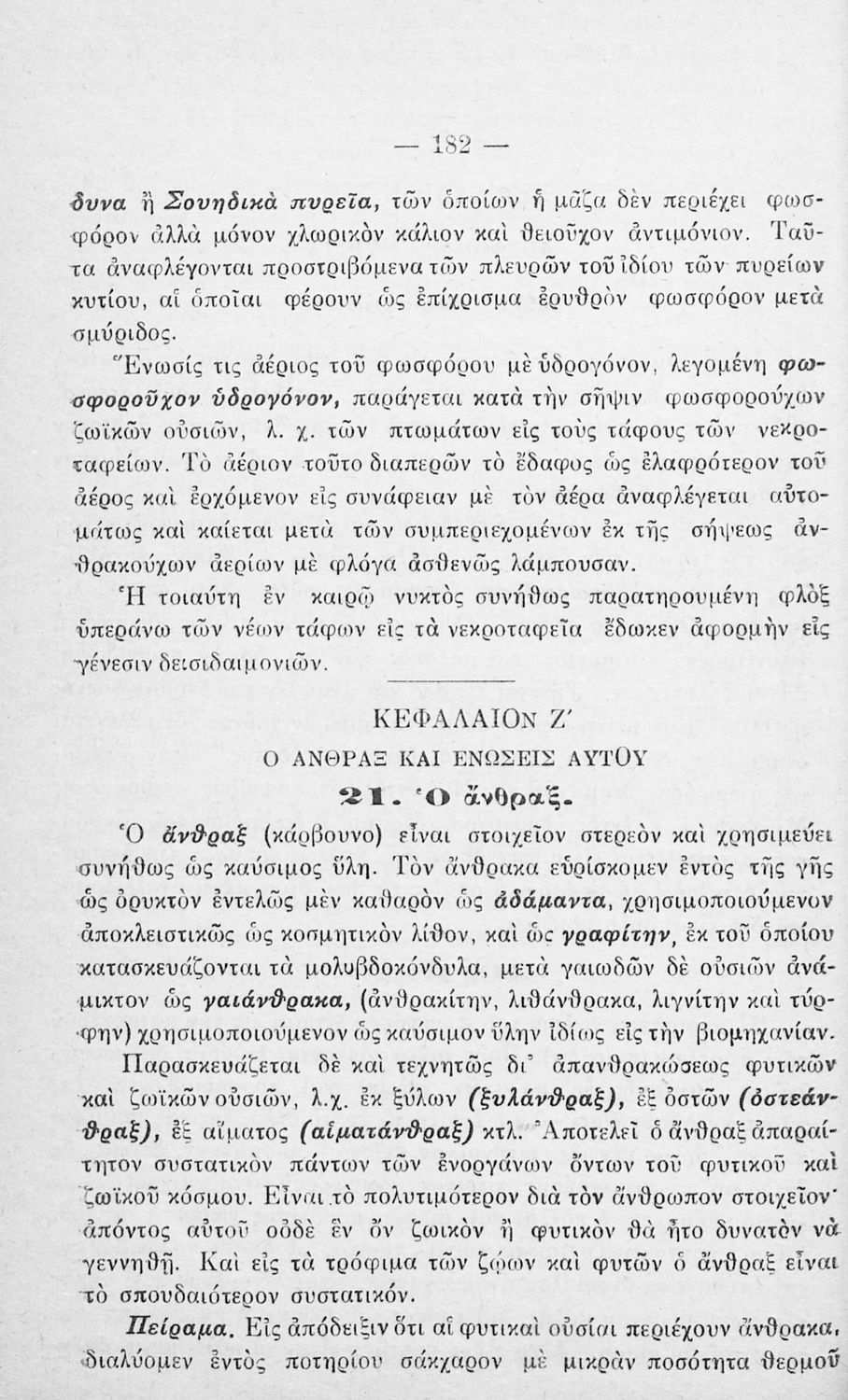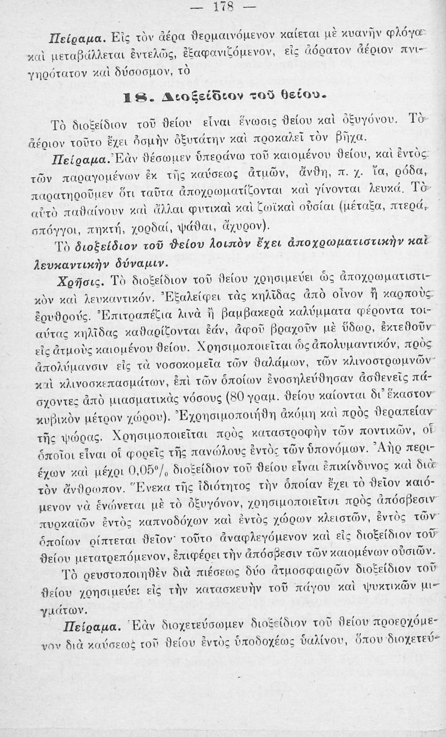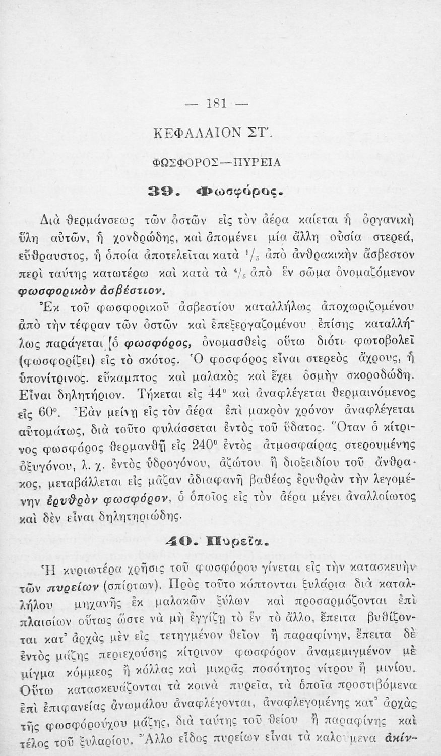 Σχολικό εγχειρίδιο Φυσικής και Χημείας της Γ' Τάξης των Ελληνικών Σχολείων και Παρθεναγωγείων. Το βιβλίο ξεκινάει παρουσιάζοντας τα βασικά στοιχεία ισορροπίας και κίνησης των στερεών σωμάτων και στη συνέχεια των υγρών και των αερίων. Μετά αναφέρεται στον ήχο, τη θερμότητα, το φως, στον ηλεκτρισμό και στον ηλεκτρομαγνητισμό. Στο δεύτερο μέρος, παρουσιάζει τα βασικά στοιχεία της χημείας, υδρογόνο, άζωτο, θείο, φώσφορο καθώς και τις διάφορες ενώσεις όπως το πετρέλαιο.