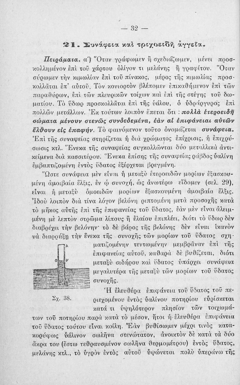 Σχολικό εγχειρίδιο Φυσικής και Χημείας της Γ' Τάξης των Ελληνικών Σχολείων και Παρθεναγωγείων. Το βιβλίο ξεκινάει παρουσιάζοντας τα βασικά στοιχεία ισορροπίας και κίνησης των στερεών σωμάτων και στη συνέχεια των υγρών και των αερίων. Μετά αναφέρεται στον ήχο, τη θερμότητα, το φως, στον ηλεκτρισμό και στον ηλεκτρομαγνητισμό. Στο δεύτερο μέρος, παρουσιάζει τα βασικά στοιχεία της χημείας, υδρογόνο, άζωτο, θείο, φώσφορο καθώς και τις διάφορες ενώσεις όπως το πετρέλαιο.