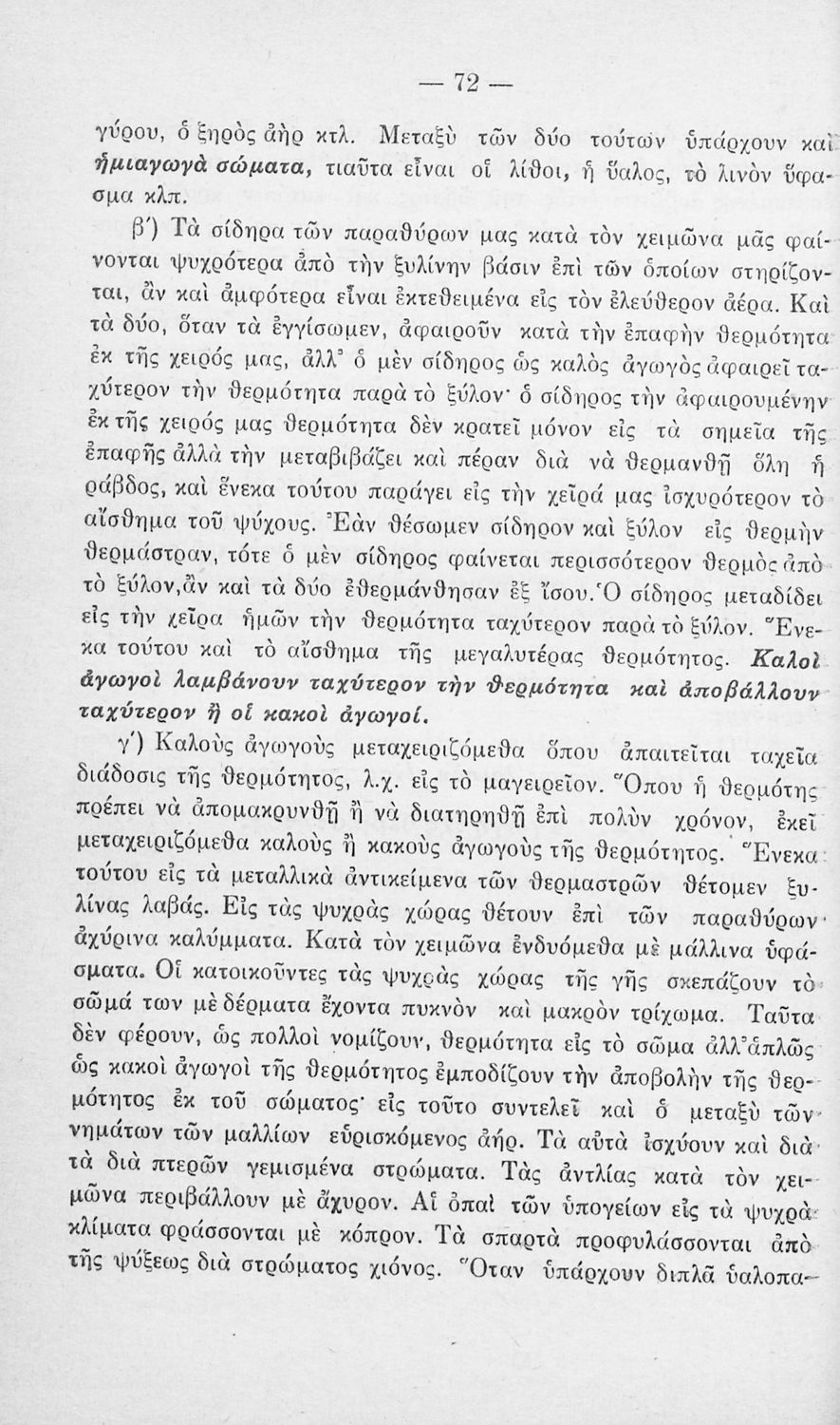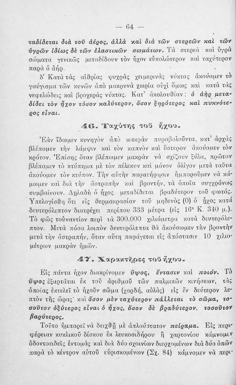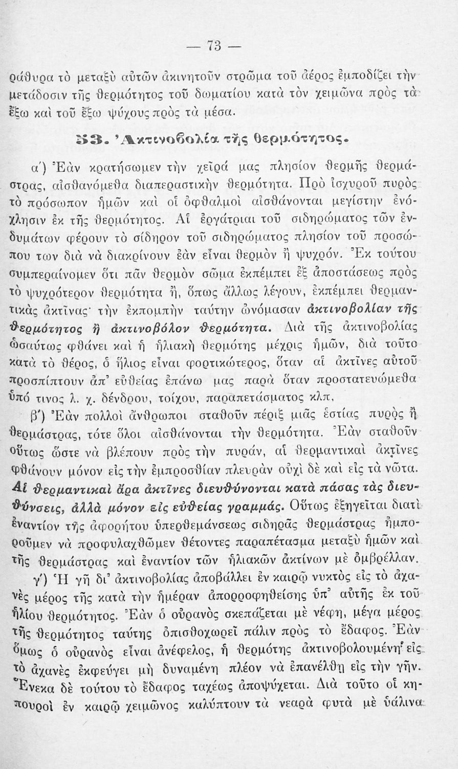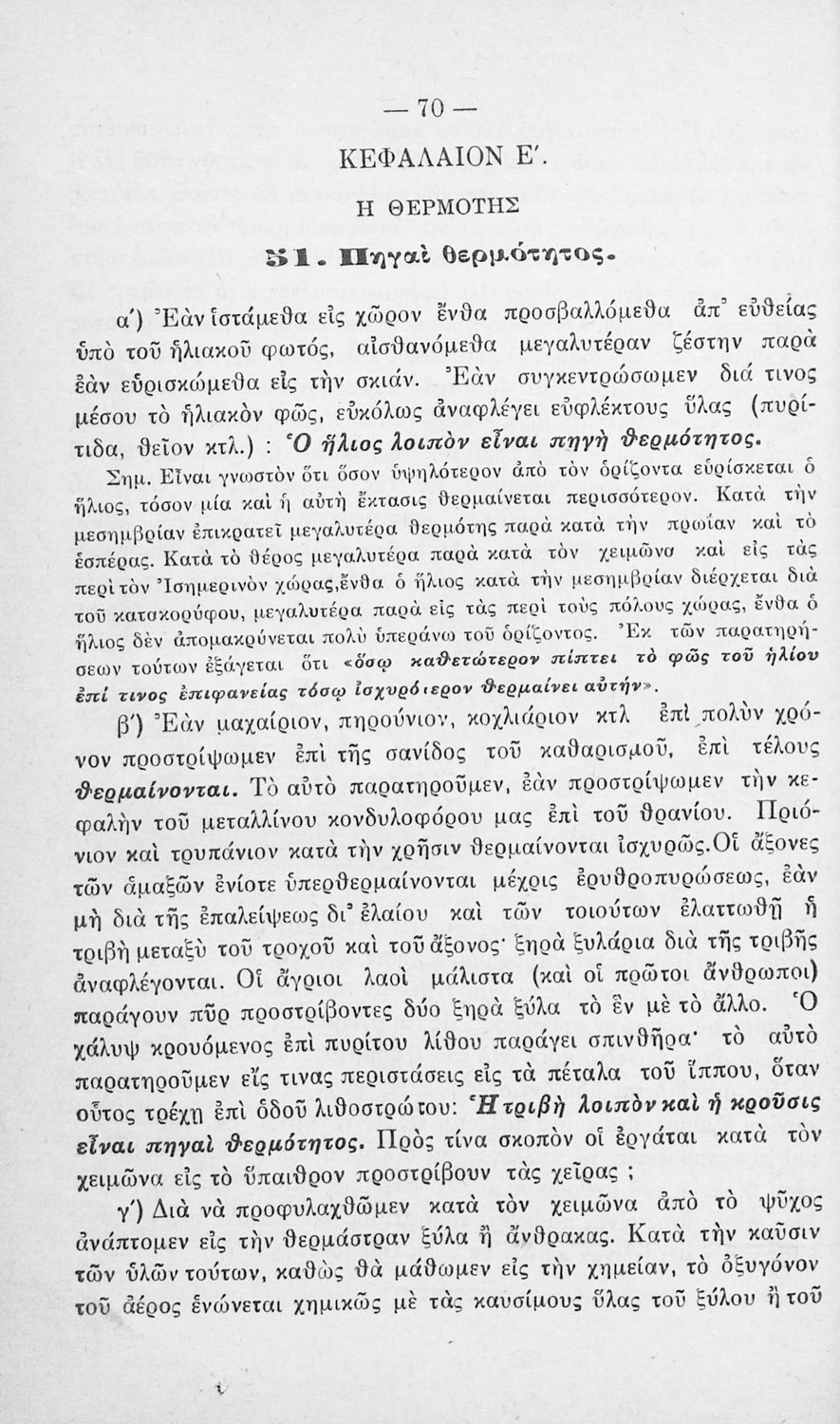 Σχολικό εγχειρίδιο Φυσικής και Χημείας της Γ' Τάξης των Ελληνικών Σχολείων και Παρθεναγωγείων. Το βιβλίο ξεκινάει παρουσιάζοντας τα βασικά στοιχεία ισορροπίας και κίνησης των στερεών σωμάτων και στη συνέχεια των υγρών και των αερίων. Μετά αναφέρεται στον ήχο, τη θερμότητα, το φως, στον ηλεκτρισμό και στον ηλεκτρομαγνητισμό. Στο δεύτερο μέρος, παρουσιάζει τα βασικά στοιχεία της χημείας, υδρογόνο, άζωτο, θείο, φώσφορο καθώς και τις διάφορες ενώσεις όπως το πετρέλαιο.