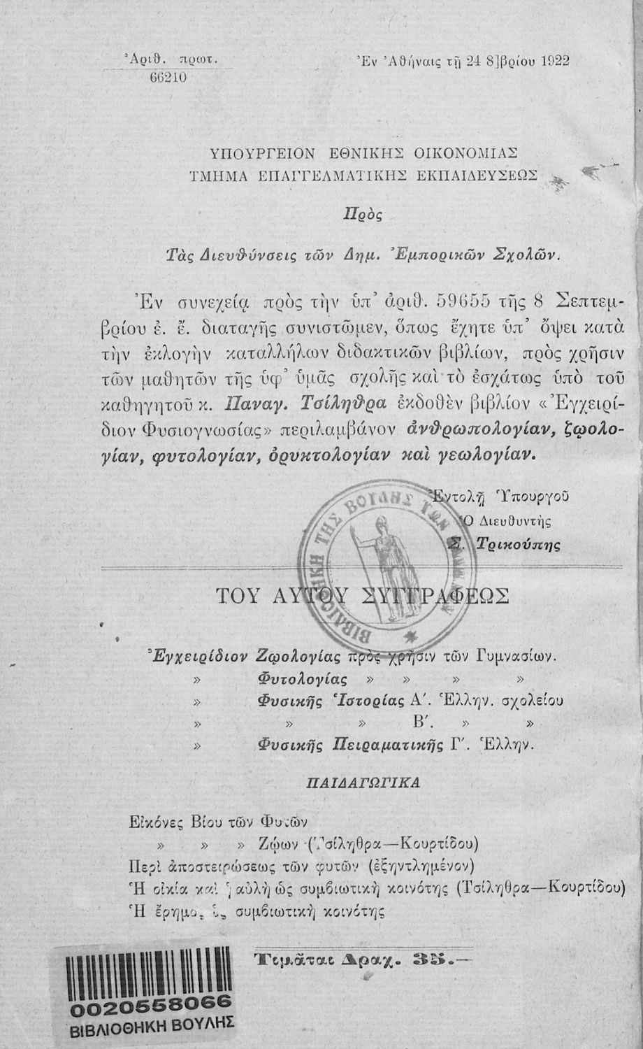 Τίτλος: Μεθοδικόν Εγχειρίδιον Φυσιογνωσίας περιλαμβάνον στοιχεία Ανθρωπολογίας, Ζωολογίας, Φυτολογίας, Ορυκτολογίας και Γεωλογίας δια τους μαθητάς και μαθητρίας των Εμπορικών Σχολών