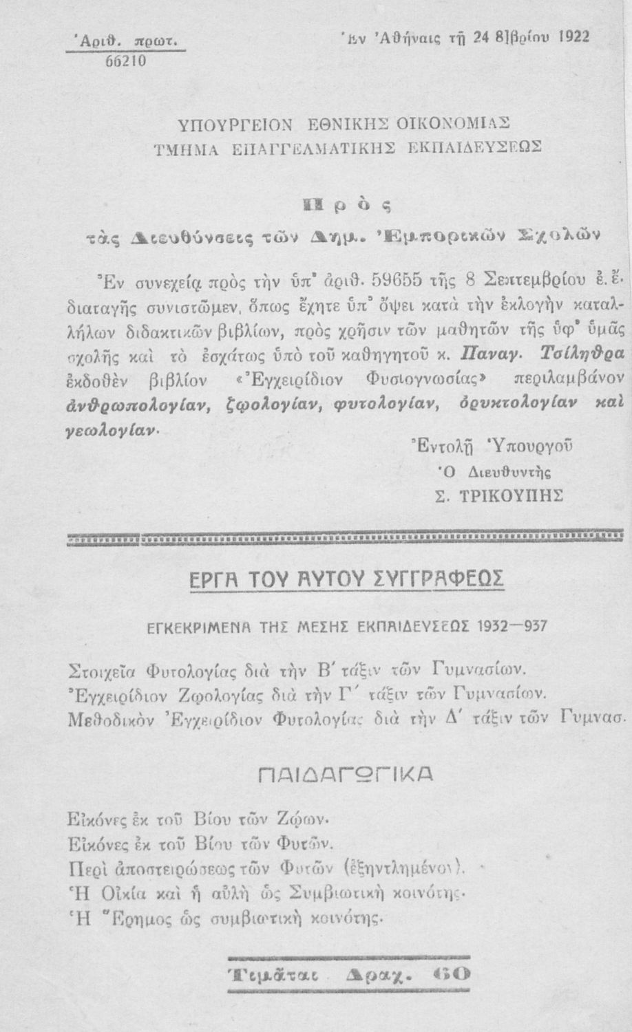 Τίτλος: Μεθοδικόν Εγχειρίδιον Φυσιογνωσίας περιλαμβάνον στοιχεία Ανθρωπολογίας, Ζωολογίας, Φυτολογίας, Ορυκτολογίας και Γεωλογίας δια τους μαθητάς και μαθητρίας των Εμπορικών Σχολών