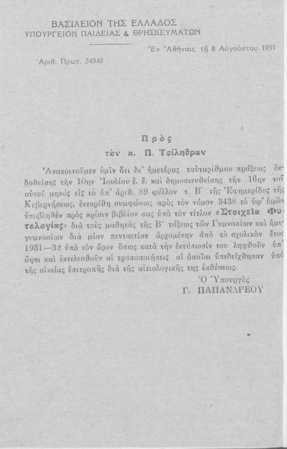 Σχολικό εγχειρίδιο Φυτολογίας για τη Β΄ τάξη Ημιγυμνασίων και Εξαταξίων Γυμνασίων με πληροφορίες για φυτά της ελληνικής φύσης και πληροφορίες για την καλλιέργεια τους. Το βιβλίο είχε εγκριθεί σε διαγωνισμό για