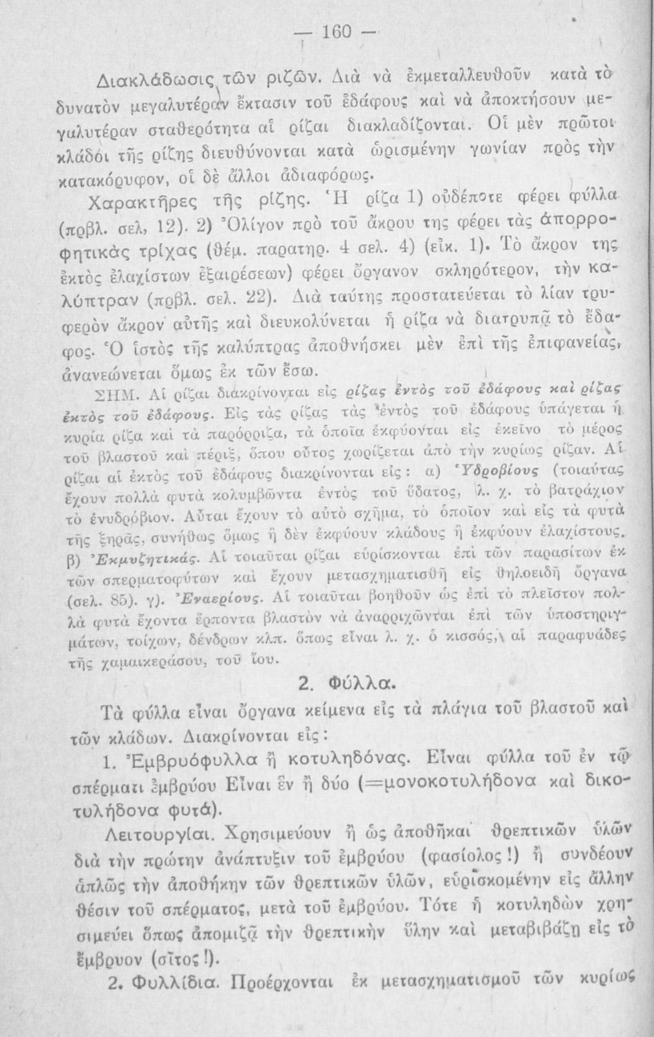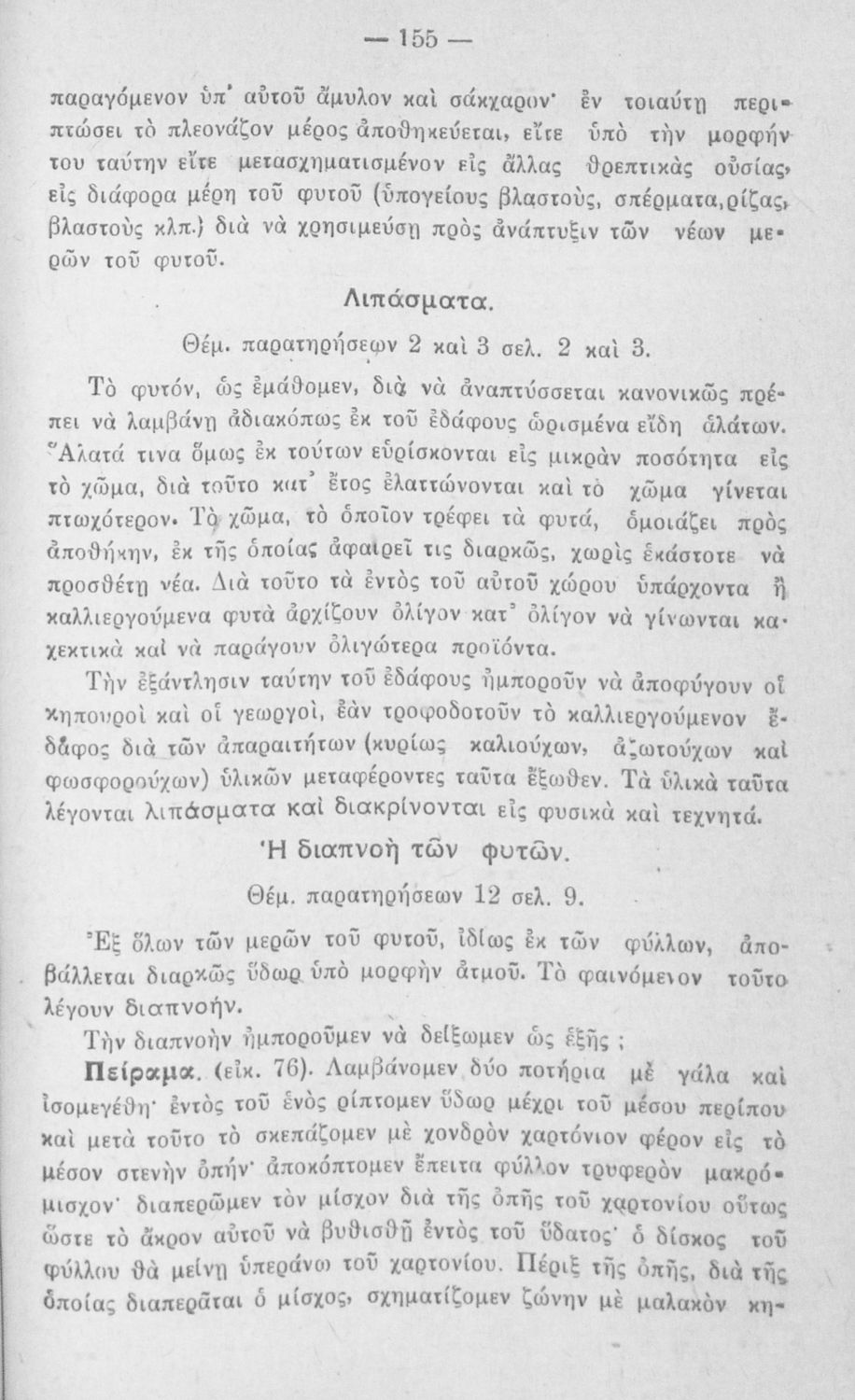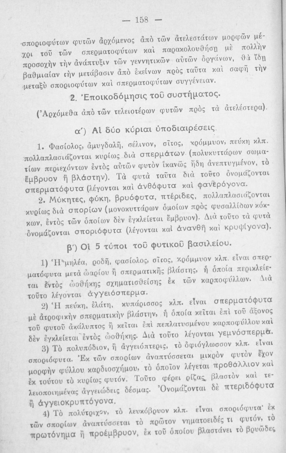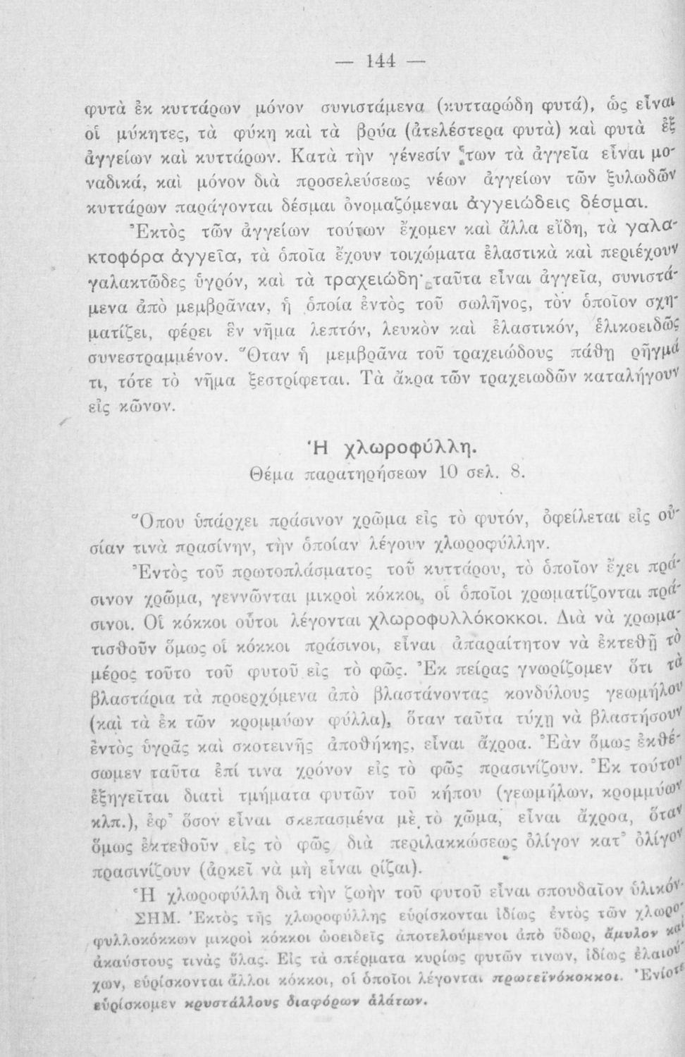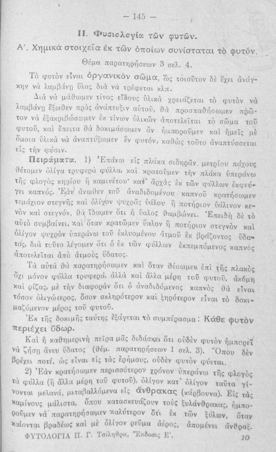Σχολικό εγχειρίδιο της Δ΄ Γυμνασίου για το μάθημα της Φυτολογίας. Το εγχειρίδιο αποτελείται από δύο μέρη, το ειδικό και το γενικό μέρος. Το ειδικό μέρος περιλαμβάνει την προετοιμασία των μαθητών για την καλύτερη μάθηση και επεξεργασία της ύλης του μαθήματος, την σχέση των φυτών από το κλίμα που επικρατεί σε κάθε περιοχή και τις φυσικές ιδιότητες κάθε φυτού. Το γενικό μέρος ασχολείται με την ανατομία και την φυσιολογία των φυτών (εσωτερική κατασκευή των φυτών).