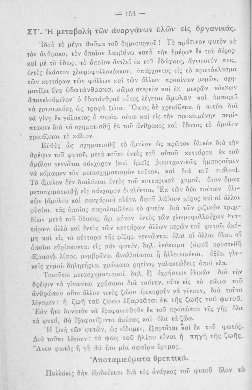Βαθμίδα εκπαίδευσης: Δευτεροβάθμια Τάξη: Δ' Γυμνασίου Μάθημα: Φυτολογία Γλώσσα: Καθαρεύουσα Παρουσίαση περιεχομένου: Σχολικό εγχειρίδιο της Δ΄ Γυμνασίου για το μάθημα της Φυτολογίας. Το εγχειρίδιο αποτελείται από δύο μέρη, το ειδικό και το γενικό μέρος. Το ειδικό μέρος περιλαμβάνει την προετοιμασία των μαθητών για την καλύτερη μάθηση και επεξεργασία της ύλης του μαθήματος, την σχέση των φυτών από το κλίμα που επικρατεί σε κάθε περιοχή και τις φυσικές ιδιότητες κάθε φυτού. Το γενικό μέρος ασχολείται με την ανατομία και την φυσιολογία των φυτών (εσωτερική κατασκευή των φυτών). |