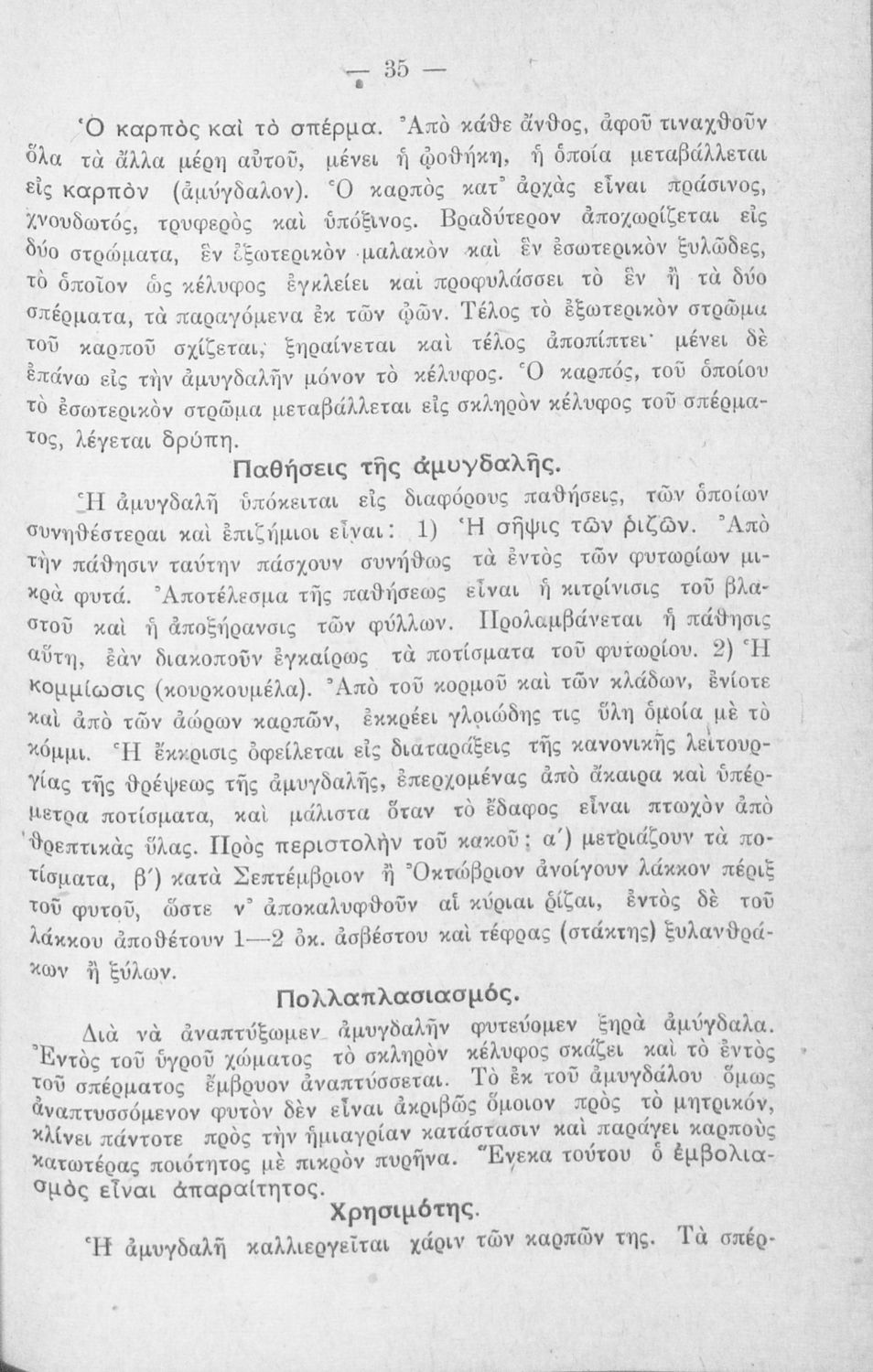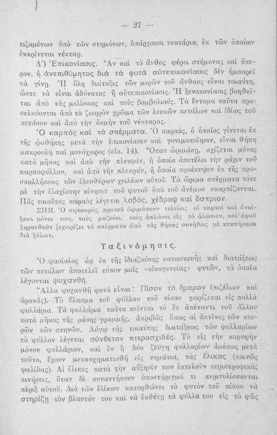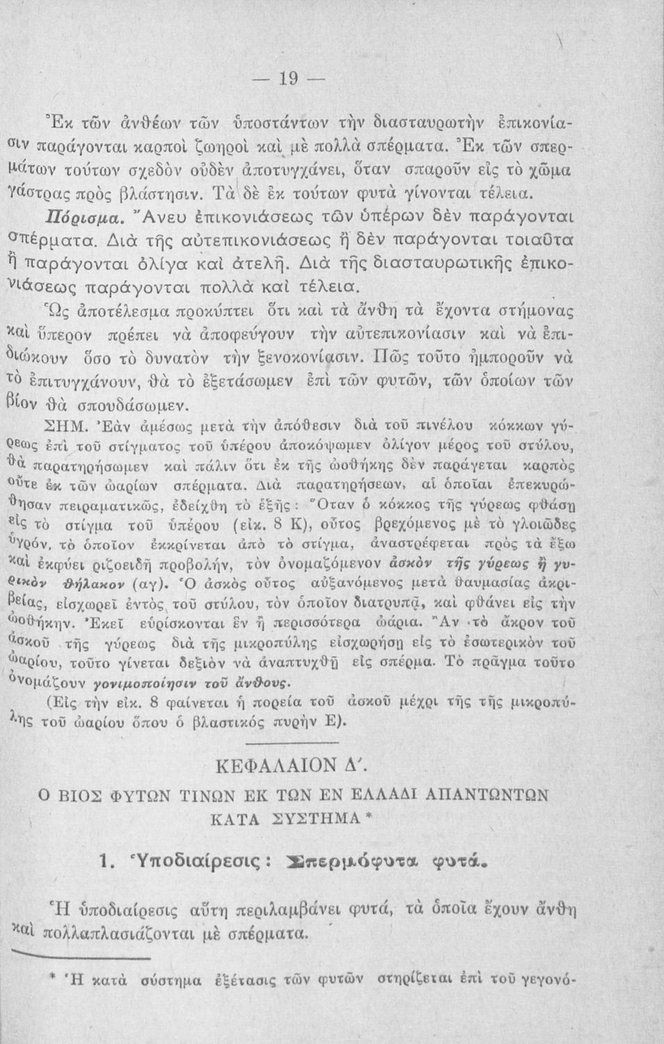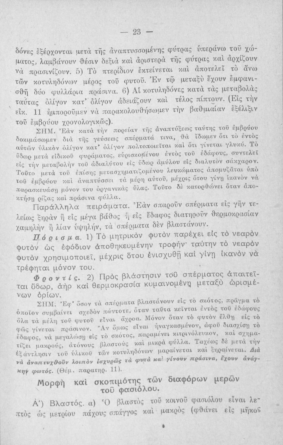 Σχολικό εγχειρίδιο της Δ΄ Γυμνασίου για το μάθημα της Φυτολογίας. Το εγχειρίδιο αποτελείται από δύο μέρη, το ειδικό και το γενικό μέρος. Το ειδικό μέρος περιλαμβάνει την προετοιμασία των μαθητών για την καλύτερη μάθηση και επεξεργασία της ύλης του μαθήματος, την σχέση των φυτών από το κλίμα που επικρατεί σε κάθε περιοχή και τις φυσικές ιδιότητες κάθε φυτού. Το γενικό μέρος ασχολείται με την ανατομία και την φυσιολογία των φυτών (εσωτερική κατασκευή των φυτών).