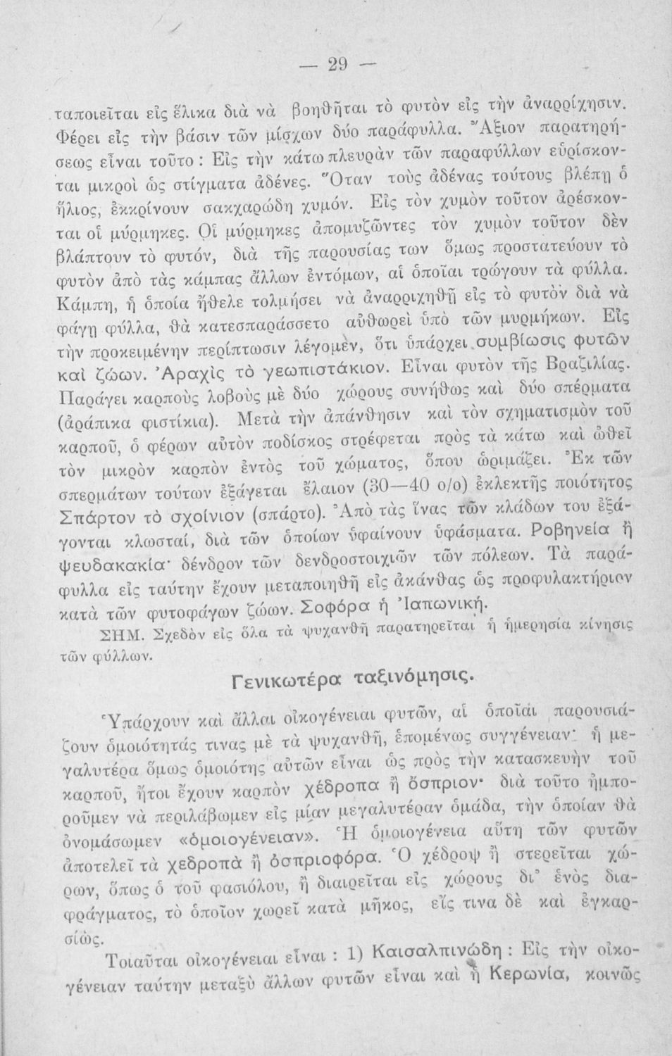 Βαθμίδα εκπαίδευσης: Δευτεροβάθμια Τάξη: Δ' Γυμνασίου Μάθημα: Φυτολογία Γλώσσα: Καθαρεύουσα Παρουσίαση περιεχομένου: Σχολικό εγχειρίδιο της Δ΄ Γυμνασίου για το μάθημα της Φυτολογίας. Το εγχειρίδιο αποτελείται από δύο μέρη, το ειδικό και το γενικό μέρος. Το ειδικό μέρος περιλαμβάνει την προετοιμασία των μαθητών για την καλύτερη μάθηση και επεξεργασία της ύλης του μαθήματος, την σχέση των φυτών από το κλίμα που επικρατεί σε κάθε περιοχή και τις φυσικές ιδιότητες κάθε φυτού. Το γενικό μέρος ασχολείται με την ανατομία και την φυσιολογία των φυτών (εσωτερική κατασκευή των φυτών). |