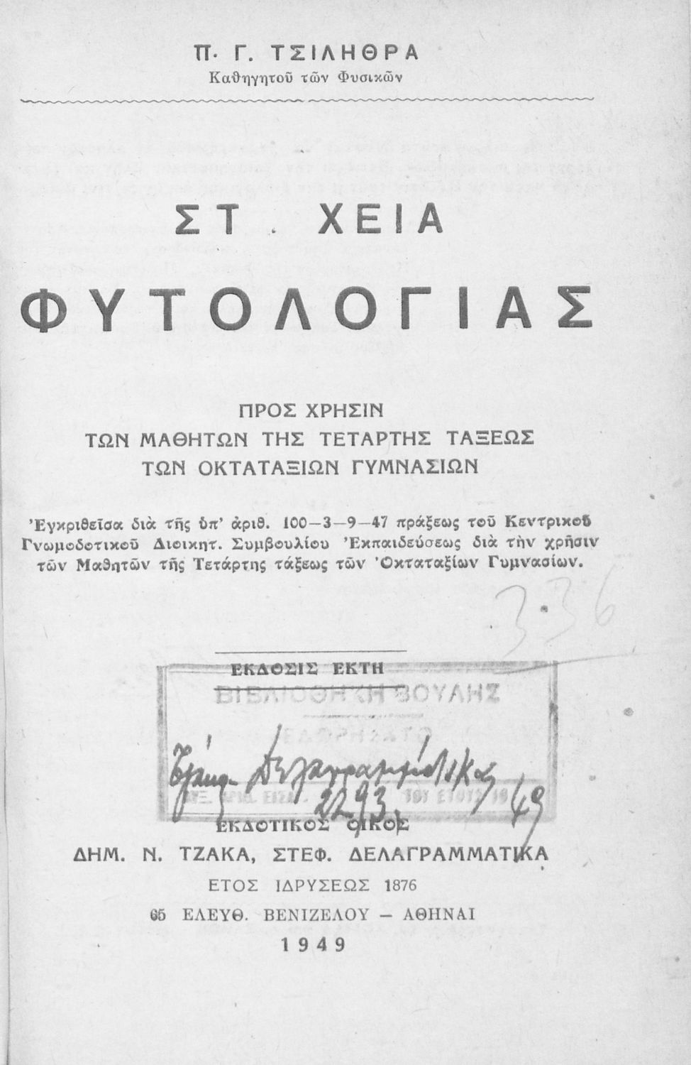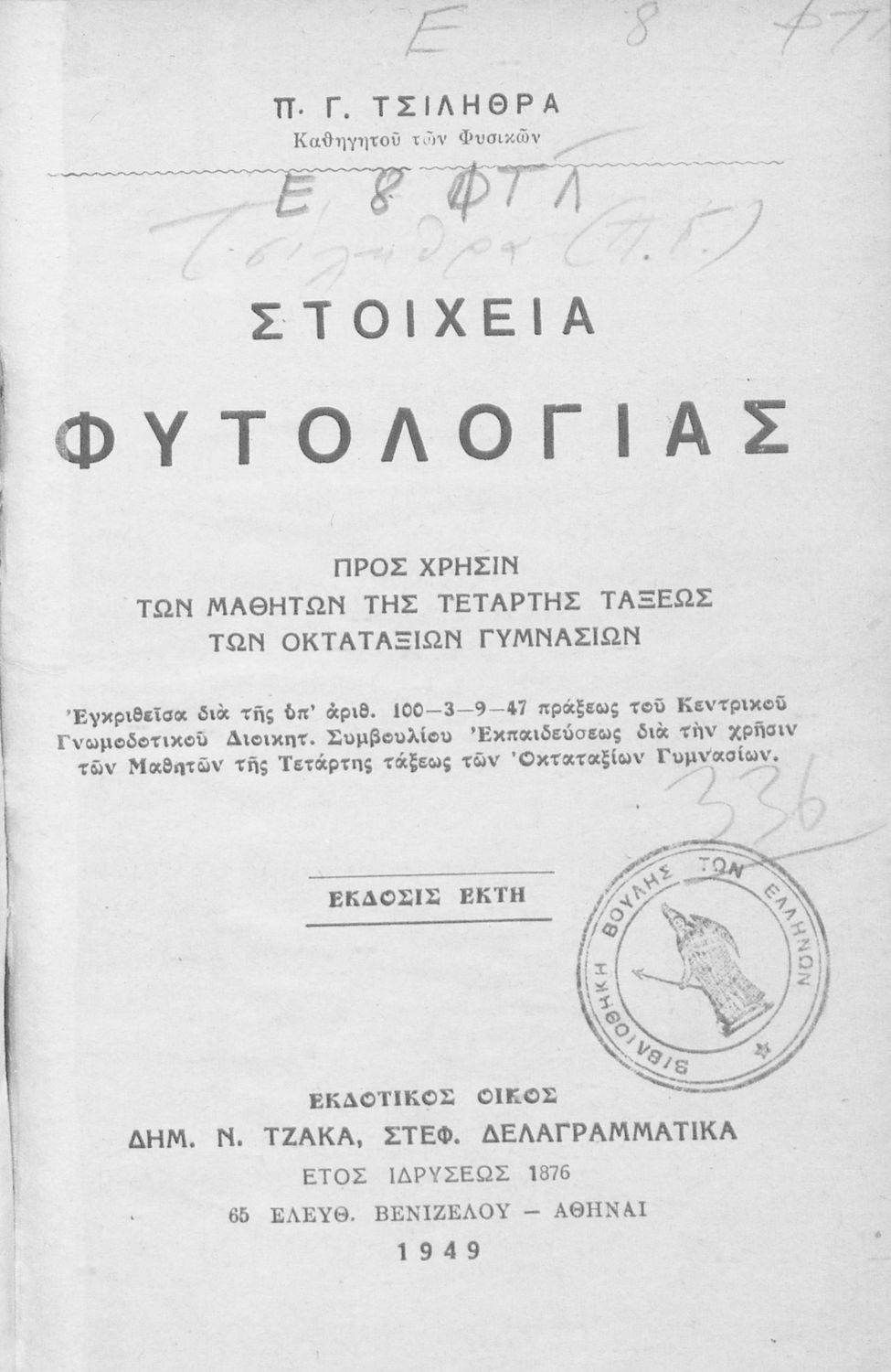 Σχολικό εγχειρίδιο Φυτολογίας για τη Β΄ τάξη των Εξαταξίων Γυμνασίων και Ημιγυμνασίων και τη Δ΄ τάξη των οκταταξίων Γυμνασίων που εξετάζει φυτά της Ελλάδας και παραθέτει στοιχεία γενικής φυτολογίας για την ...