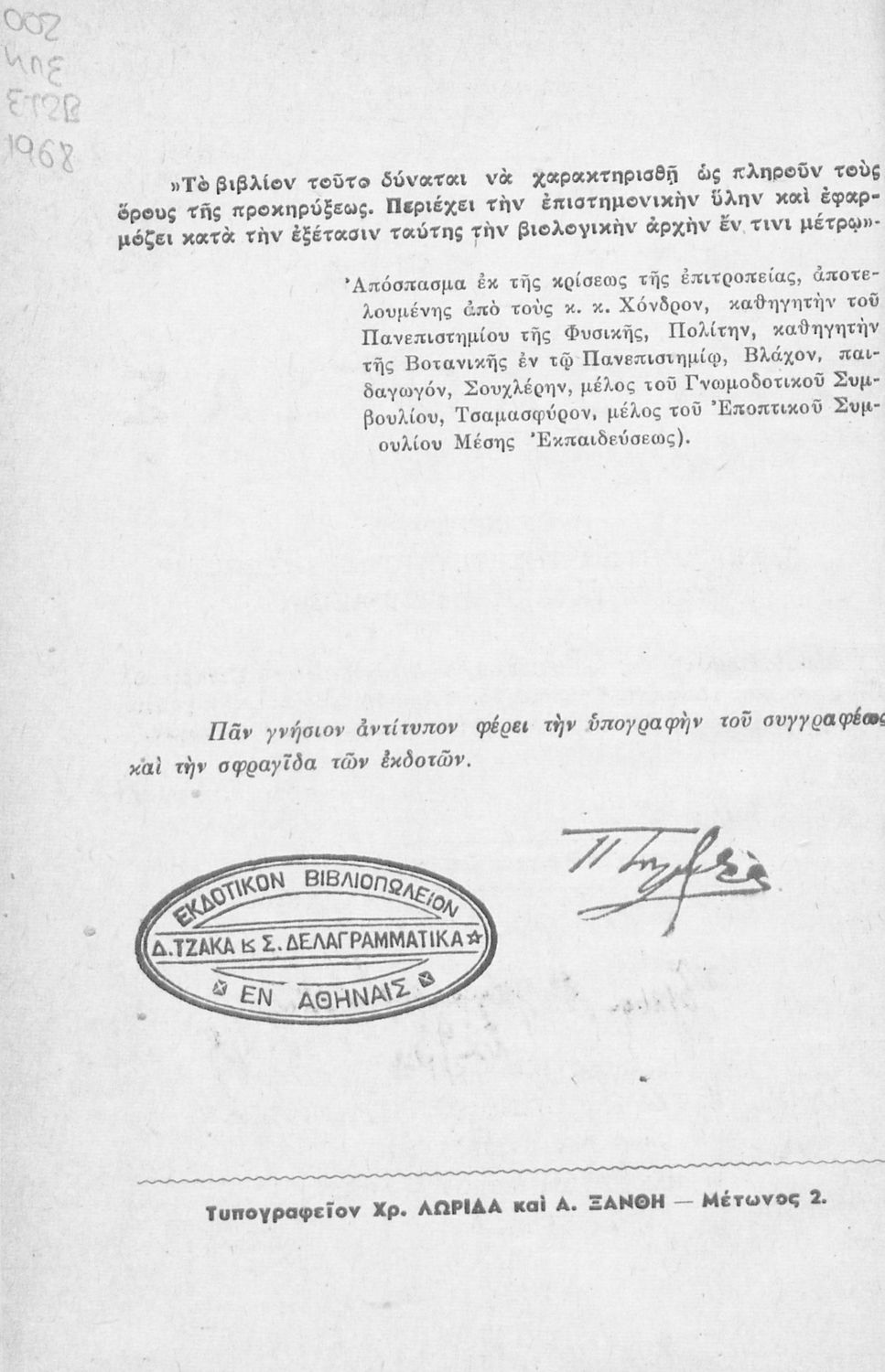 Σχολικό εγχειρίδιο Ζωολογίας για την Γ΄ Γυμνασίου χωρισμένο σε δύο ενότητες: την περιγραφική και τη γενική ζωολογία. Ο συγγραφέας ήταν πρώην καθηγητής πανεπιστημίου.