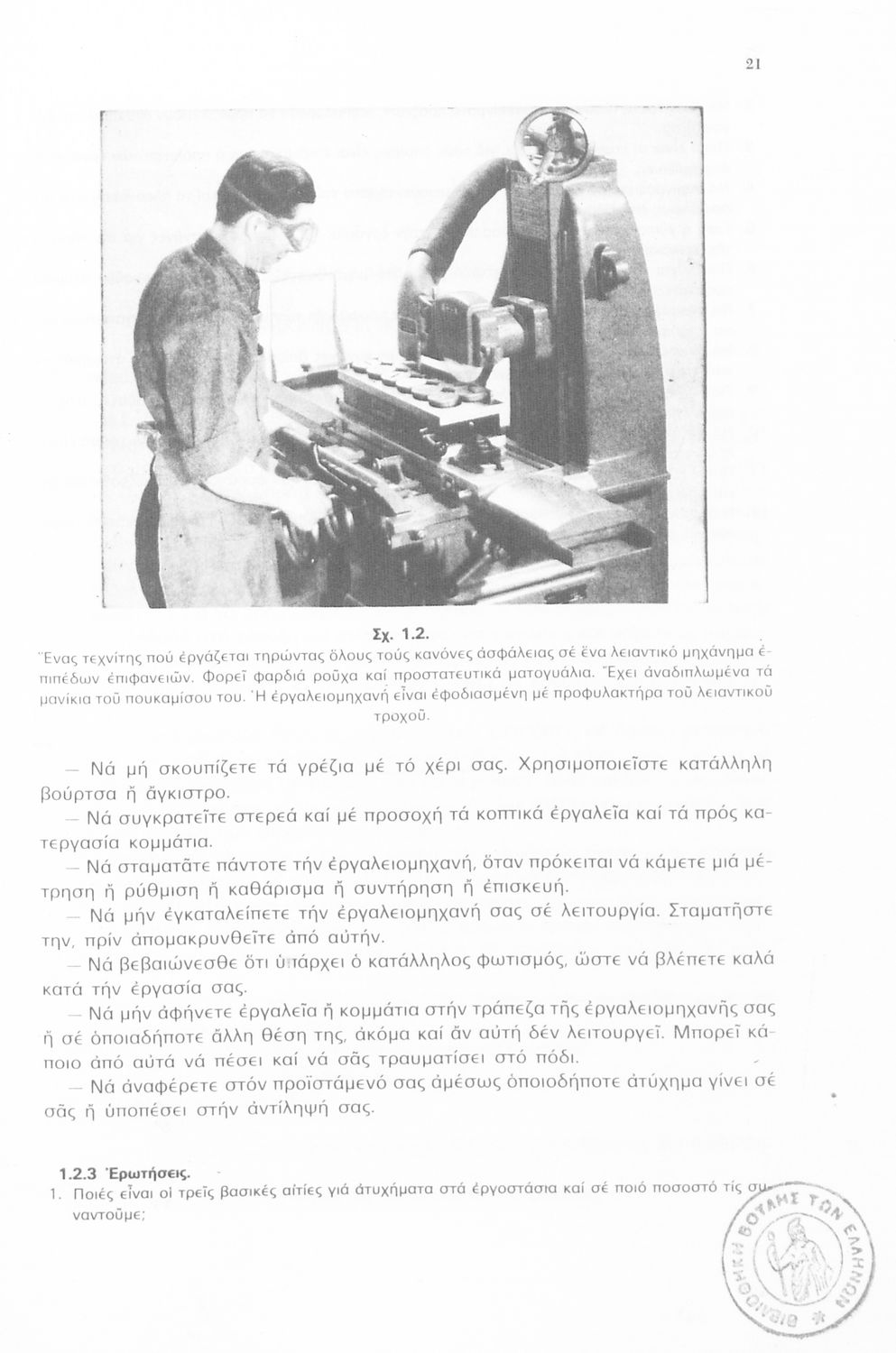 Μαθητικό βοήθημα Β' Τεχνικού Λυκείου το οποίο παρουσιάζει τις κατεργασίες κοπής μετάλλου και εργαλειομηχανών κοπής. Επίσης αναφέρεται στις μηχανουργικές μετρήσεις και τα μηχανουργικά υλικά. Το βιβλίο χωρίζεται σε τρία μέρη, περιγράφει το μηχανουργείο, την οργάνωση και τη λειτουργία του. Στο δεύτερο περιγράφει τις θεμελιώδεις αρχές της κοπής των μετάλλων και κατόπιν μελετά τη δομή των εργαλειομηχανών. Τέλος, στο τρίτο μέρος αναφέρεται στη συντήρηση των εργαλειομηχανών και αναλύει την εκτέλεση των βασικών κατεργασιών κοπής όπως το τρυπάνισμα και το πλάνισμα.