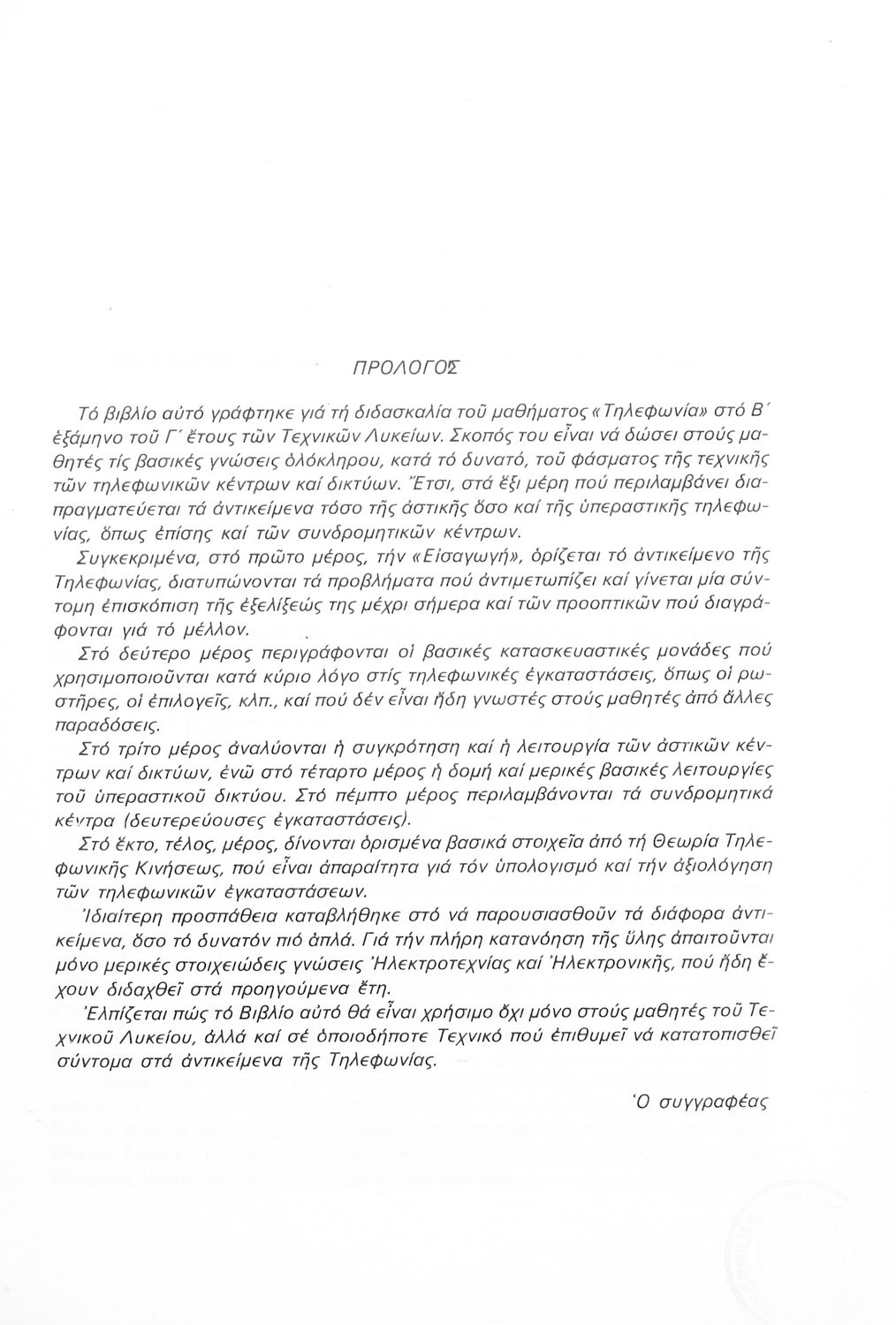Μαθητικό βοήθημα Γ' Τεχνικού Λυκείου. Το βιβλίο εισάγει τους μαθητές στη γνώση της τεχνικής των τηλεφωνικών κέντρων. Ξεκινά με μια εισαγωγή στην τηλεπικοινωνία και συνεχίζει με τις βασικές κατασκευαστικές μονάδες, ενώ αναλύει τη δομή και τη λειτουργία των αστικών κέντρων και δικτύων.