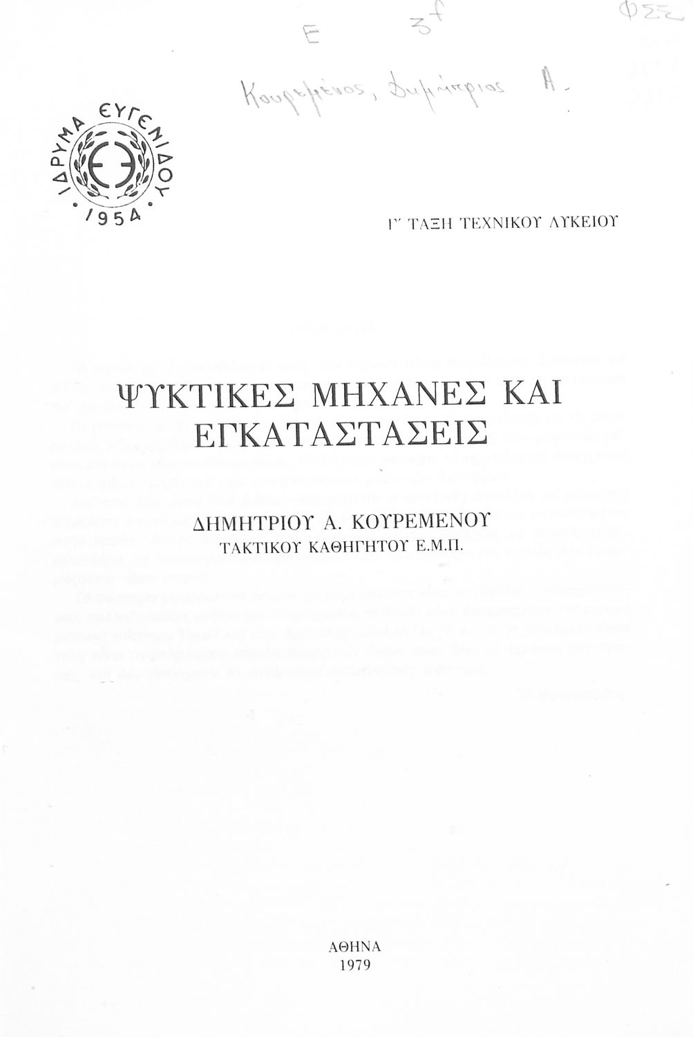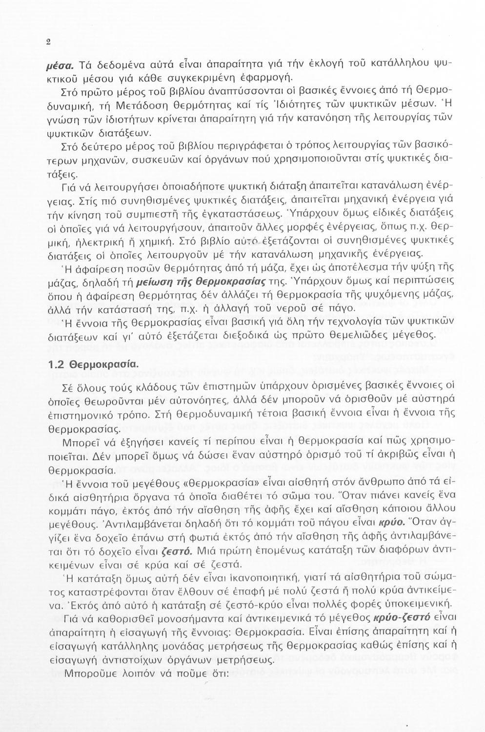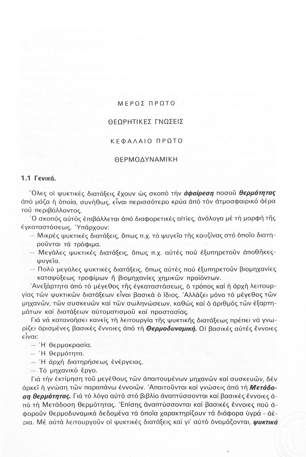 Σχολικό εγχειρίδιο Γ' Τεχνικού Λυκείου το οποίο ασχολείται με τη λειτουργία και τη σύνθεση των ψυκτικών διατάξεων. Χωρίζεται σε δύο μέρη. Το θεωρητικό κομμάτι το οποίο περιέχει ζητήματα θερμοδυναμικής, τη γνώση των ψυκτικών μέσων και τη μετάδοση θερμότητας. Το δεύτερο μέρος, περιέχει την τεχνολογική περιγραφή των κύριων τμημάτων των ψυκτικών διατάξεων.