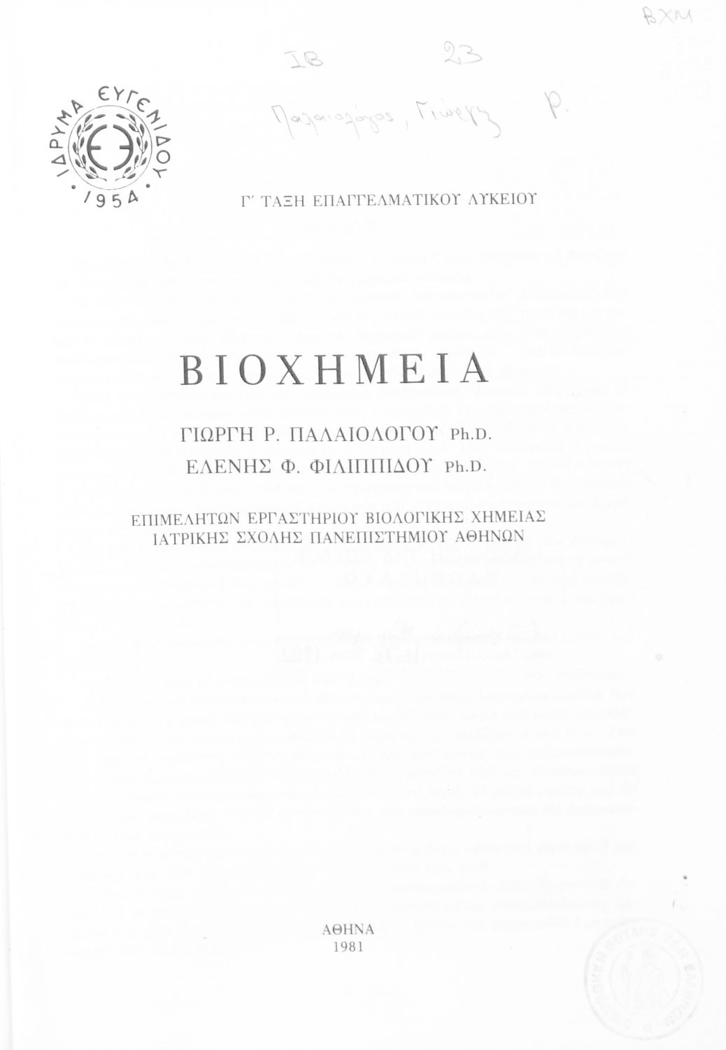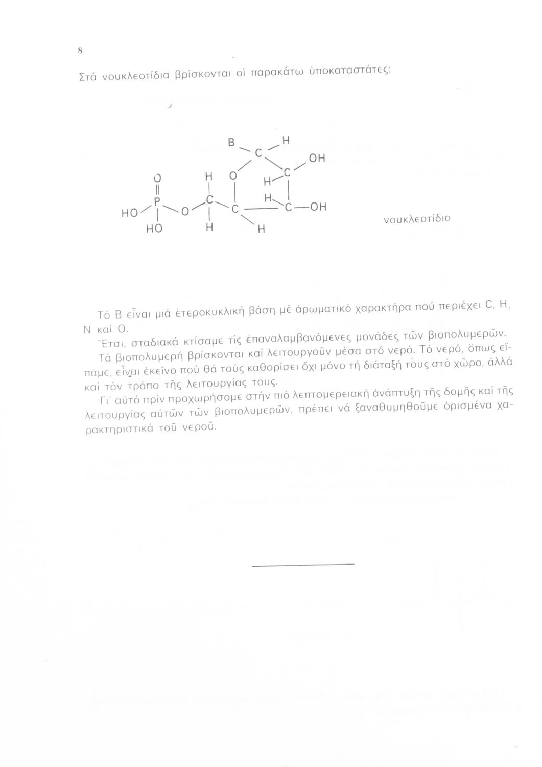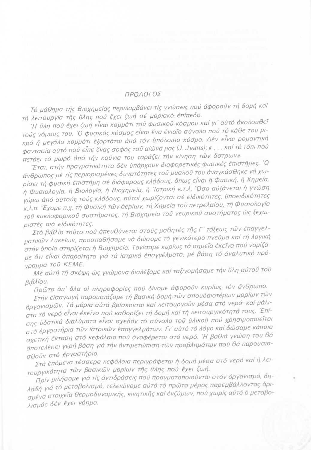 Σχολικό εγχειρίδιο Βιοχημείας της Γ' τάξης Μέσων Τεχνικών και Επαγγελματικών Σχολών το οποίο ασχολείται με τη δομή και τη λειτουργία της ύλης που έχει ζωή σε μοριακό επίπεδο εστιάζοντας στην ανάλυση του νερού.