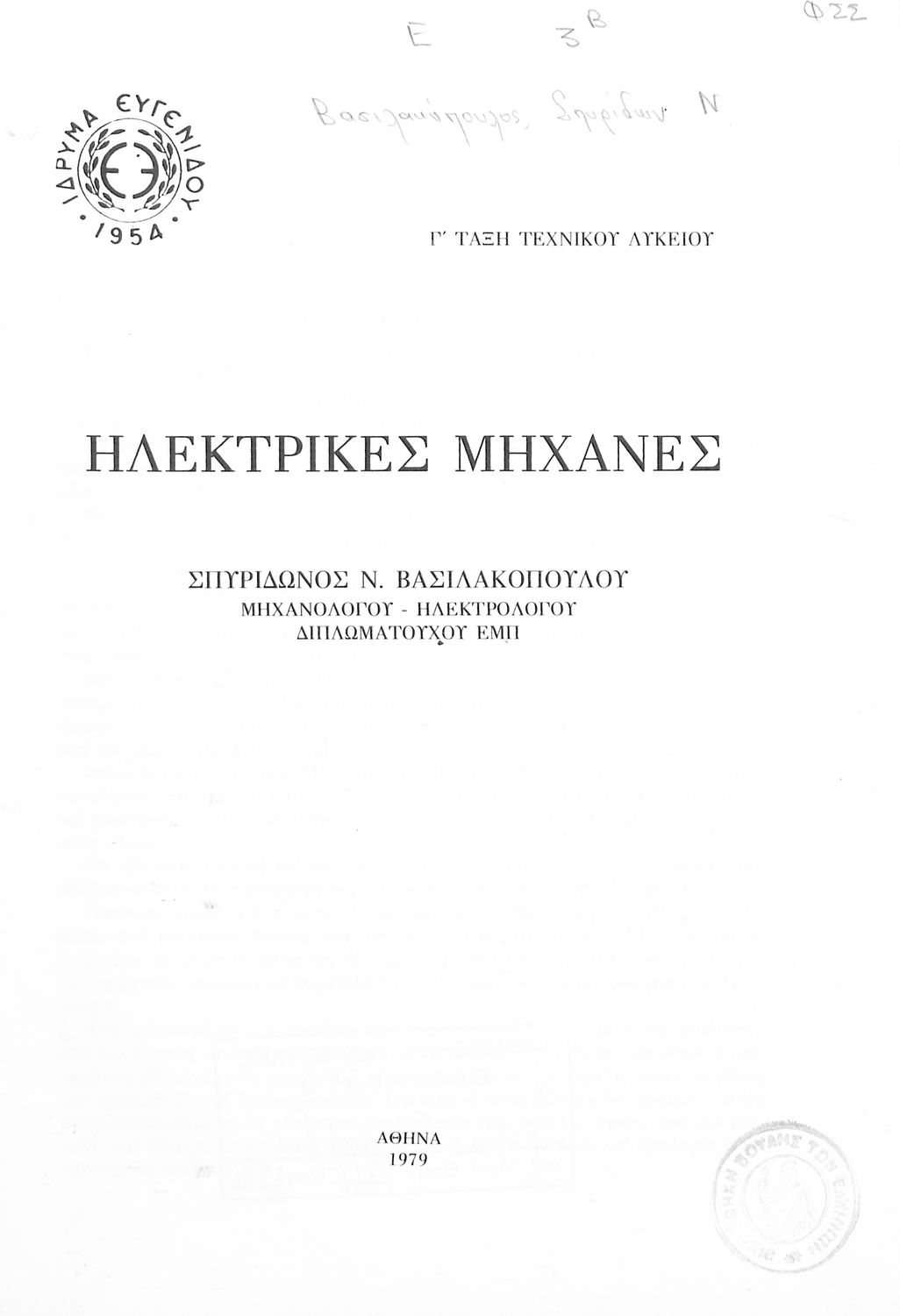 Βαθμίδα εκπαίδευσης: Δευτεροβάθμια Τάξη: Γ' Τεχνικού Λυκείου Μάθημα: Ηλεκτρολογική Μηχανική Γλώσσα: Δημοτική Παρουσίαση περιεχομένου: Σχολικό εγχειρίδιο Μηχανικής Γ' Τεχνικού Λυκείου που παρουσιάζει τις βασικές αρχές λειτουργίας των γεννητριών και των κινητήρων, και εστιάζει τους μετασχηματιστές, τους μετατροπείς και τους ανορθωτές. |