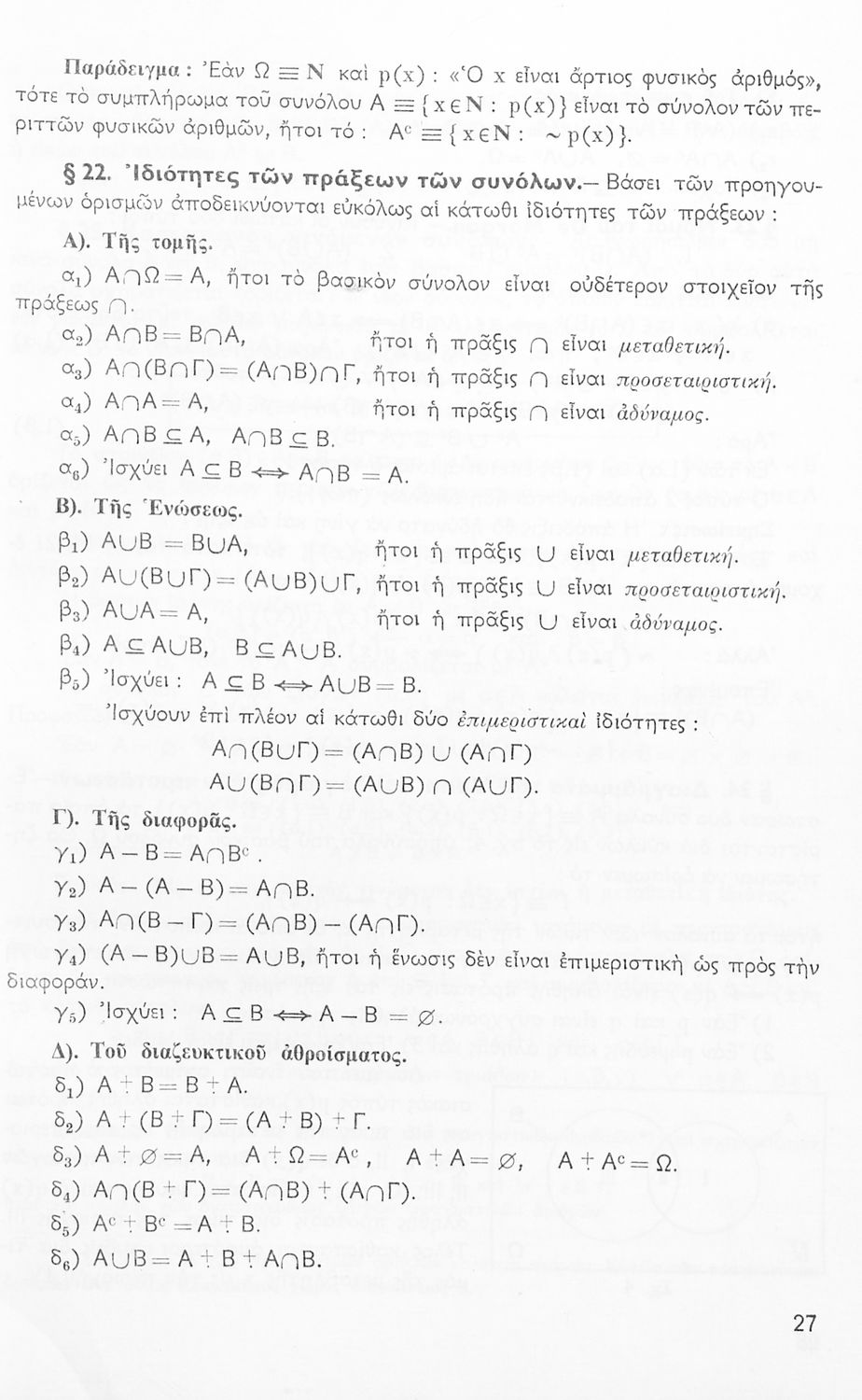 Σχολικό εγχειρίδιο Μαθηματικών Ε' Γυμνασίου που εστιάζει στη θεωρίας των συνόλων, τα ακέραια πολυώνυμα, τους πραγματικούς αριθμούς και τις πιθανότητες. Φέρει το σύμβολο της δικτατορίας.