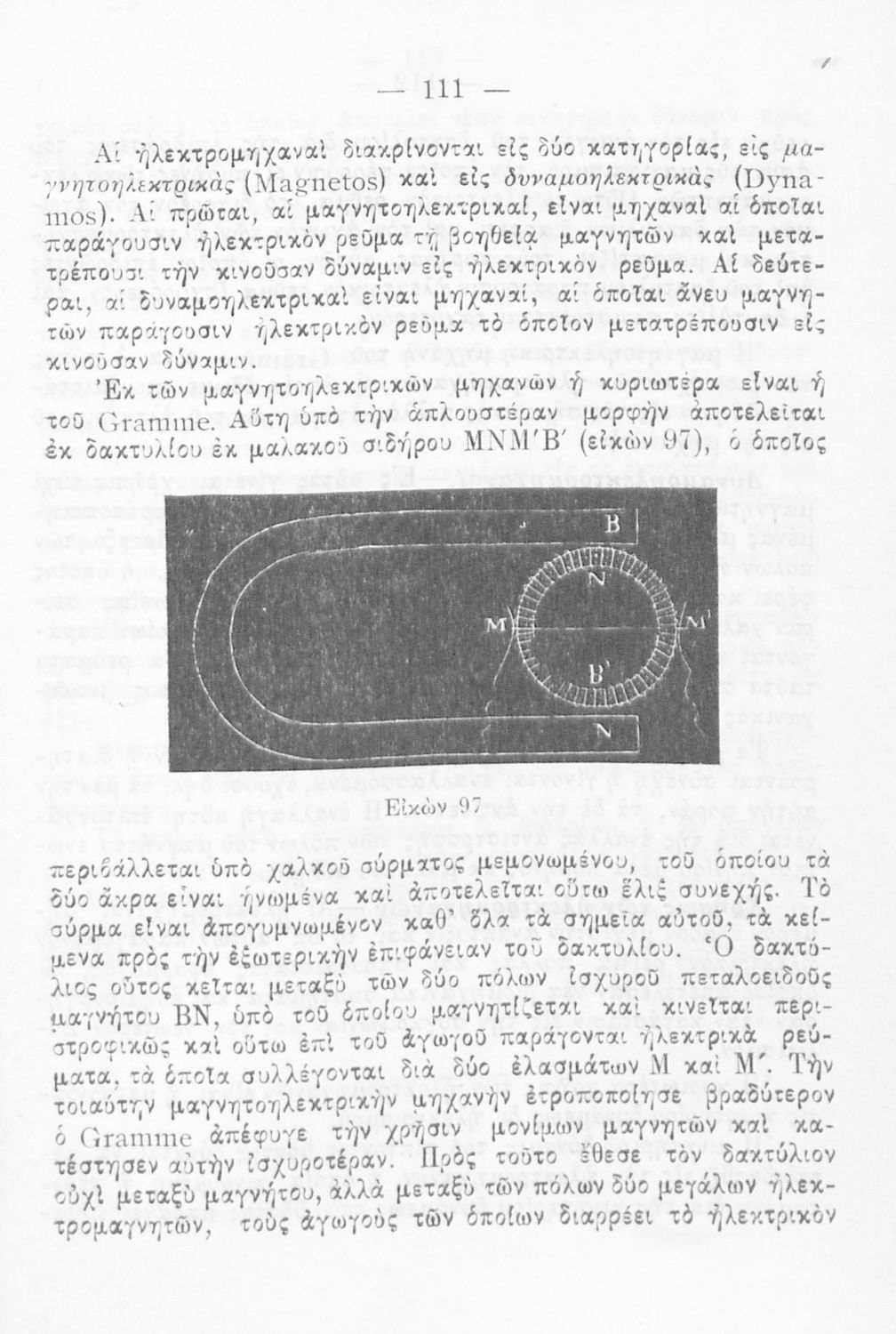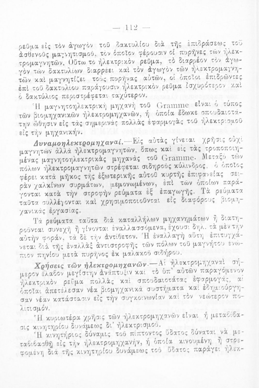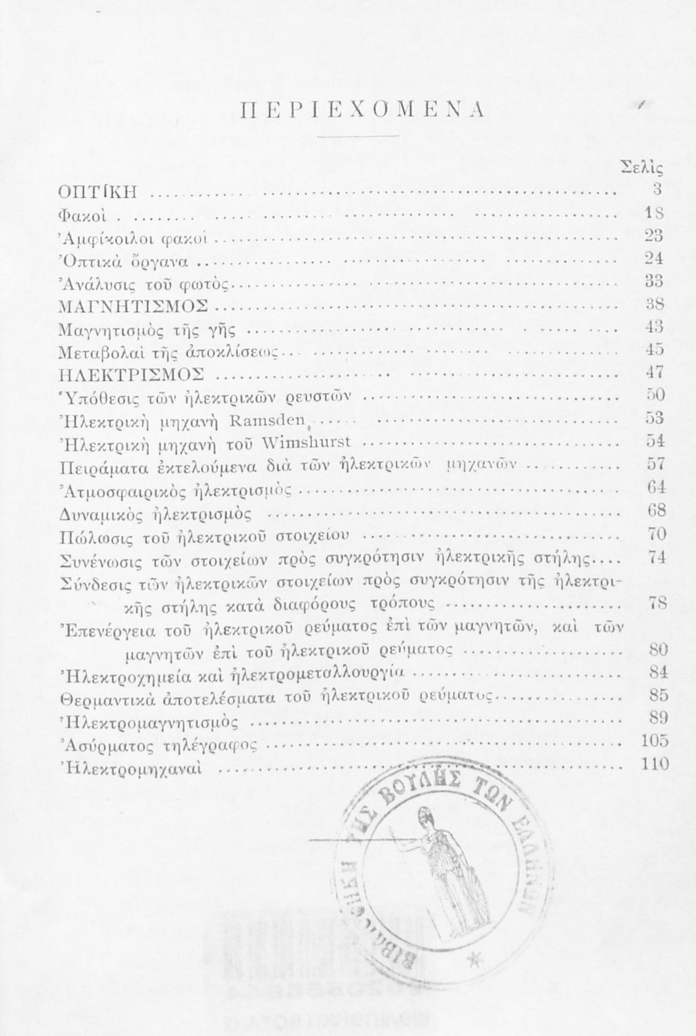 Σχολικό εγχειρίδιο των εμπορικών και πρακτικών σχολών για το μάθημα της Φυσικής. Το εγχειρίδιο περιλαμβάνει τις βασικές θεματικές και έννοιες της οπτικής, του μαγνητισμού και του ηλεκτρισμού, καθώς επίσης και την καθημερινή εφαρμογή τους σε καθημερινά αντικείμενα (ηλεκτρικές μηχανές, ασύρματος τηλέγραφος κ.α.).
