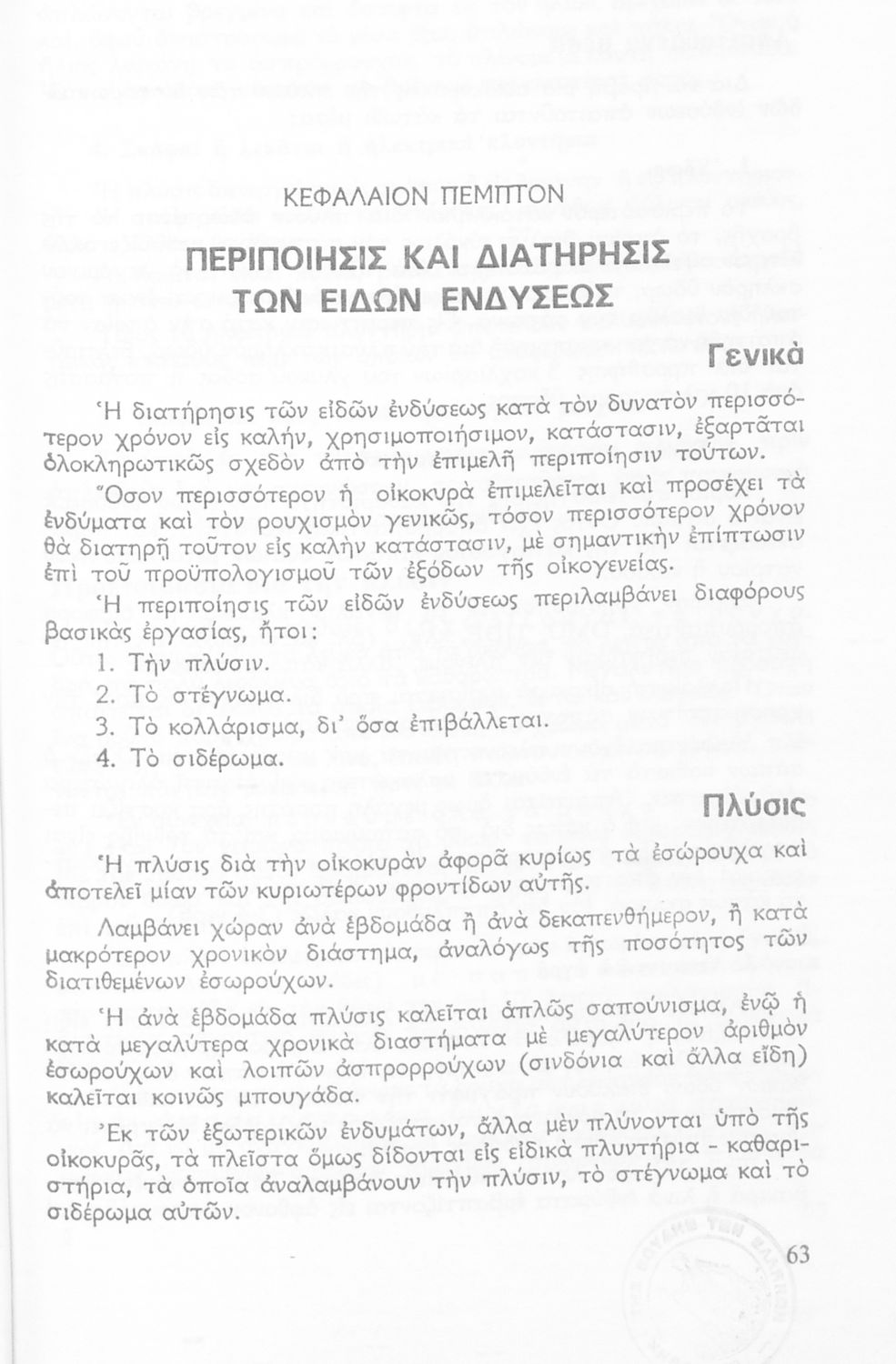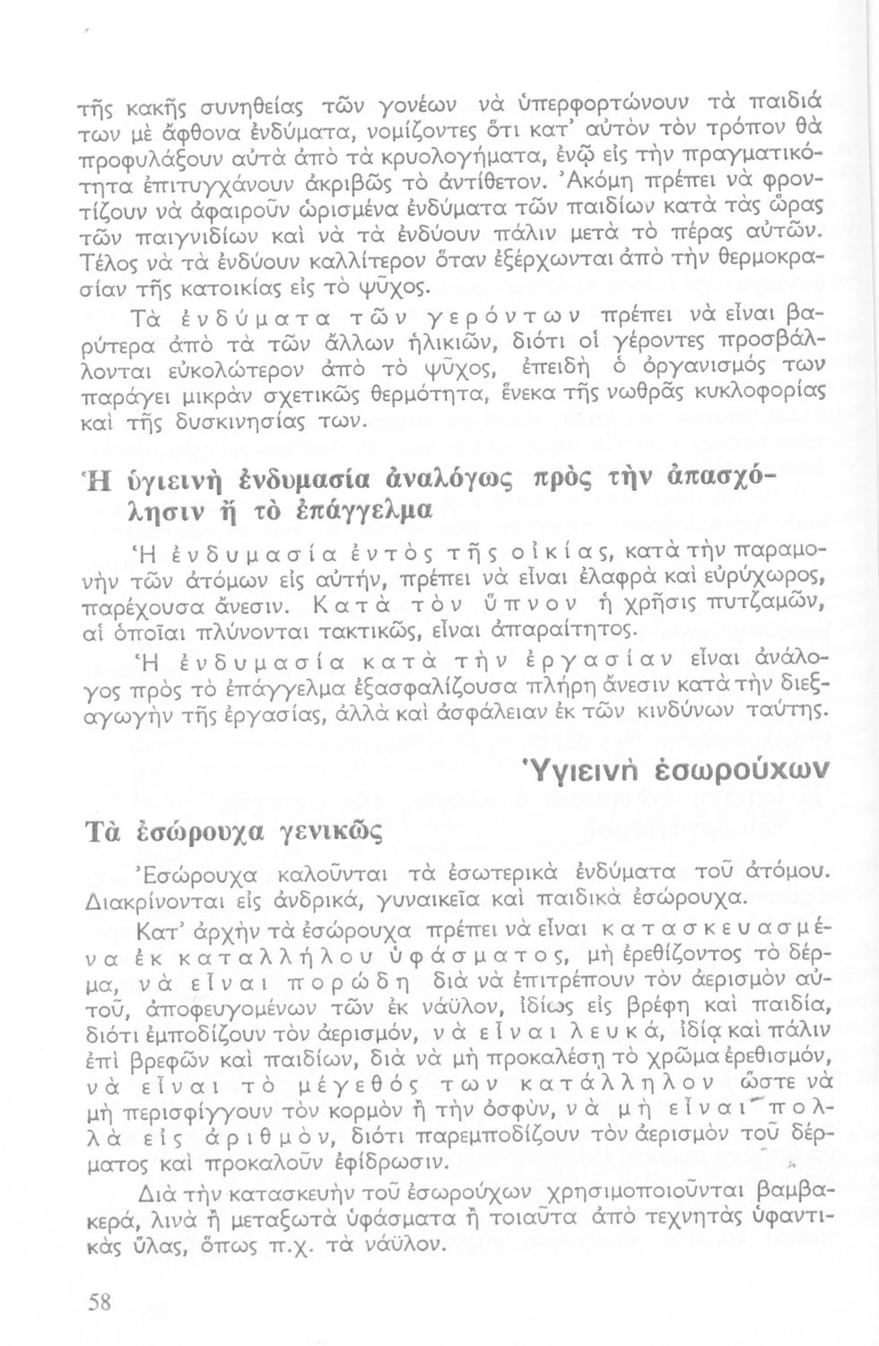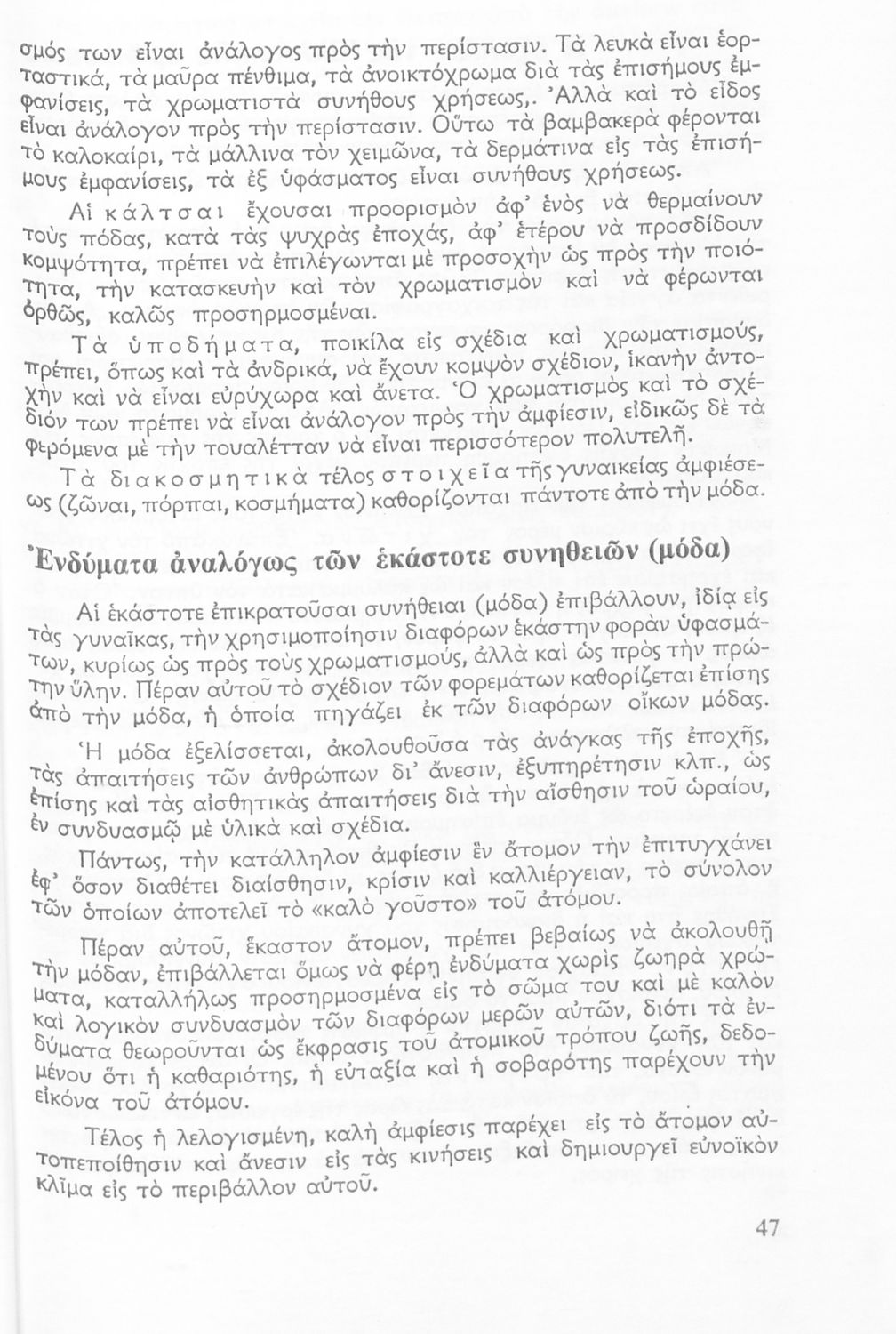 520 ## _aΣχολικό εγχειρίδιο Οικοκυρικών της Α' Γυμνασίου. Το βιβλίο αποτελεί μια εισαγωγή στην ένδυση. Στο πρώτο μέρος γίνεται αναφορά στον αισθητικό τομέα, στις χρήσεις, στα ζητήματα υγιεινής και ενδυμασίας και τέλος στην περιποίηση και στη διατήρηση των ρούχων όπως σιδέρωμα και πλύσιμο. Στο δεύτερο μέρος, το βιβλίο παραθέτει πρακτικά θέματα και τεχνικές της ένδυσης όπως ραπτική, πλεκτική, και κεντητική.