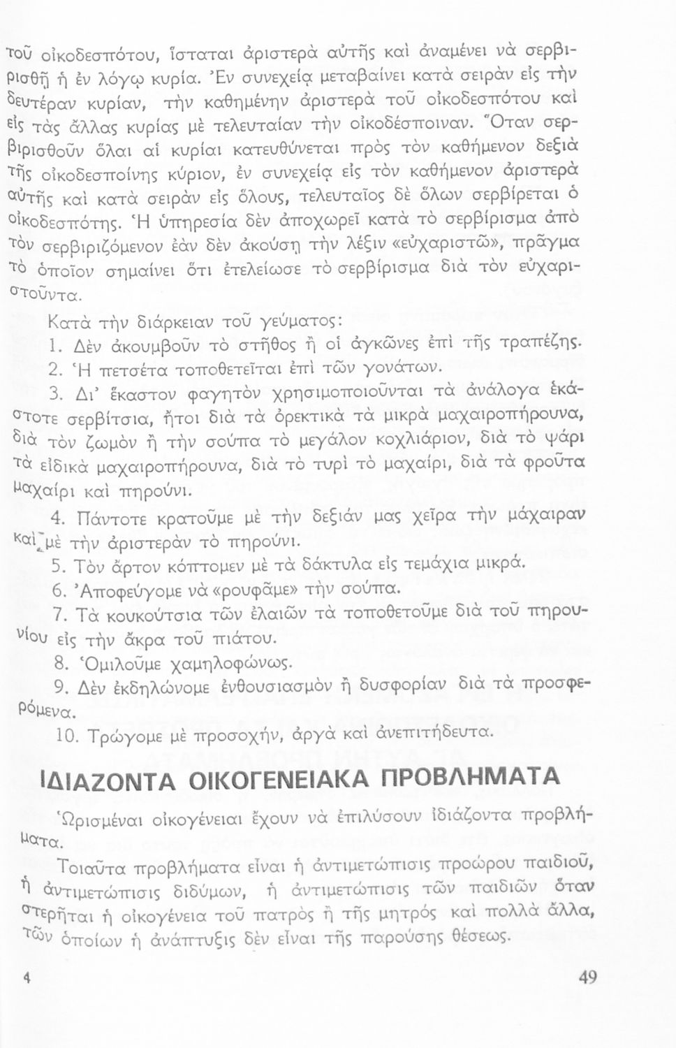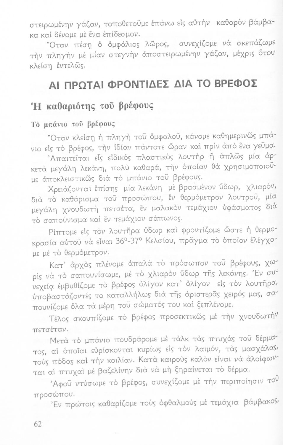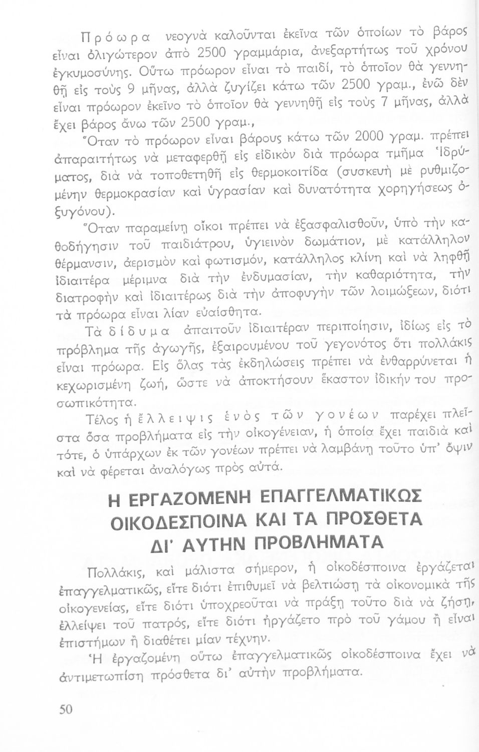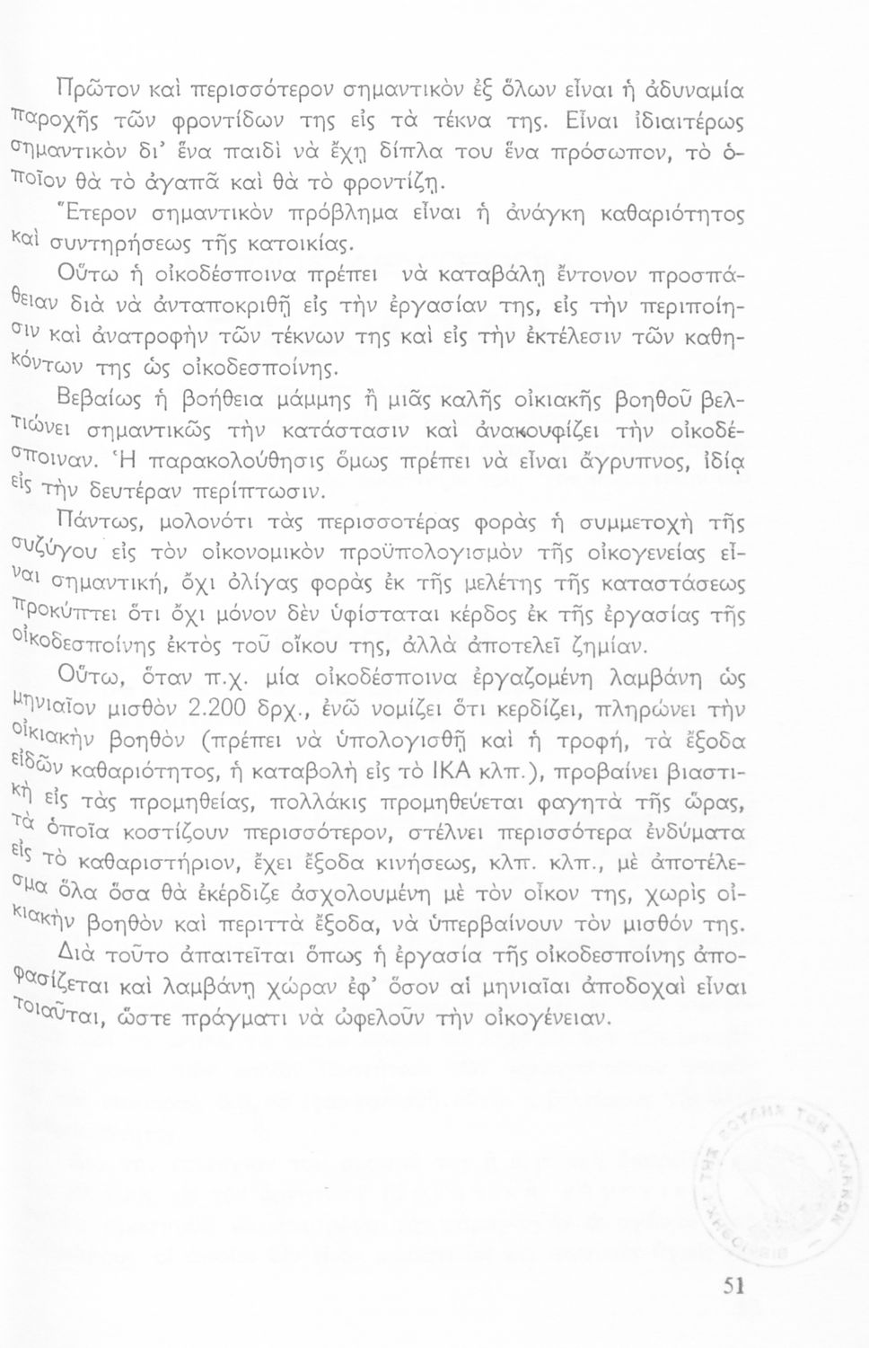 Σχολικό εγχειρίδιο της Ε΄ Τάξης του Γυμνασίου Θηλέων για το μάθημα των Οικοκυρικών. Αναφέρεται στο θεσμό της οικογένειας, τους ρόλους και τις αρμοδιότητες κάθε μέλους της. Συνεχίζει με την παιδοκομία, βρεφοκομία αναφέρεται από τον τοκετό, τη γέννηση και την ανατροφή του βρέφους, την ανάπτυξή του και τις παιδικές ασθένειες κ.α.