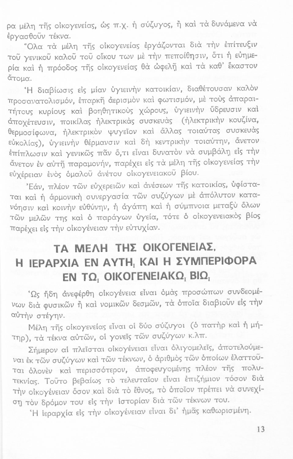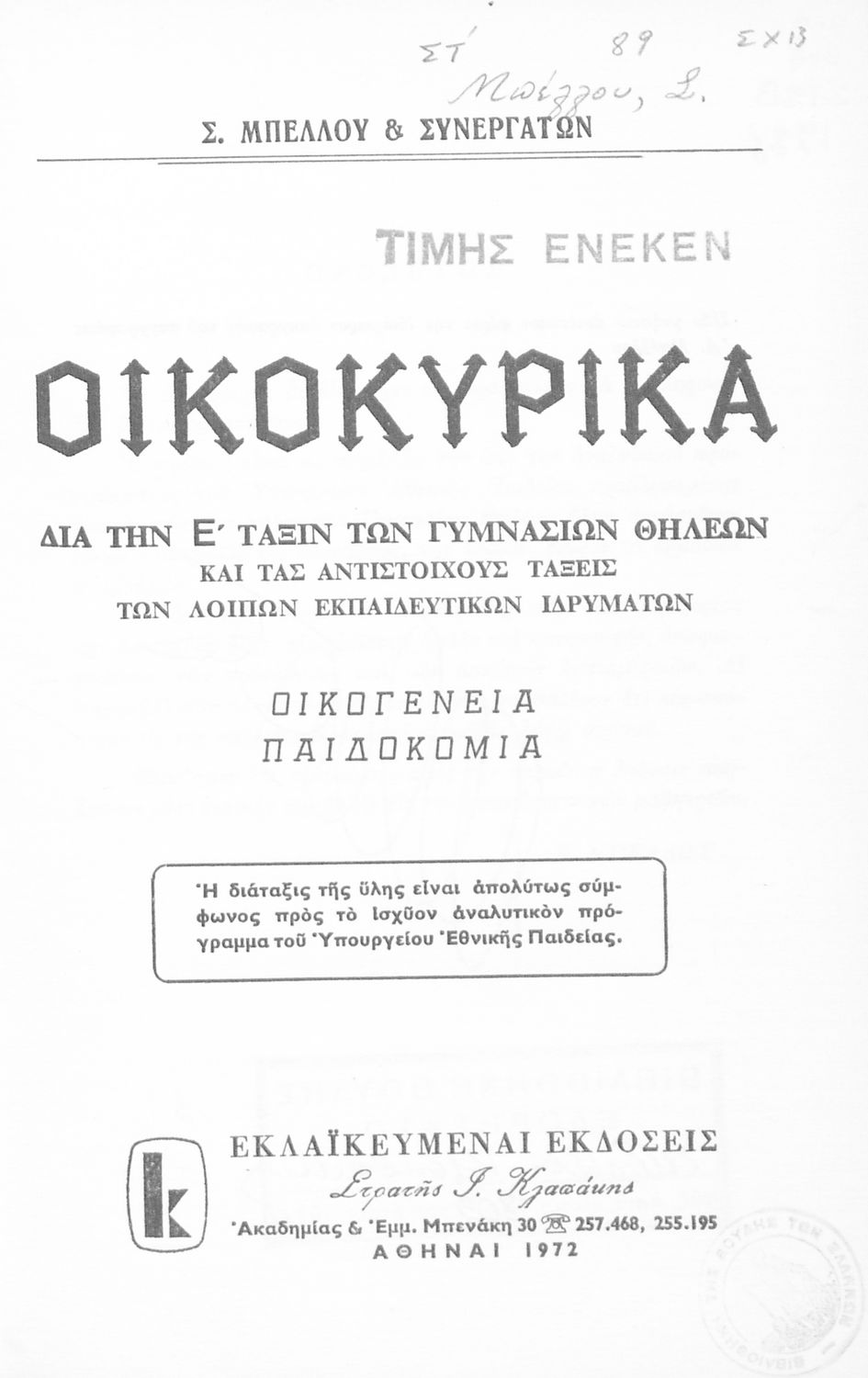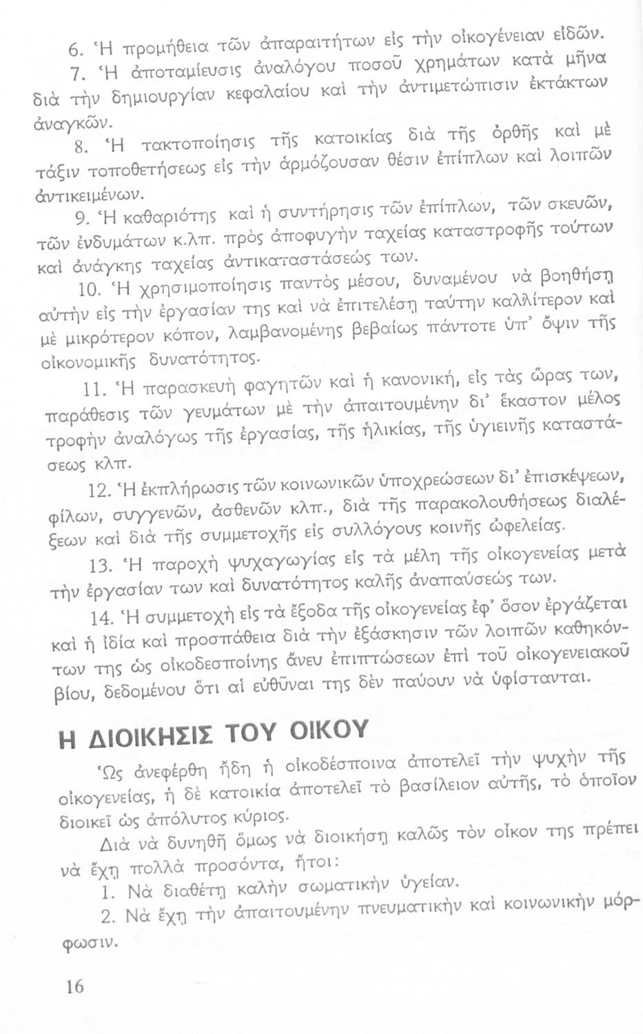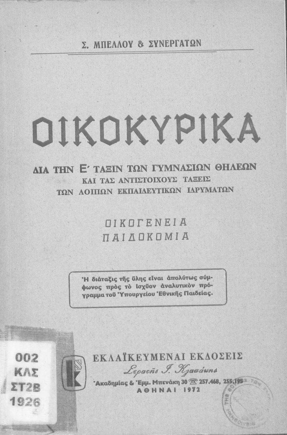 Σχολικό εγχειρίδιο της Ε΄ Τάξης του Γυμνασίου Θηλέων για το μάθημα των Οικοκυρικών. Αναφέρεται στο θεσμό της οικογένειας, τους ρόλους και τις αρμοδιότητες κάθε μέλους της. Συνεχίζει με την παιδοκομία, βρεφοκομία αναφέρεται από τον τοκετό, τη γέννηση και την ανατροφή του βρέφους, την ανάπτυξή του και τις παιδικές ασθένειες κ.α.